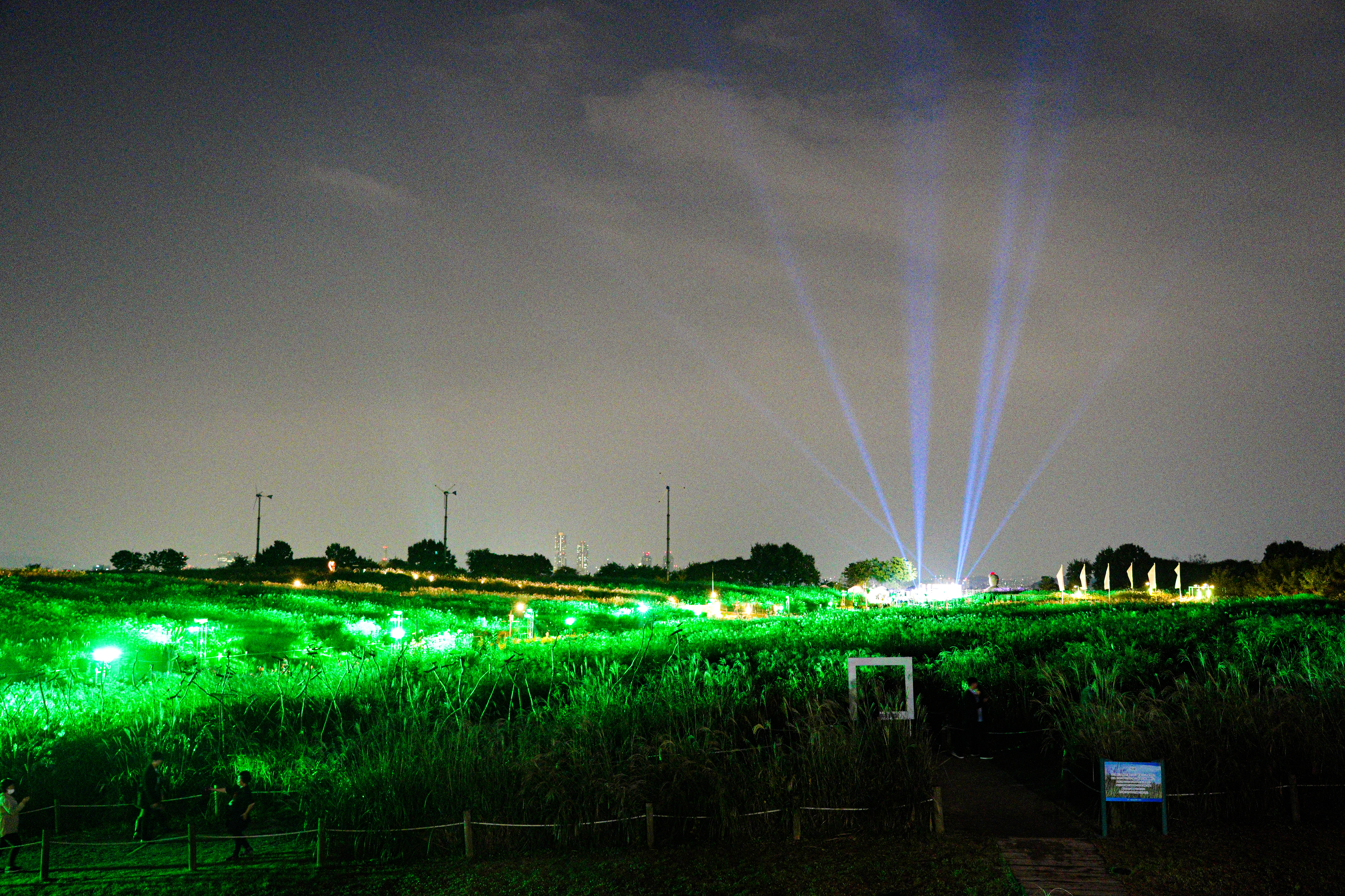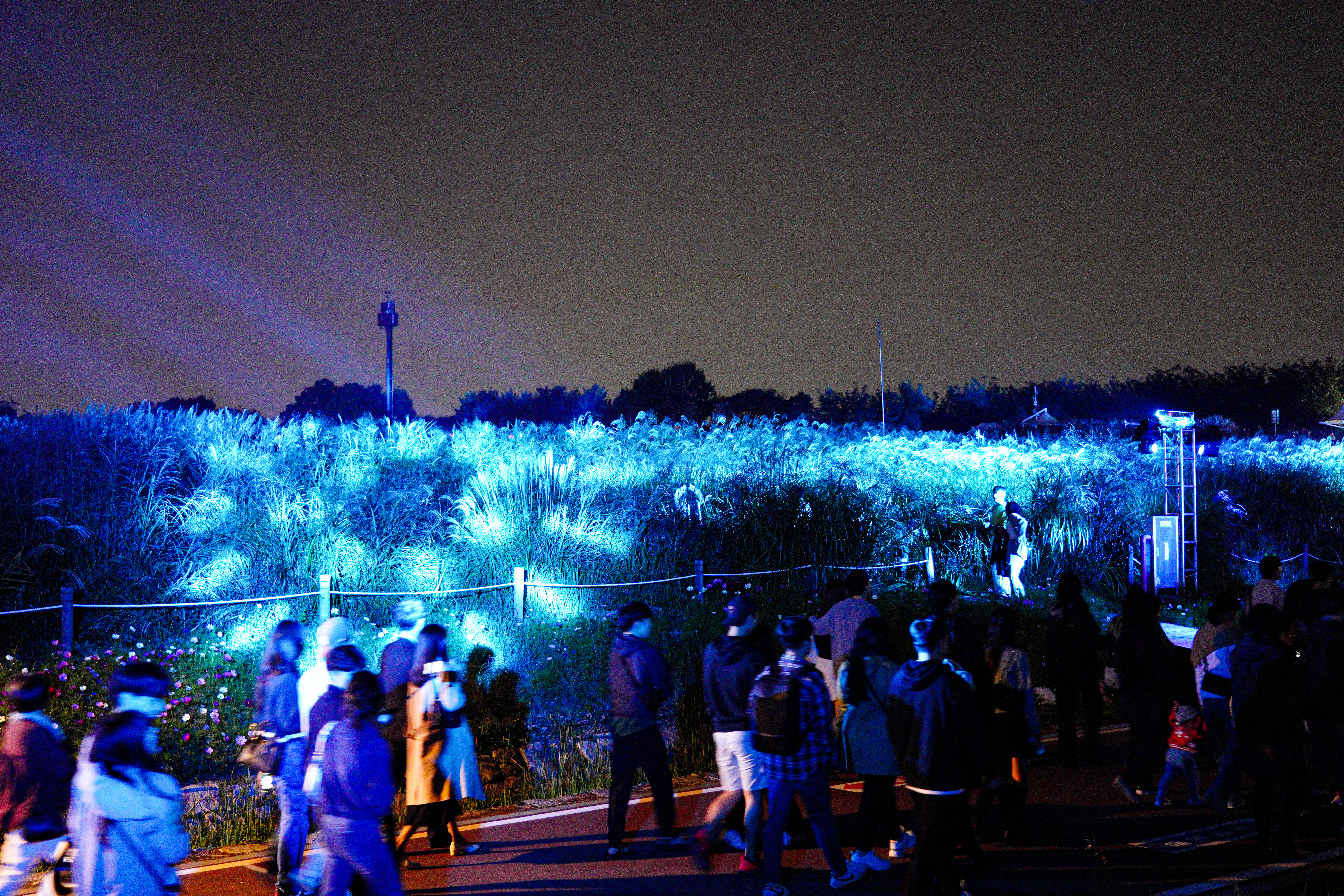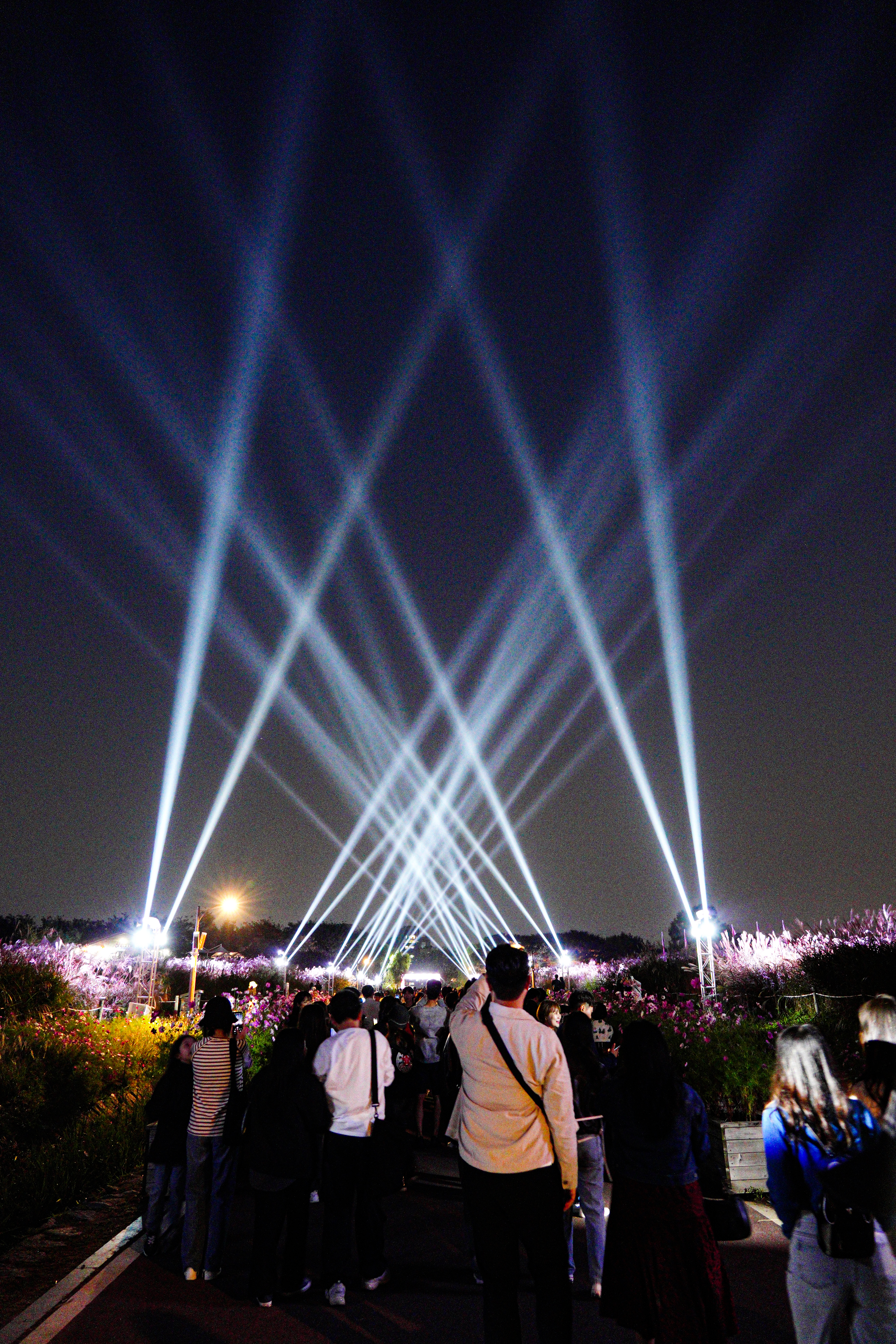 레이져 불빛쇼를 감상하는 많은 사람들.