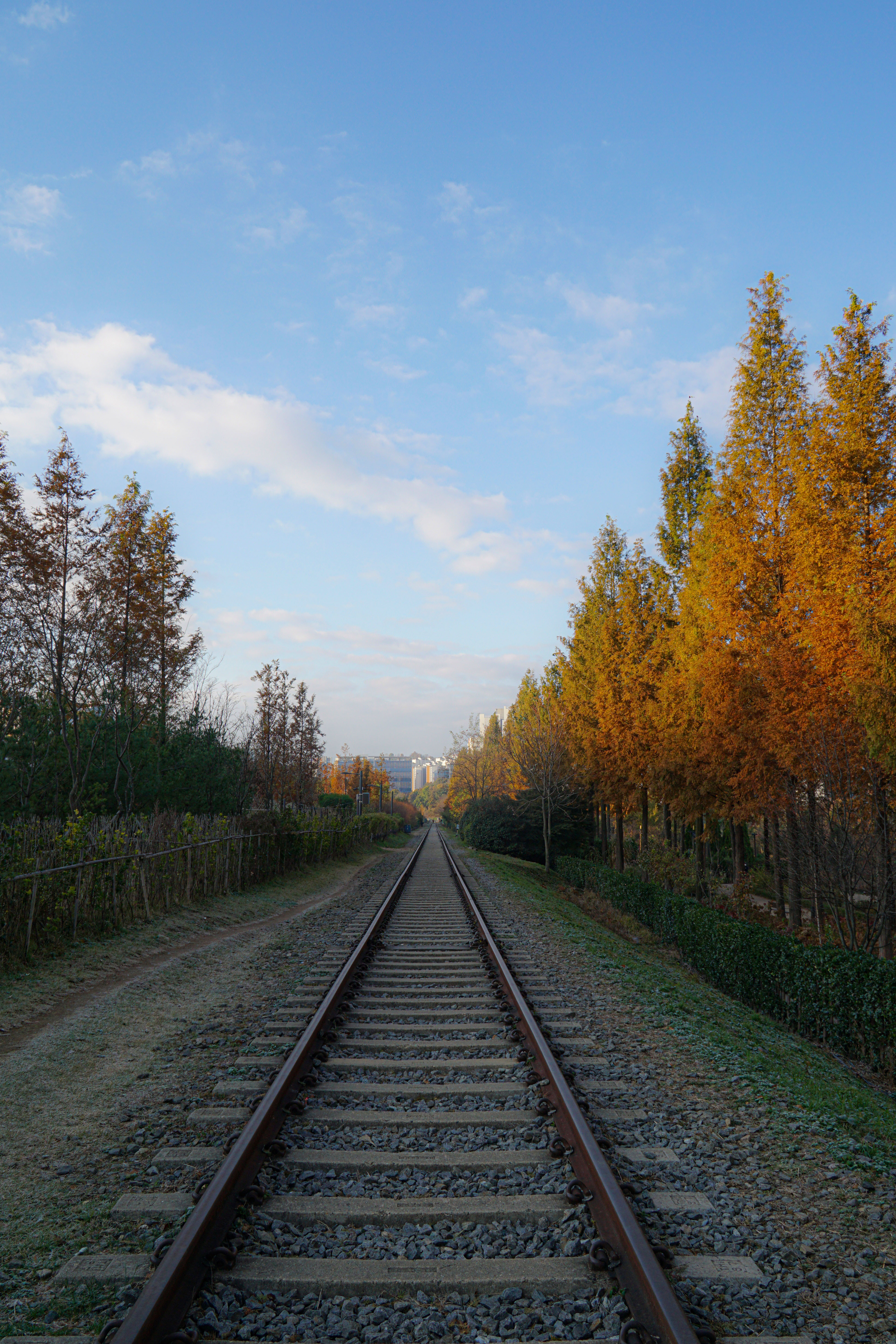 아침햇살이 메타세콰이어를 비추는 철길을 걸어본다.