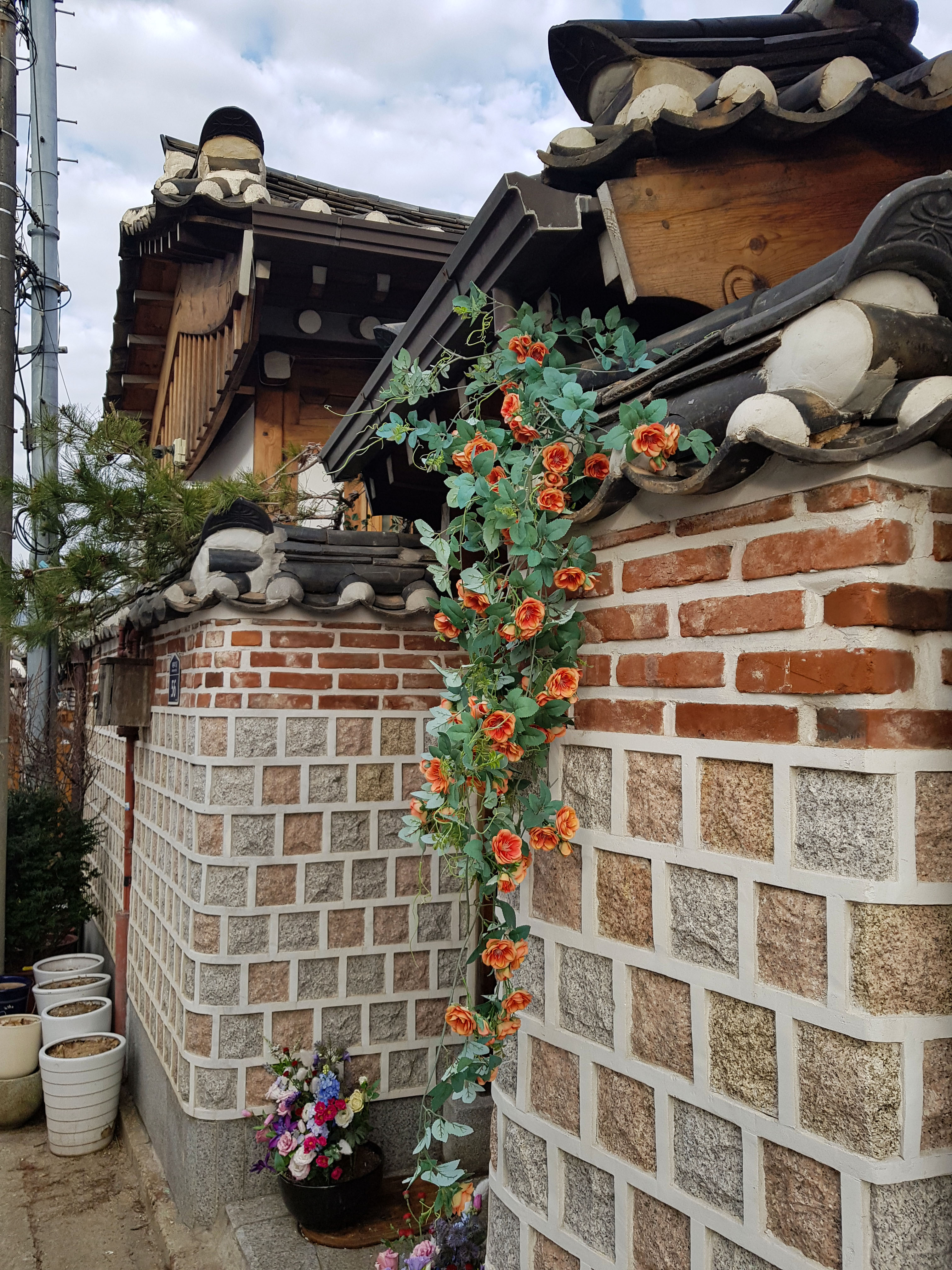 장미 조화지만 한옥하고 잘 어울린다.