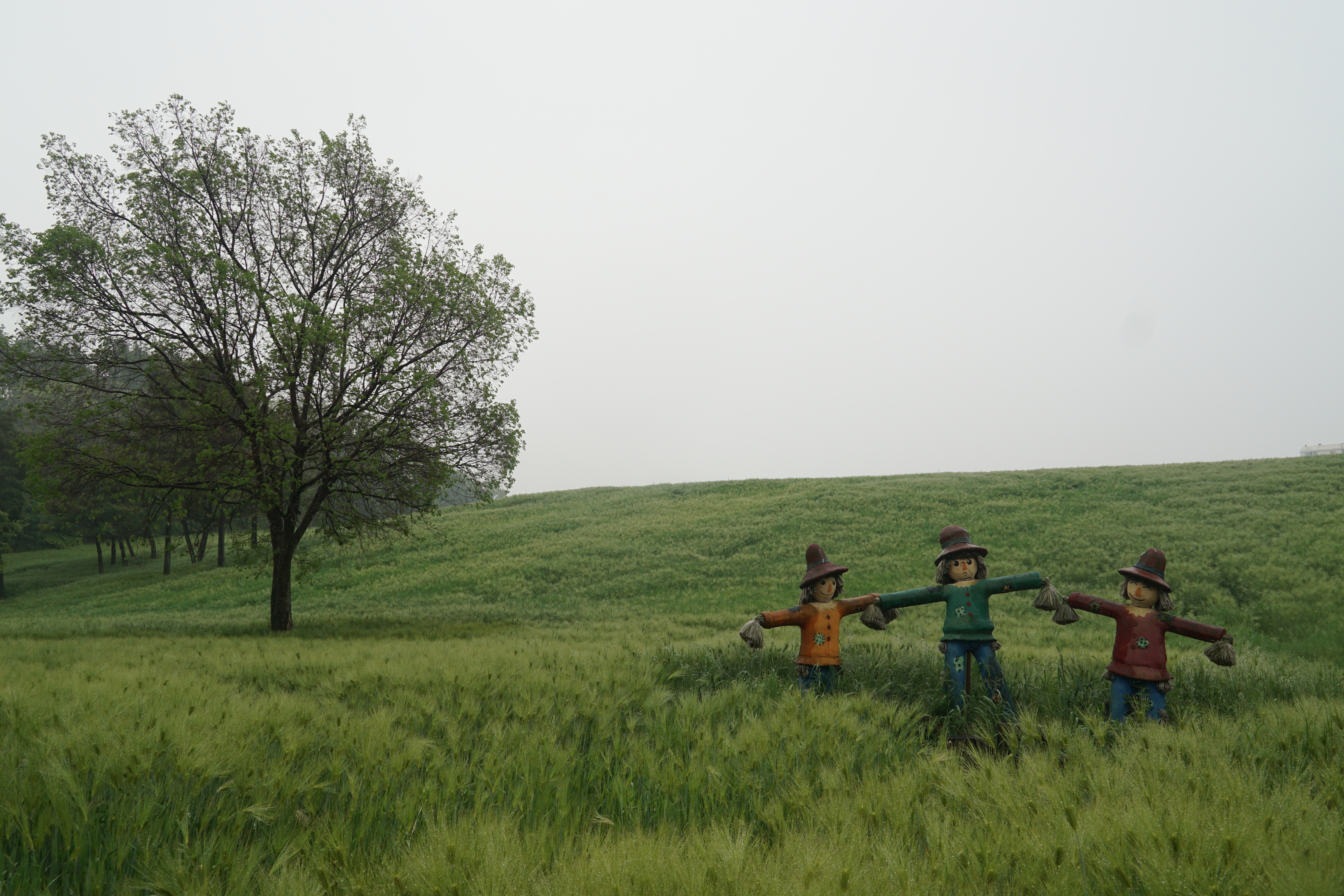 반대편으로 오면 보이는 나 홀로 나무와 청보리밭 지키는 허수아비.