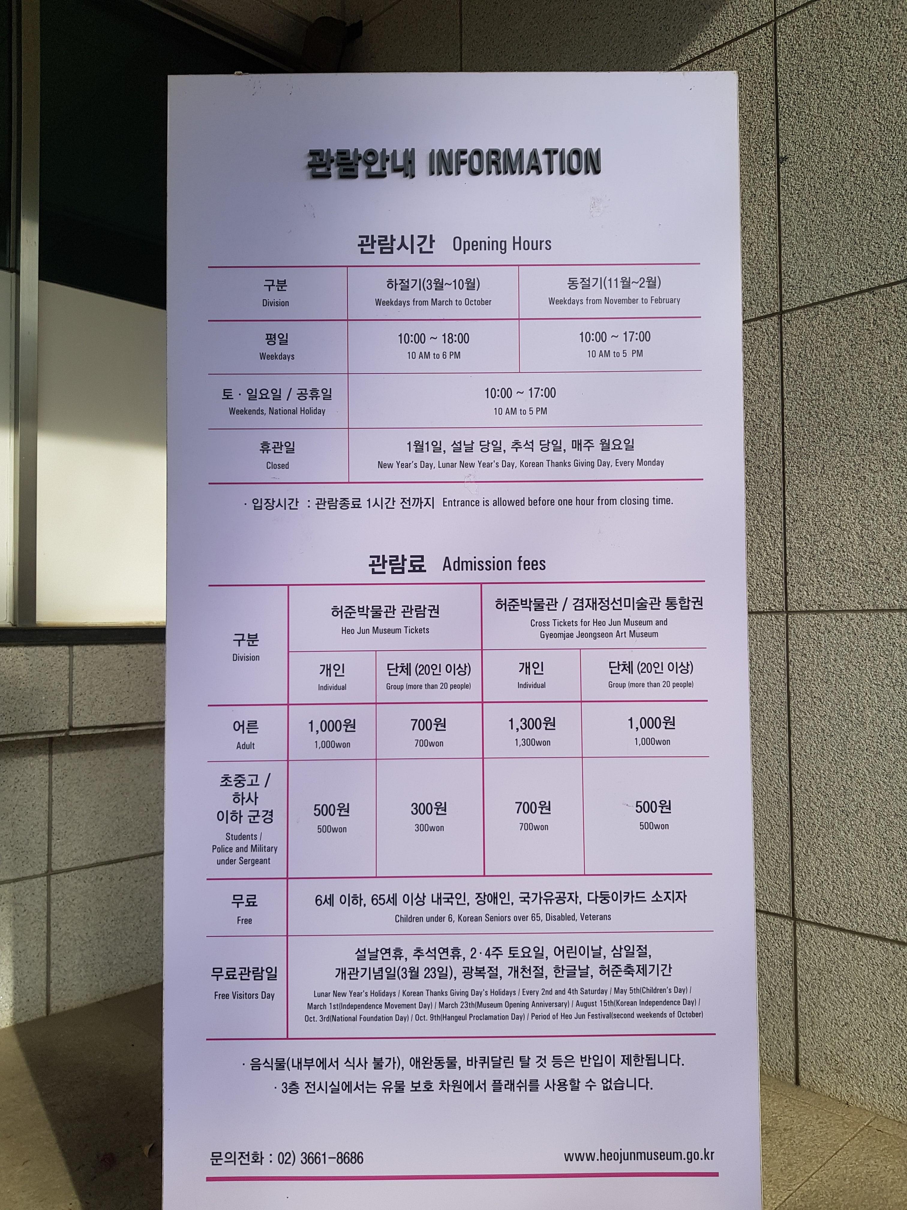 또한, 매주 월요일과 1월 1일, 설날 및 추석 당일은 휴관한다.
