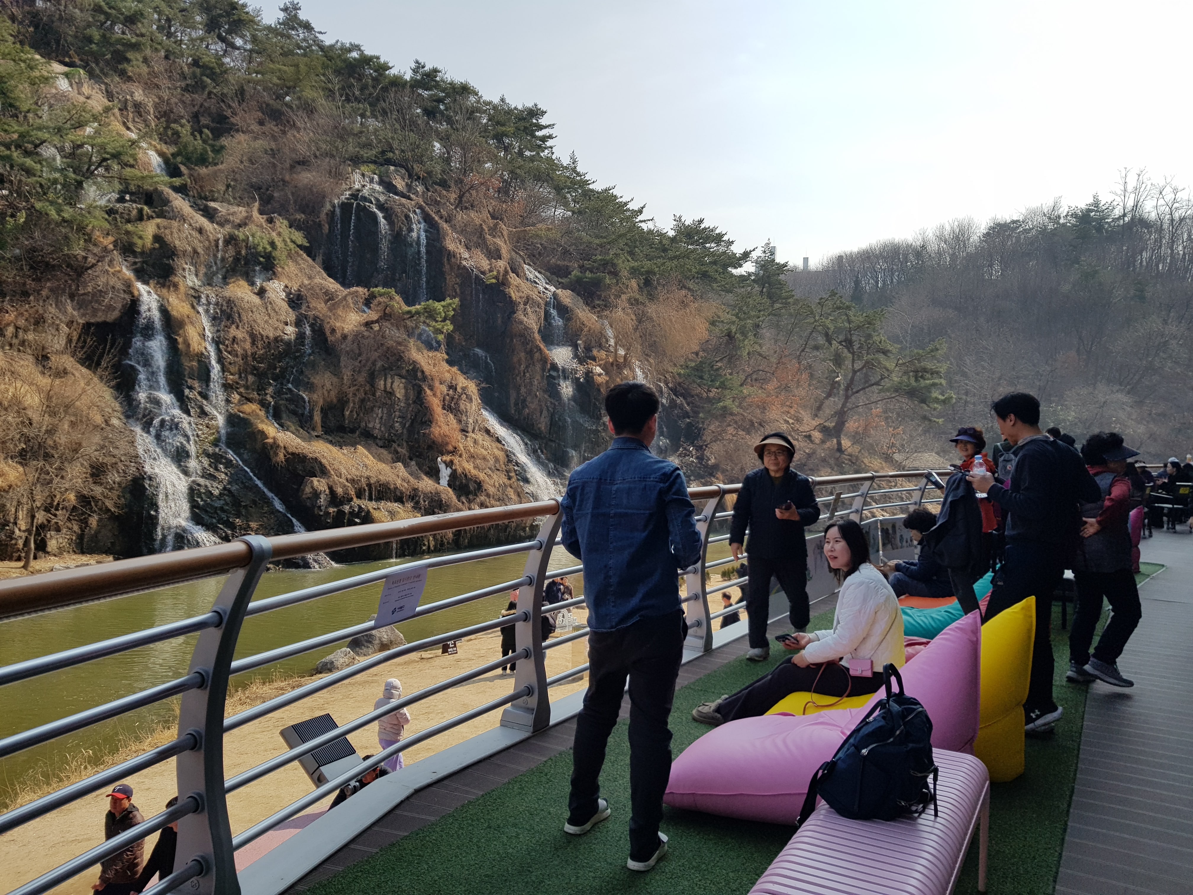 테라스에서 휴식 취하는 사람들과 폭포모습.