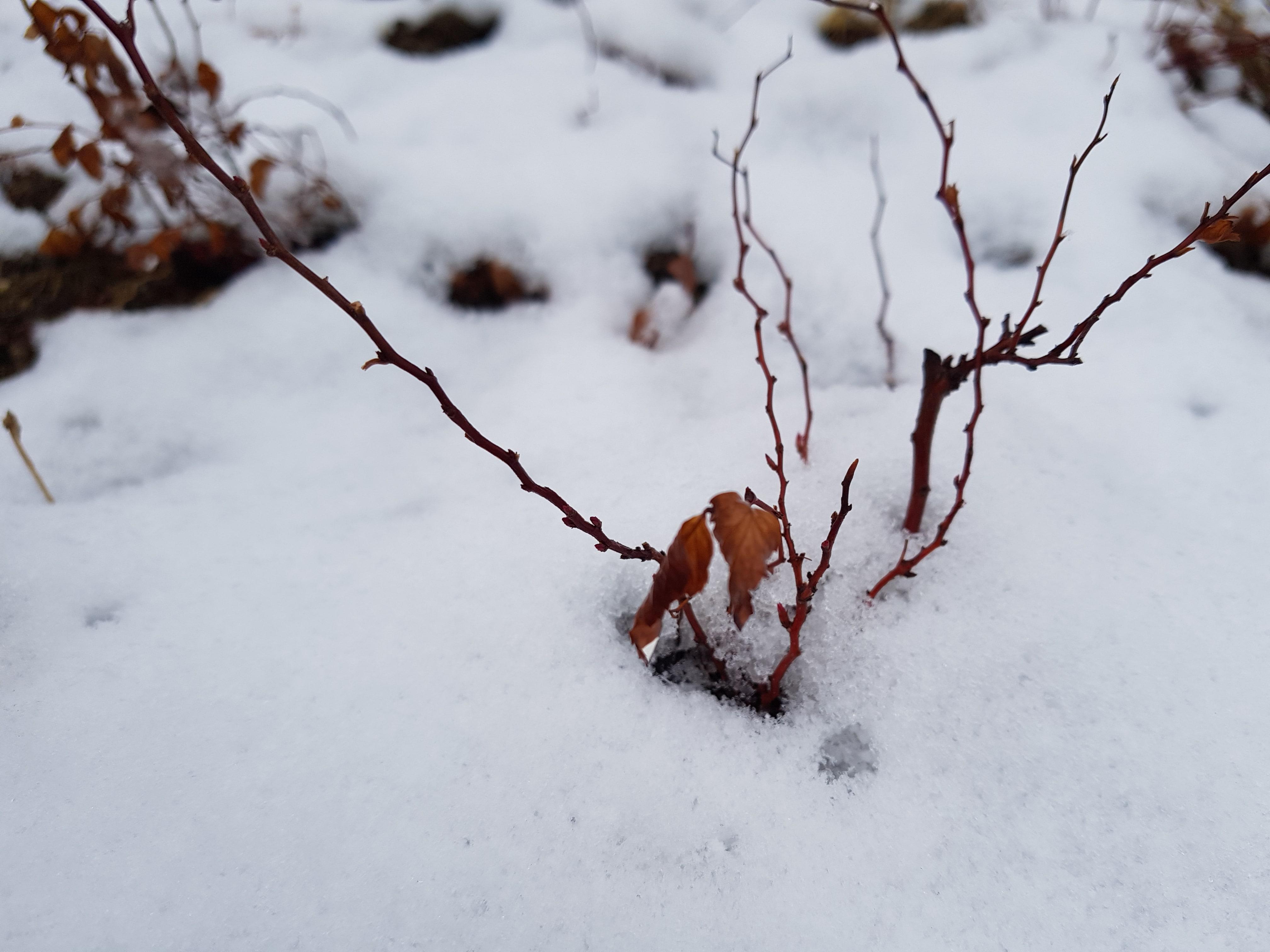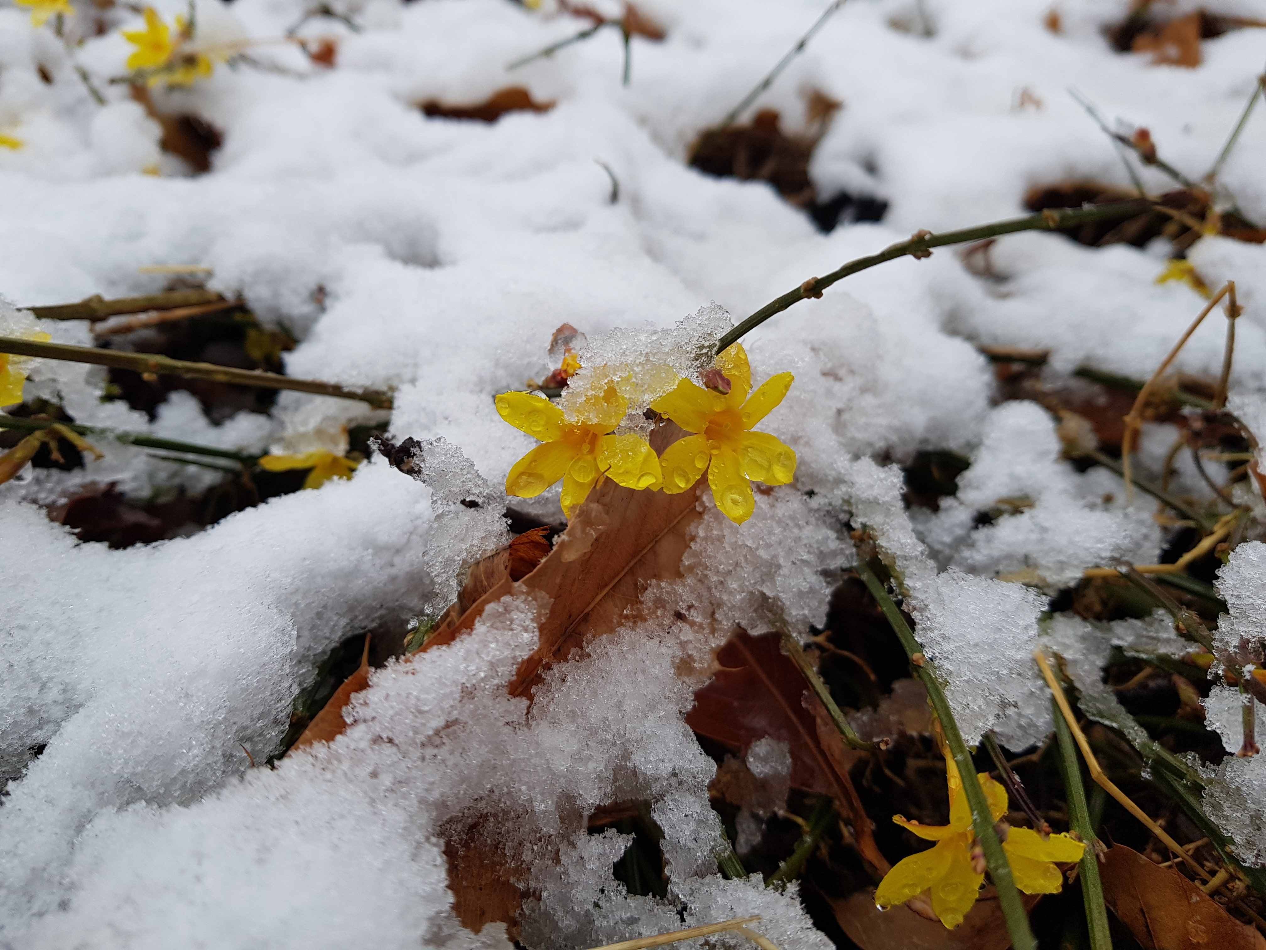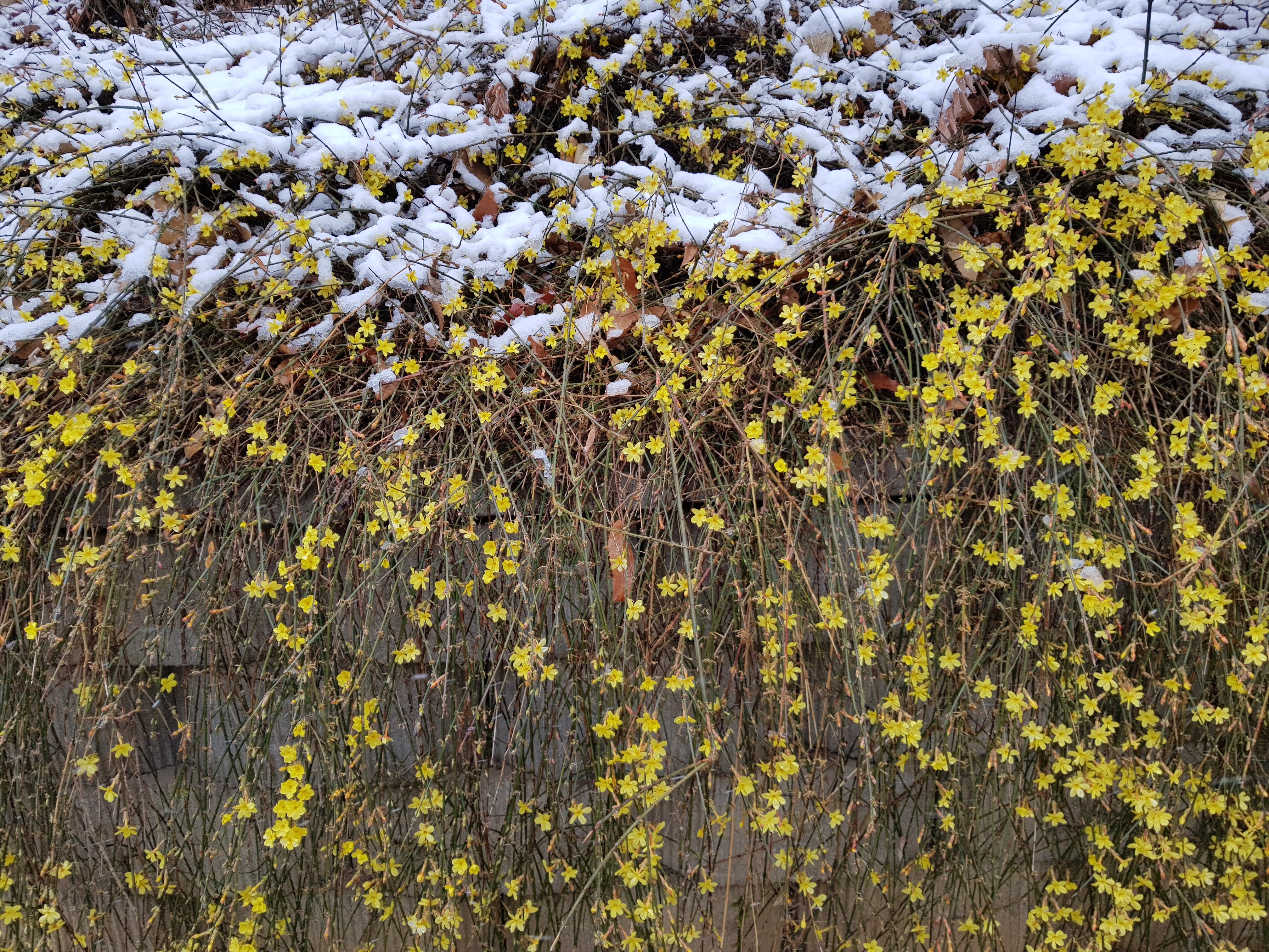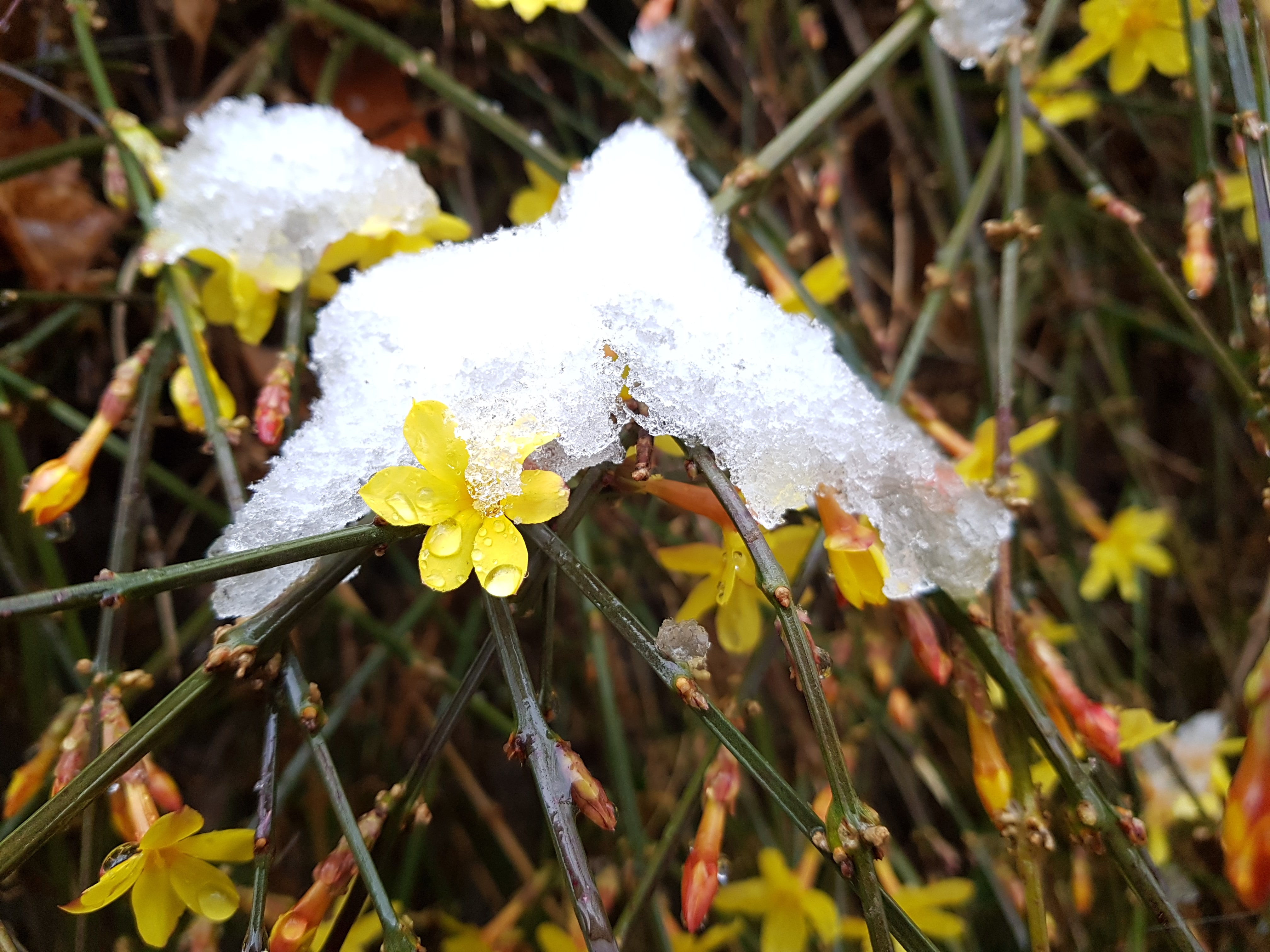 서서울 호수 공원에서 가장먼저 봄을 알리는 영춘화에도 눈이 쌓여있다.