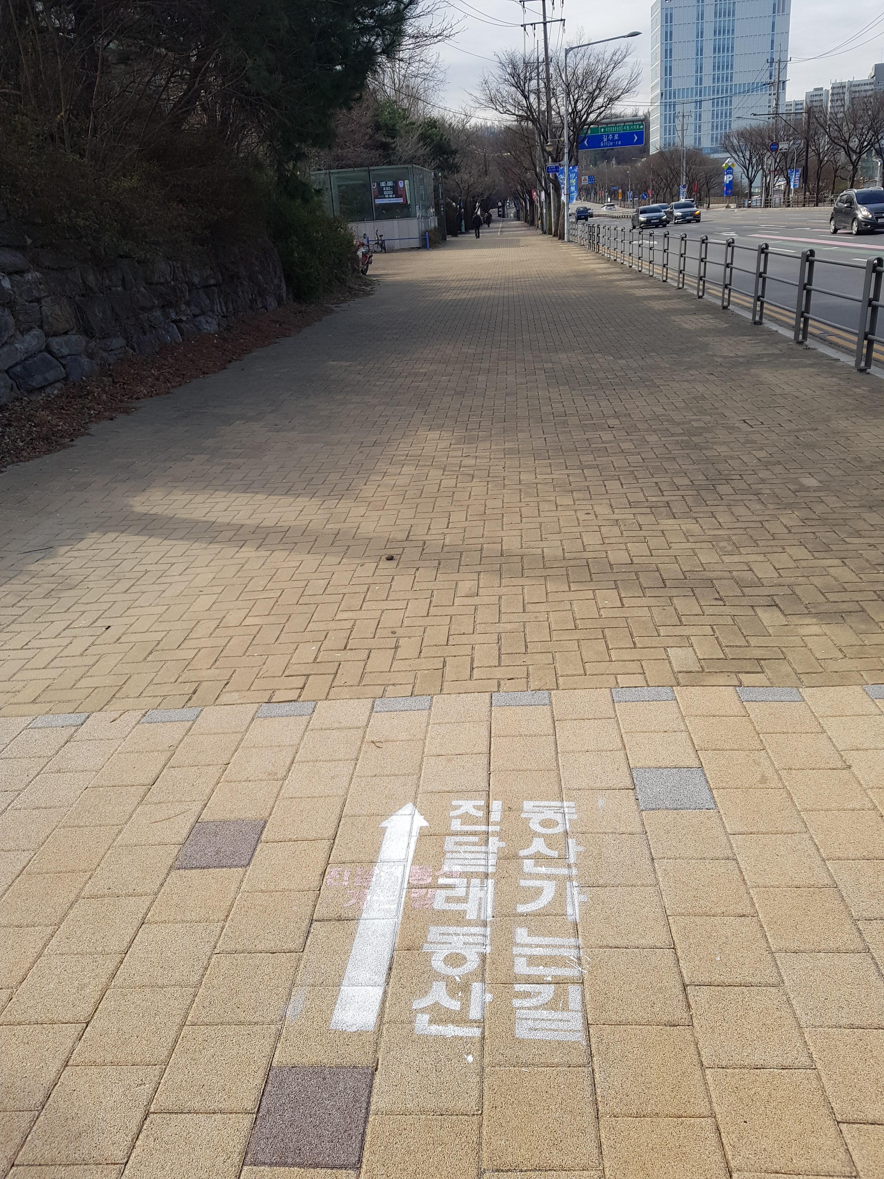 부천 종합운동장역 2번 출구로 나오면 바닥에 길을 알려주는 표시가 있다.