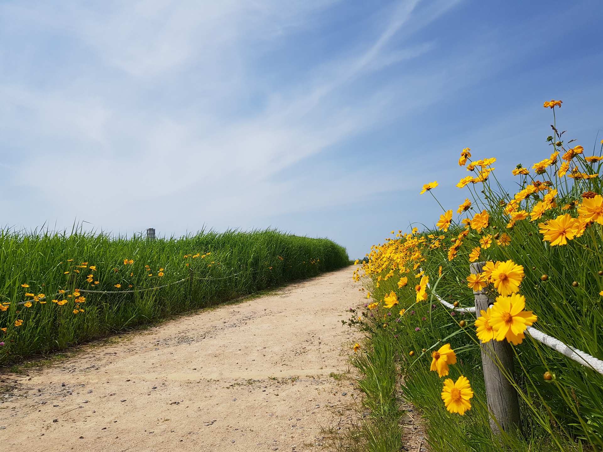 적당한 바람과 6월의 햇살 가득한 날 양옆으로 노란 금계국이 피어있는 길을 걸으니 기분이 좋아진다.