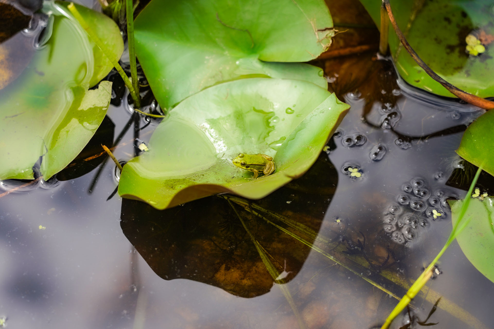 벌과 잠자리, 청개구리들이 휴식을 취하고 있다.