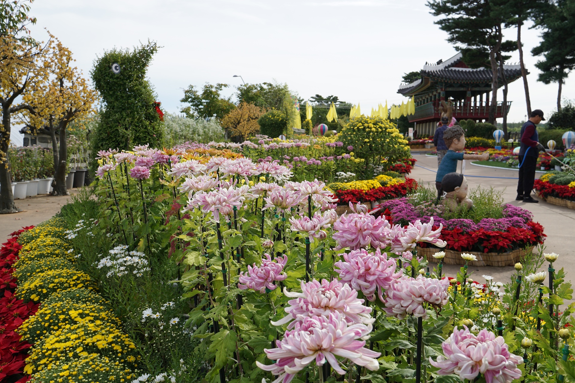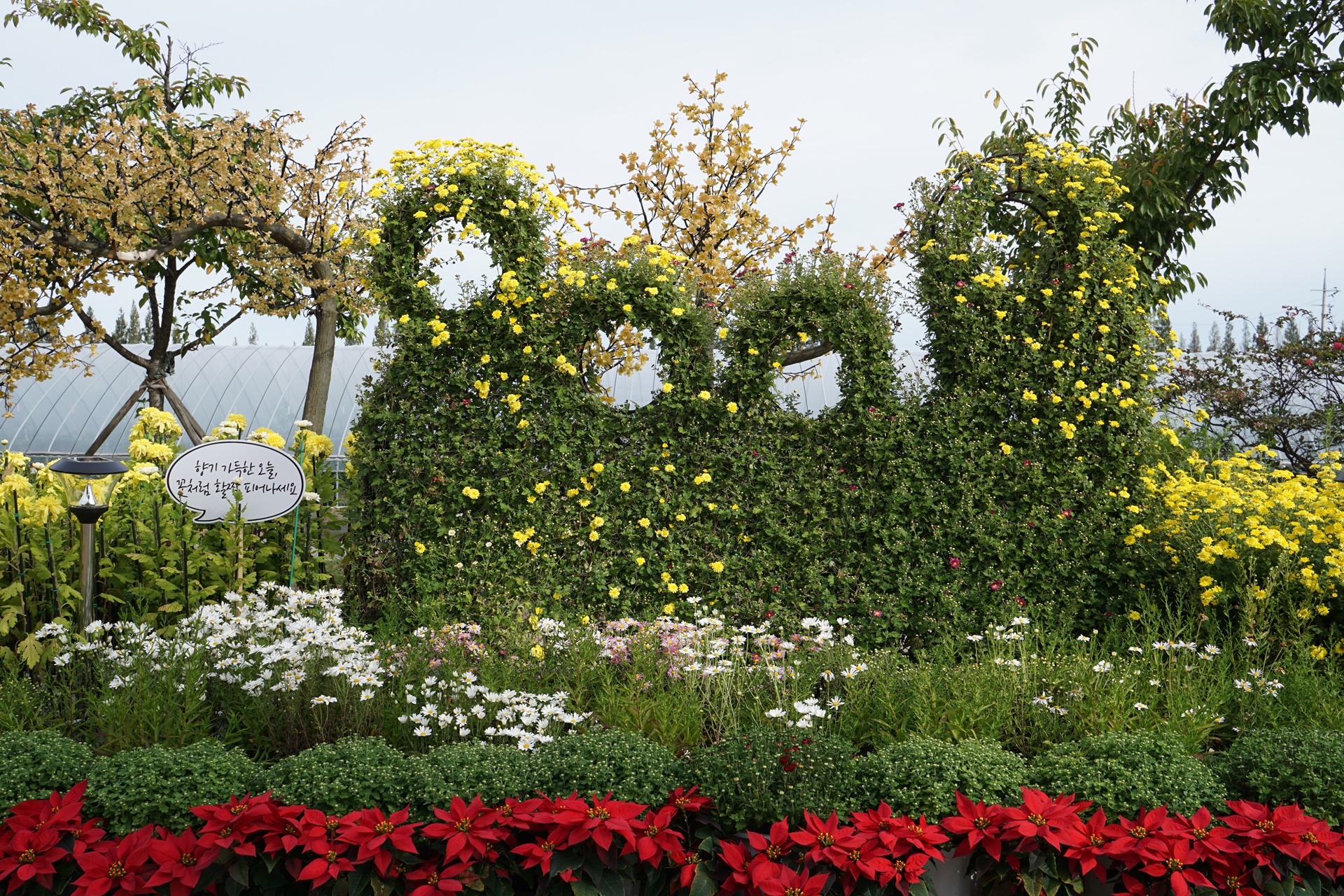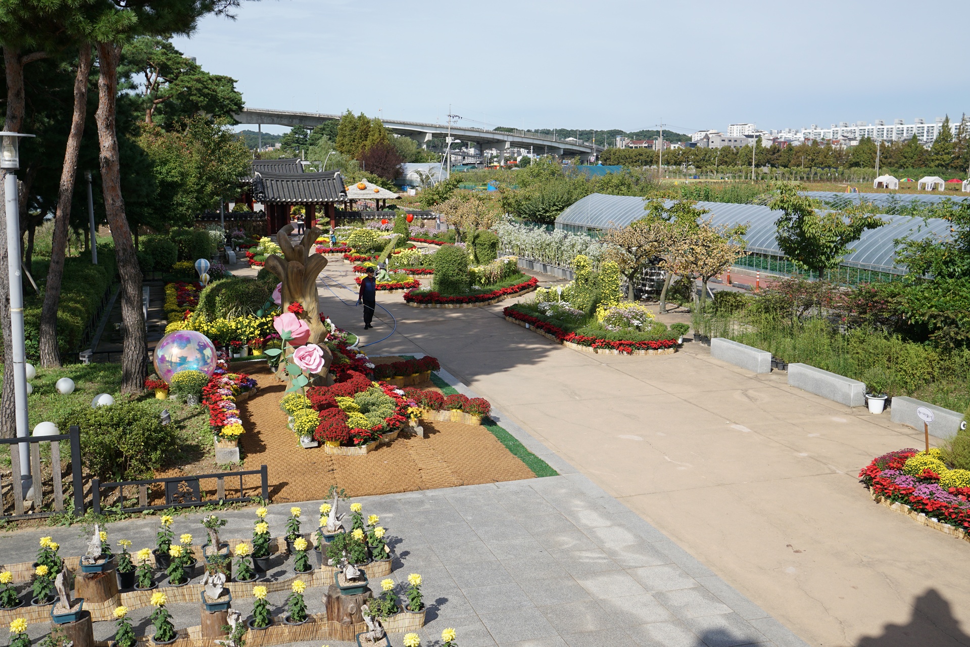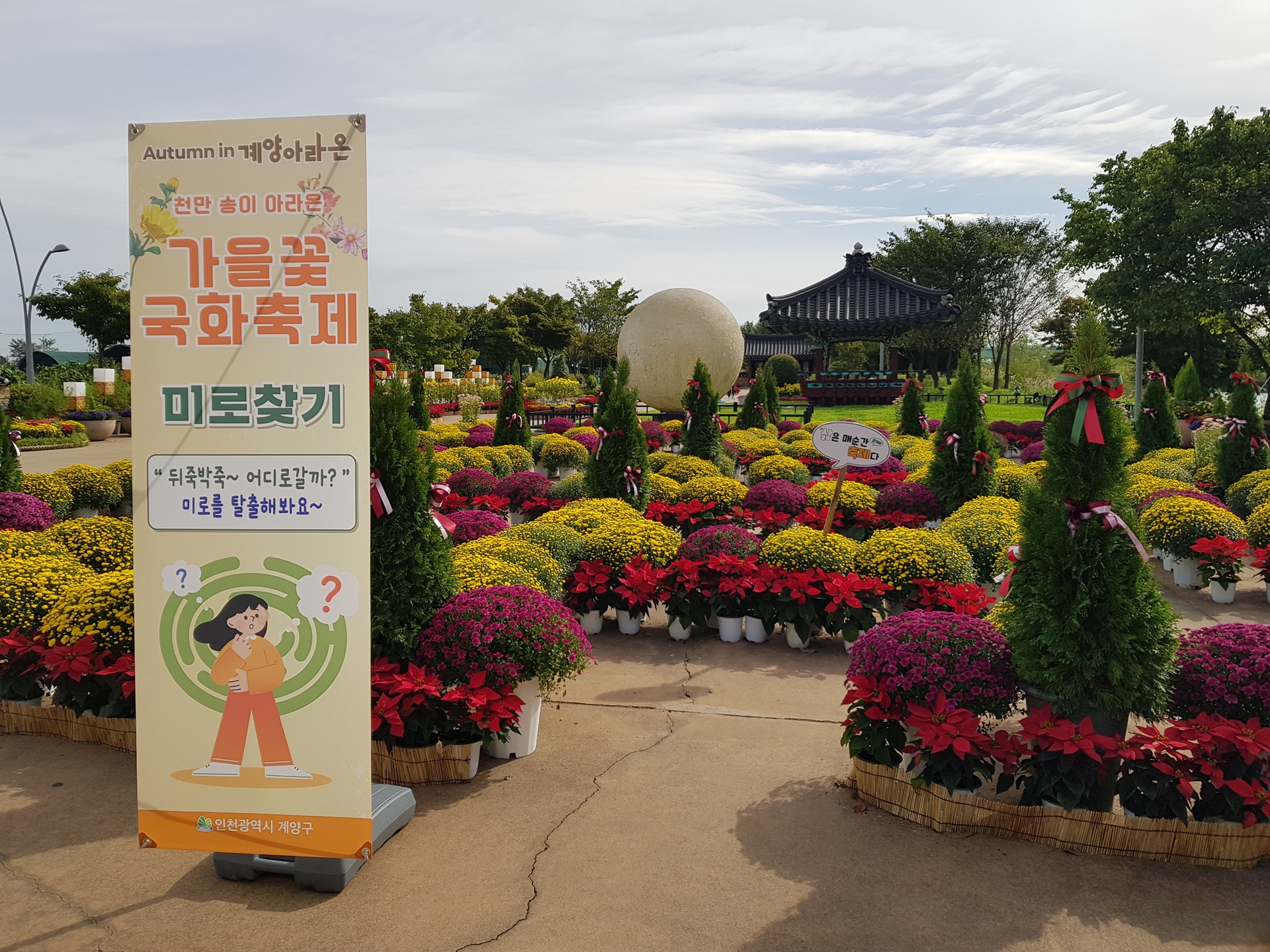 계양아라온 국화축제는 아라온에서 수향원까지 길을 따라 꽃들과 조형물을 볼 수 있다.