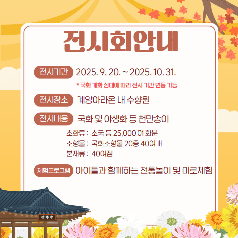 현재 계양아라온 가을꽃 국화축제에 백일홍은 활짝 피었고 국화는 피고 있는 상황이다.