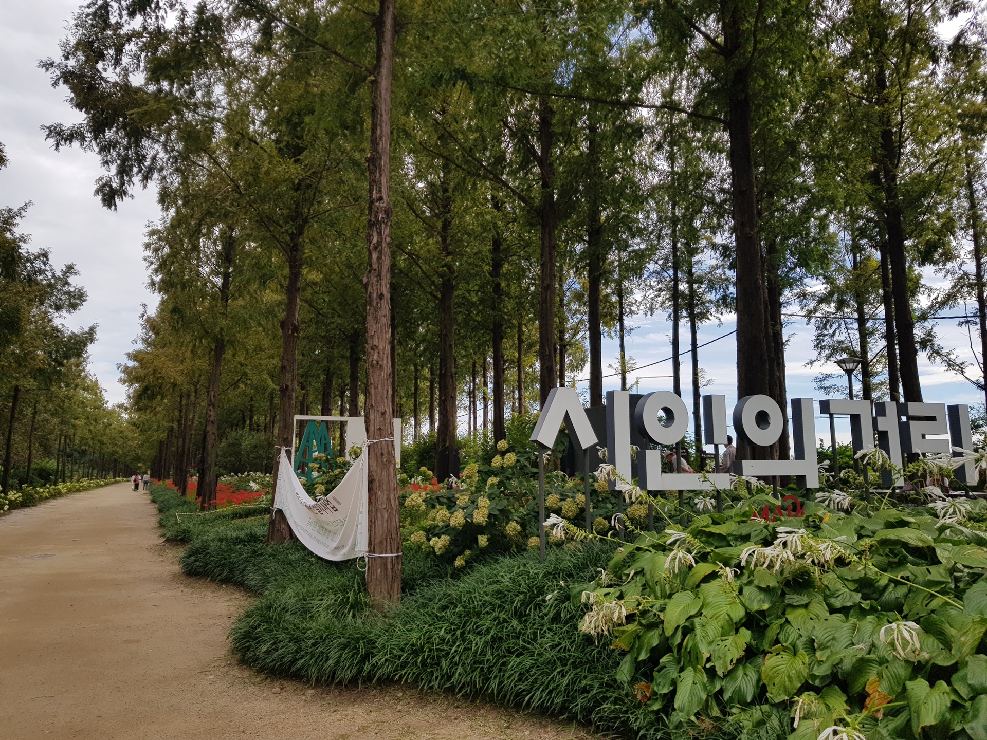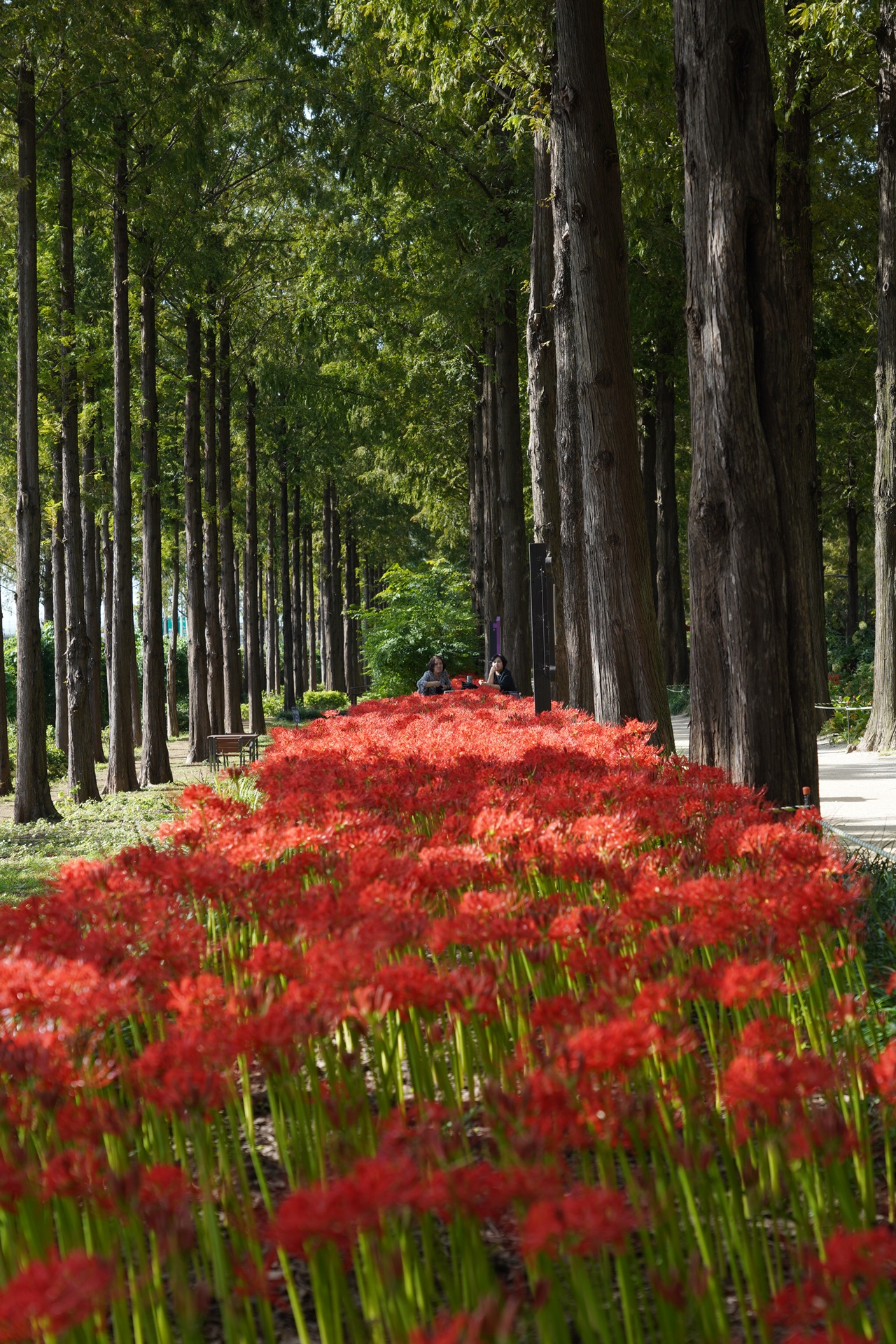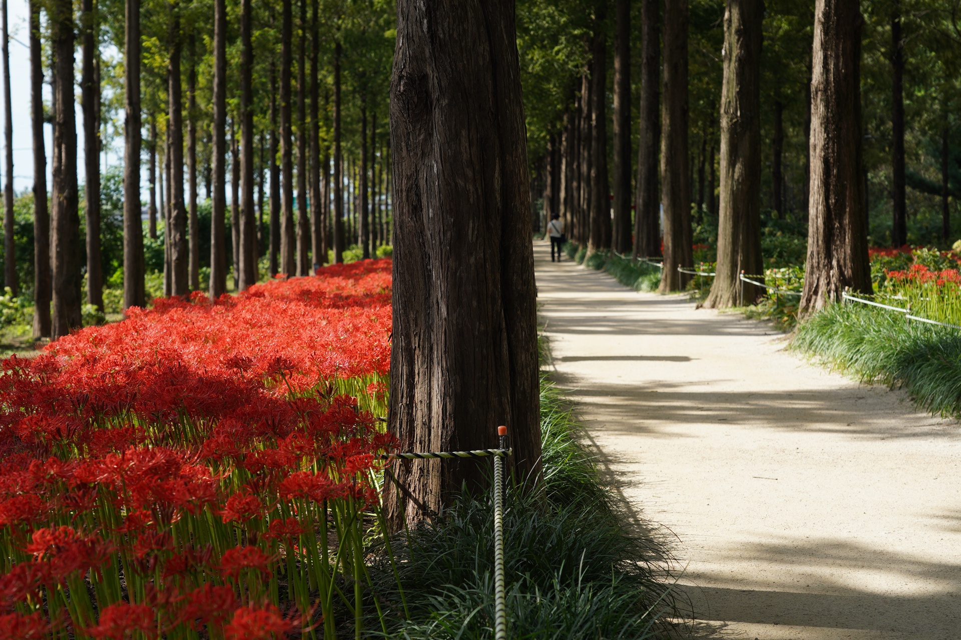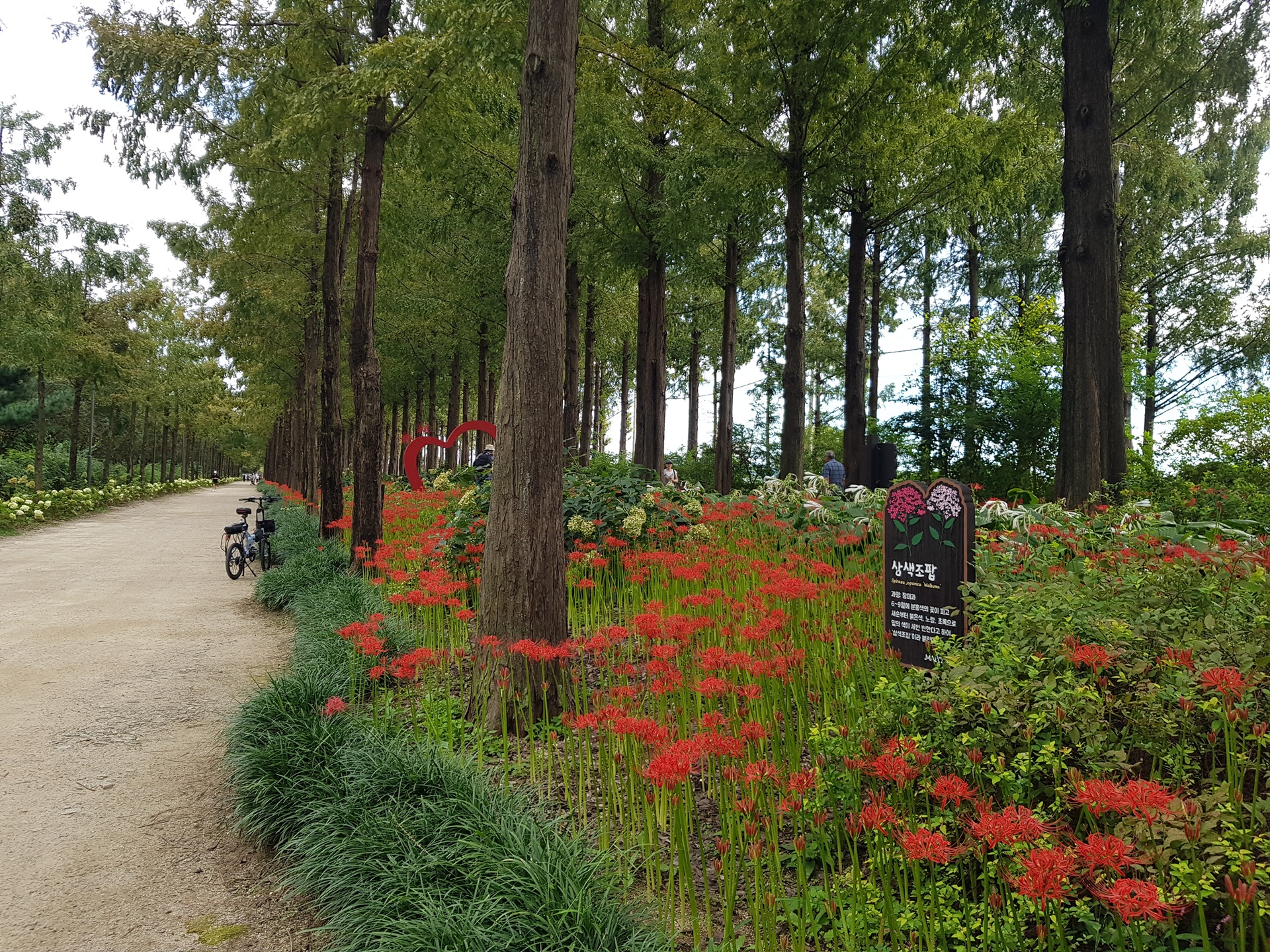 메타세콰이어길 시인의 거리에 들어서니 빨간 꽃무릇이 보인다.