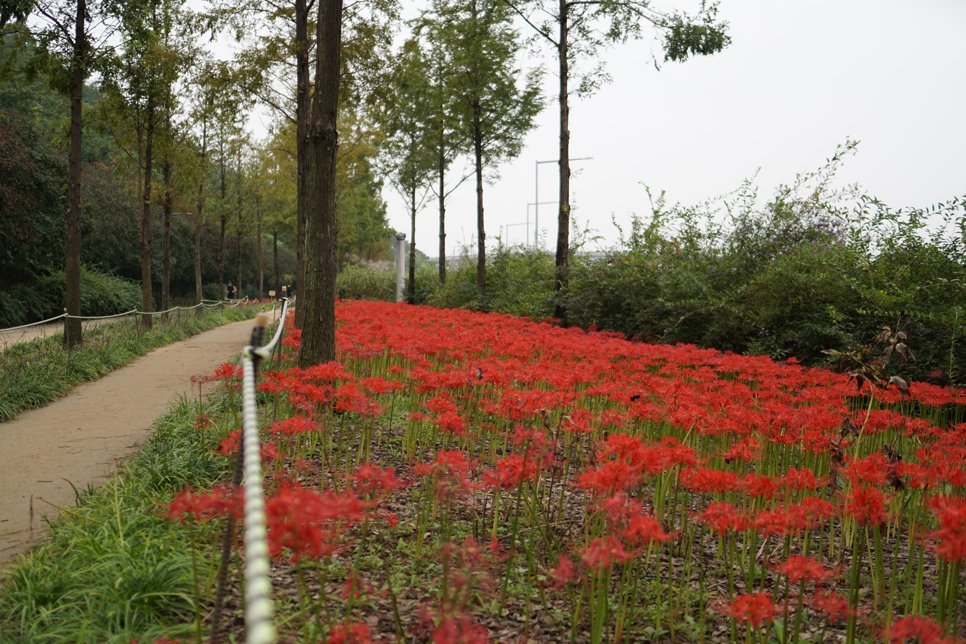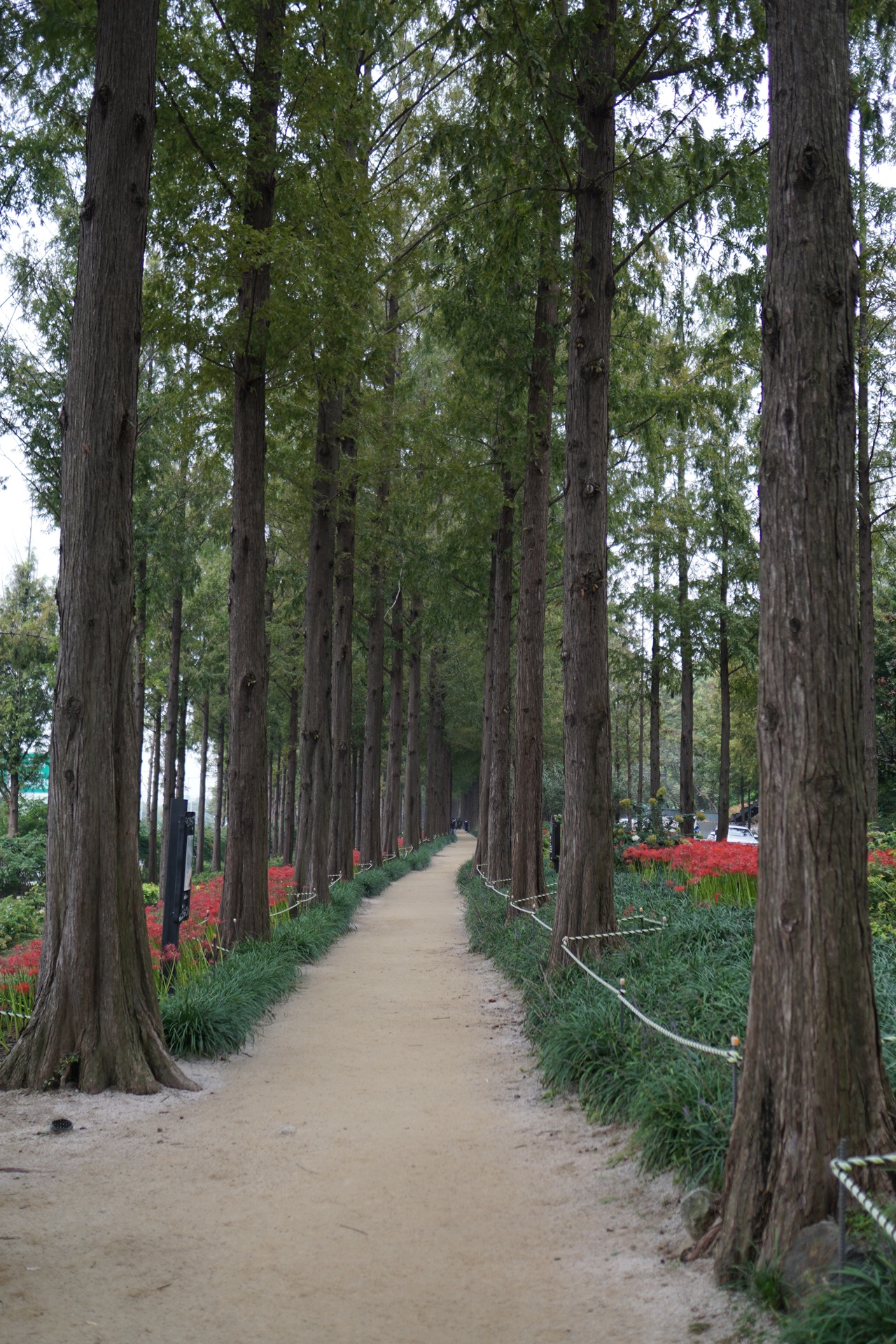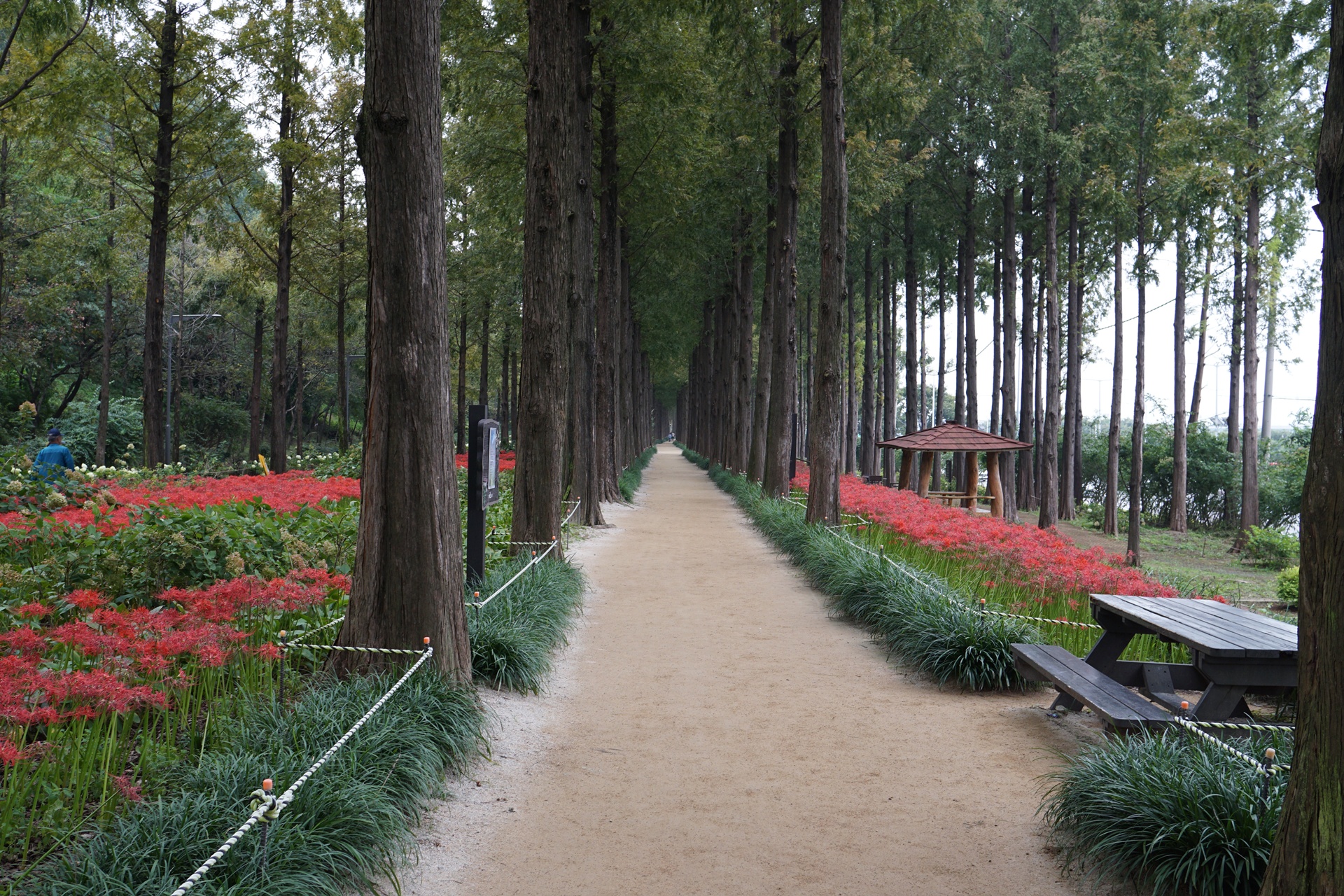 메타세콰이어길 좌우로 활짝 피어있는 꽃무릇.