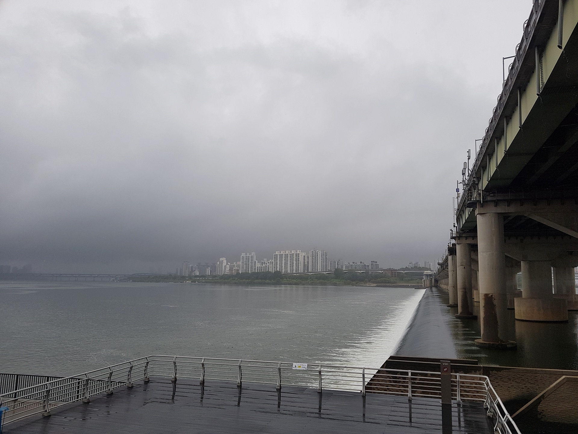 잠실대교에서 비가 멈추길 기다리는데 멈출 기미가 안 보인다.