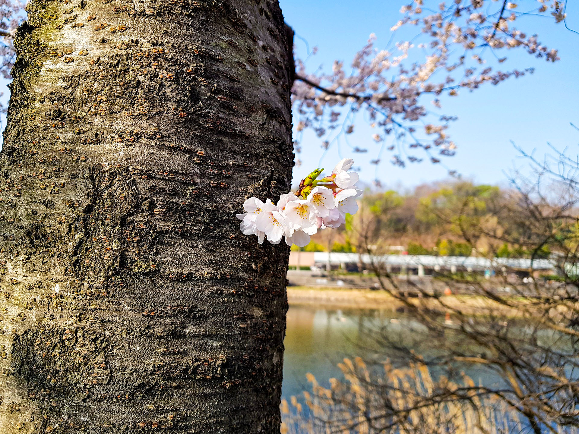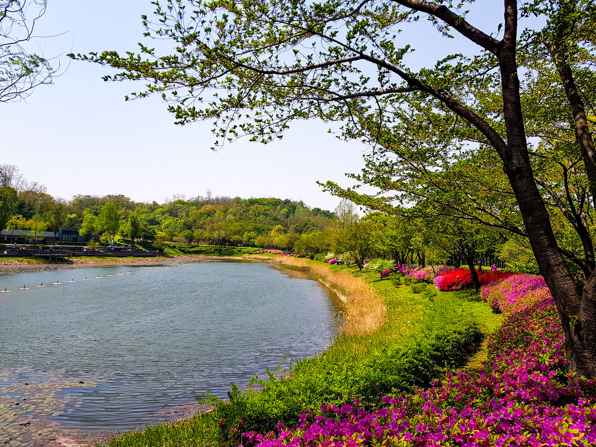 호수 주변으로 벚꽃과 철쭉이 피어나는 봄 풍경.