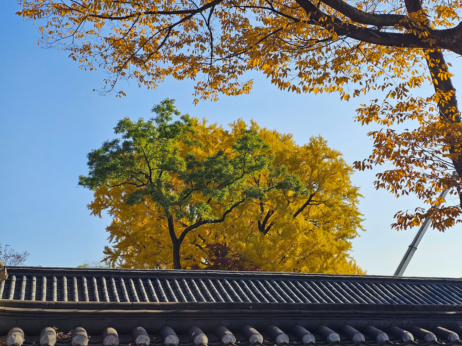 공사 중이라 들어가서는 볼 수 없던 대성전 은행나무를 나오면서 담 넘어 찍어보았다.