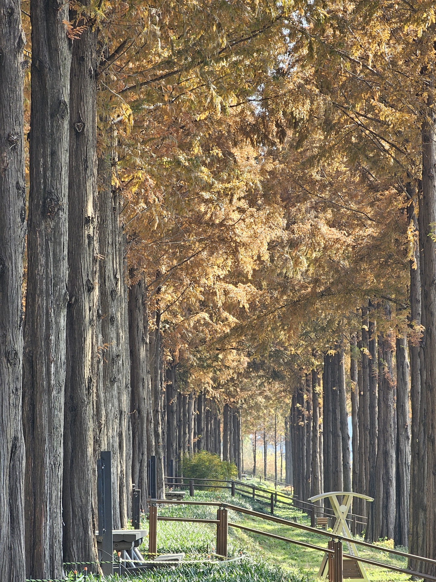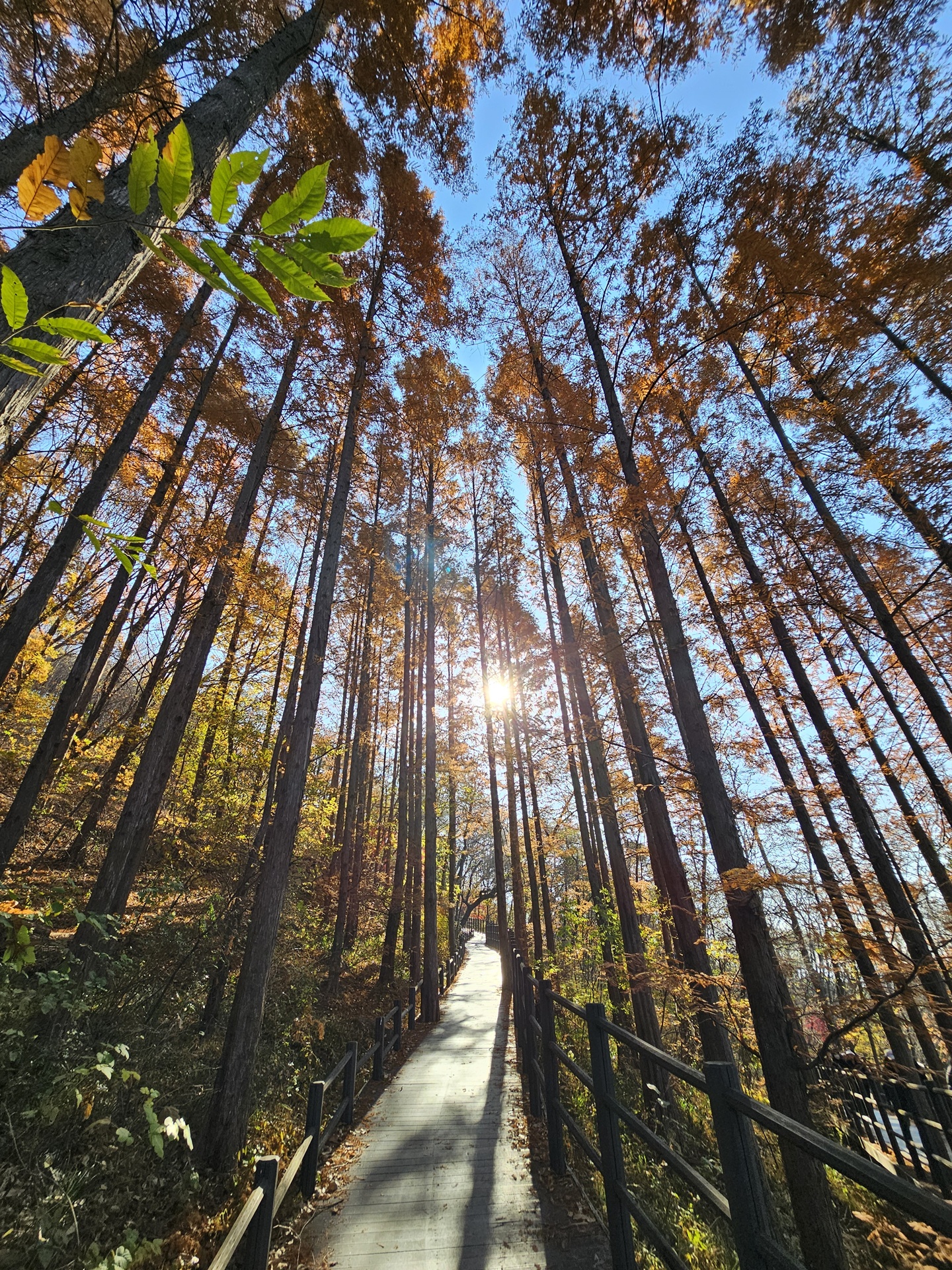 데크길옆으로 빽빽이 서있는 메타세콰이어.
