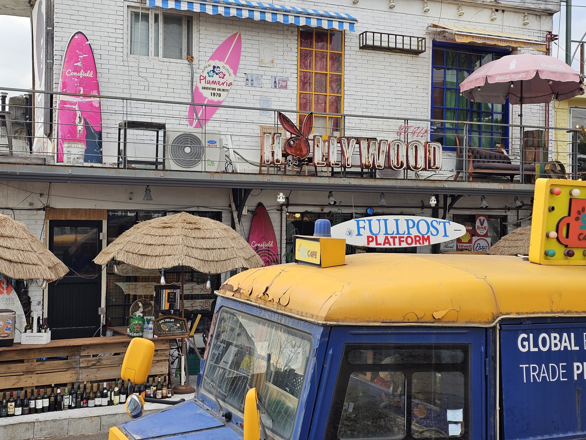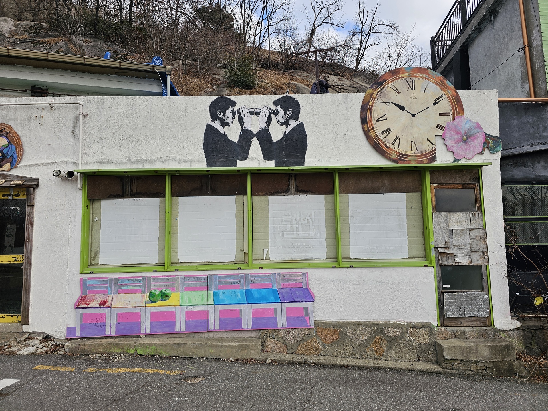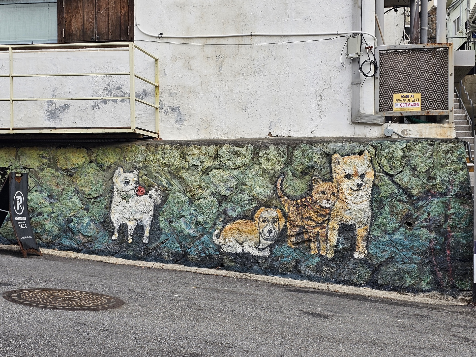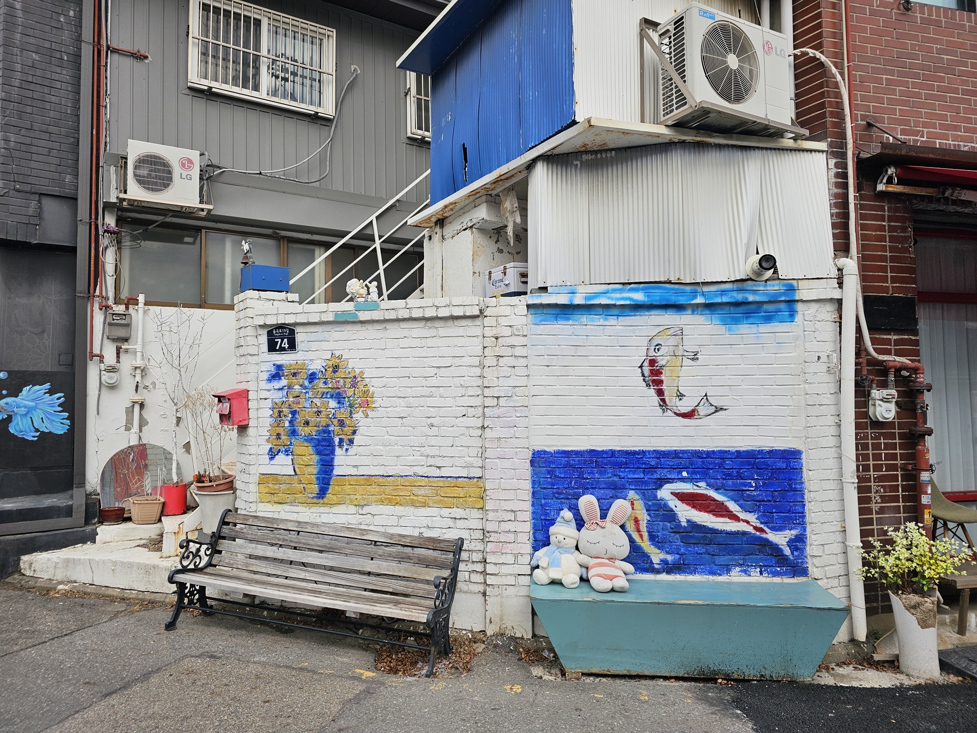 좁은 골목길에 알록달록 벽화가 그려져 있다.