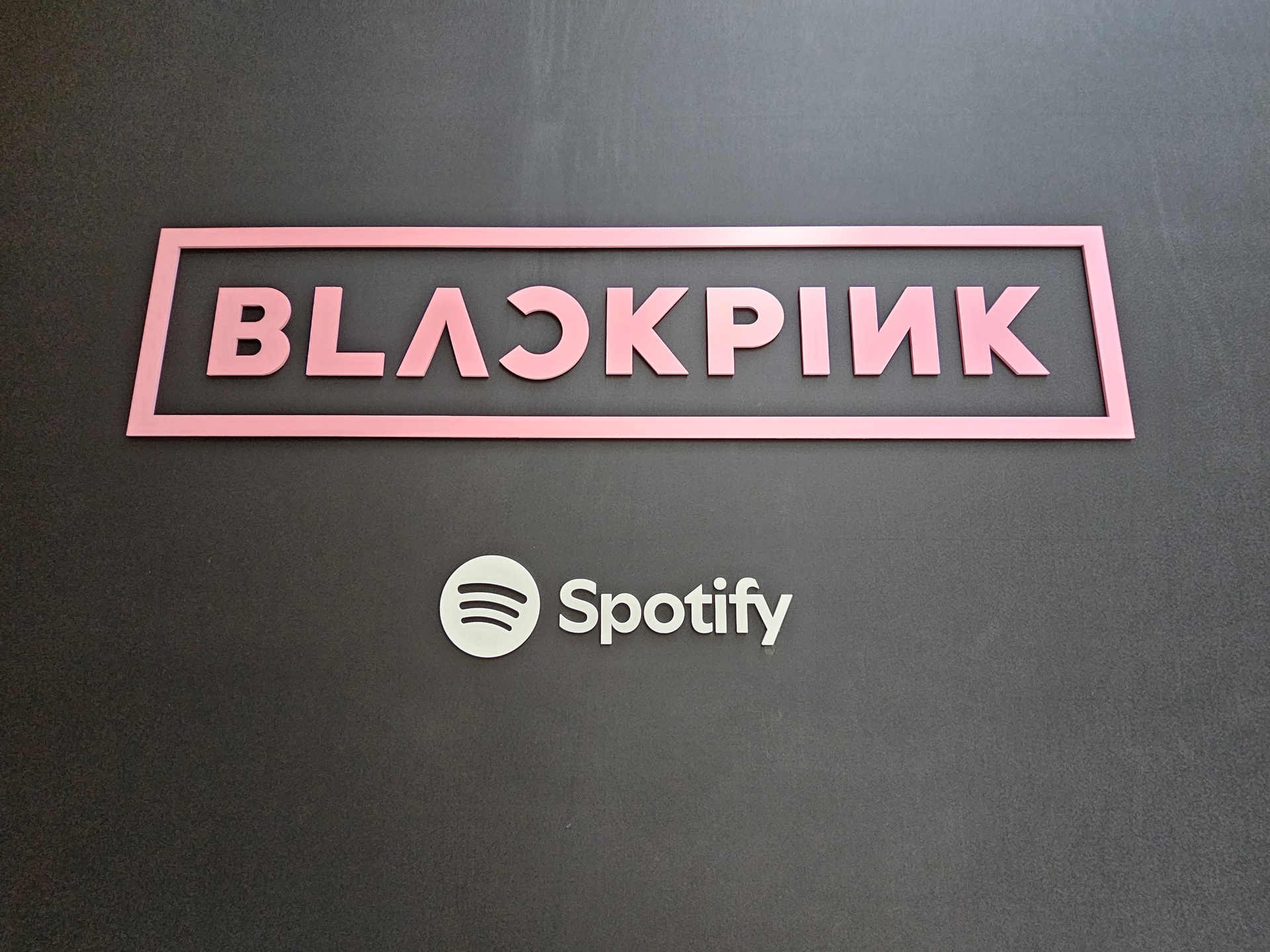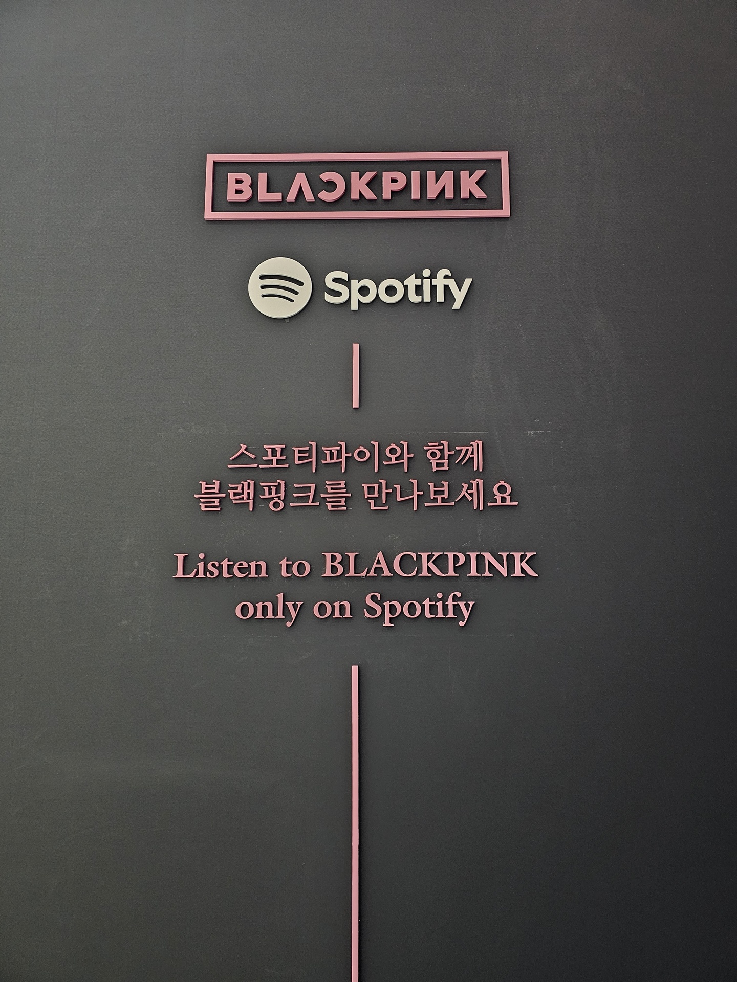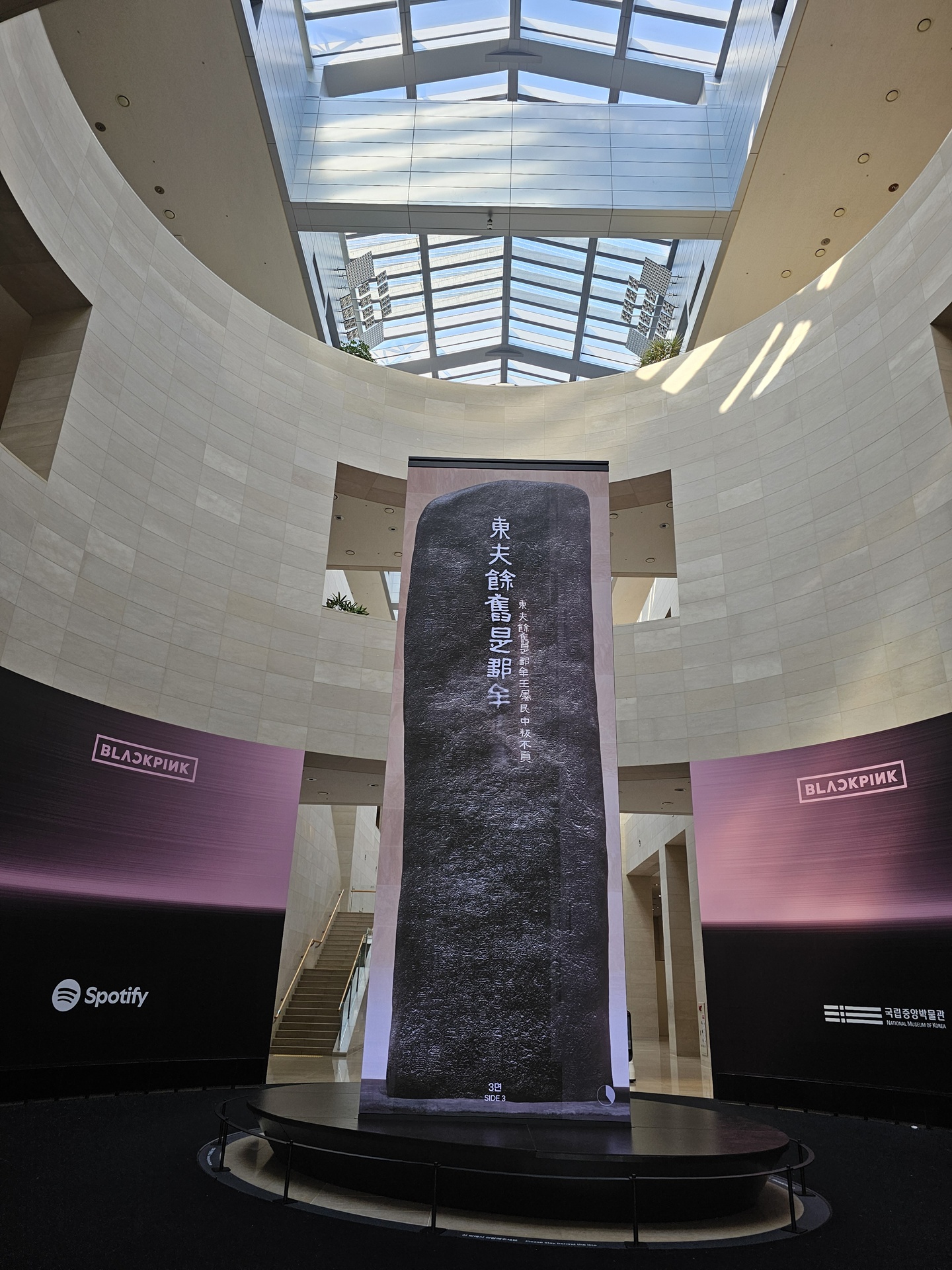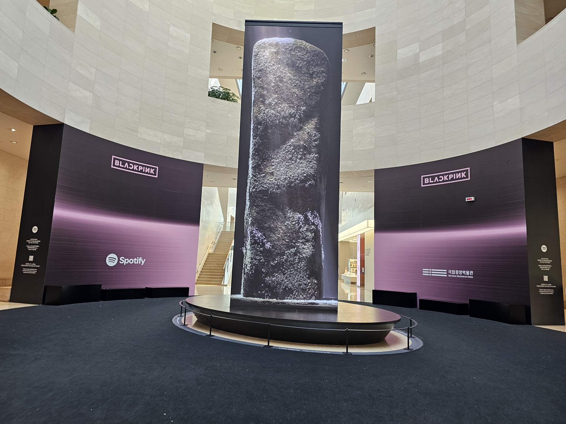 비석 조형물과 이를 감싸는 미디어아트, 그리고 블랙핑크의 앨범 홍보 포스터가 어우러진 풍경이다.