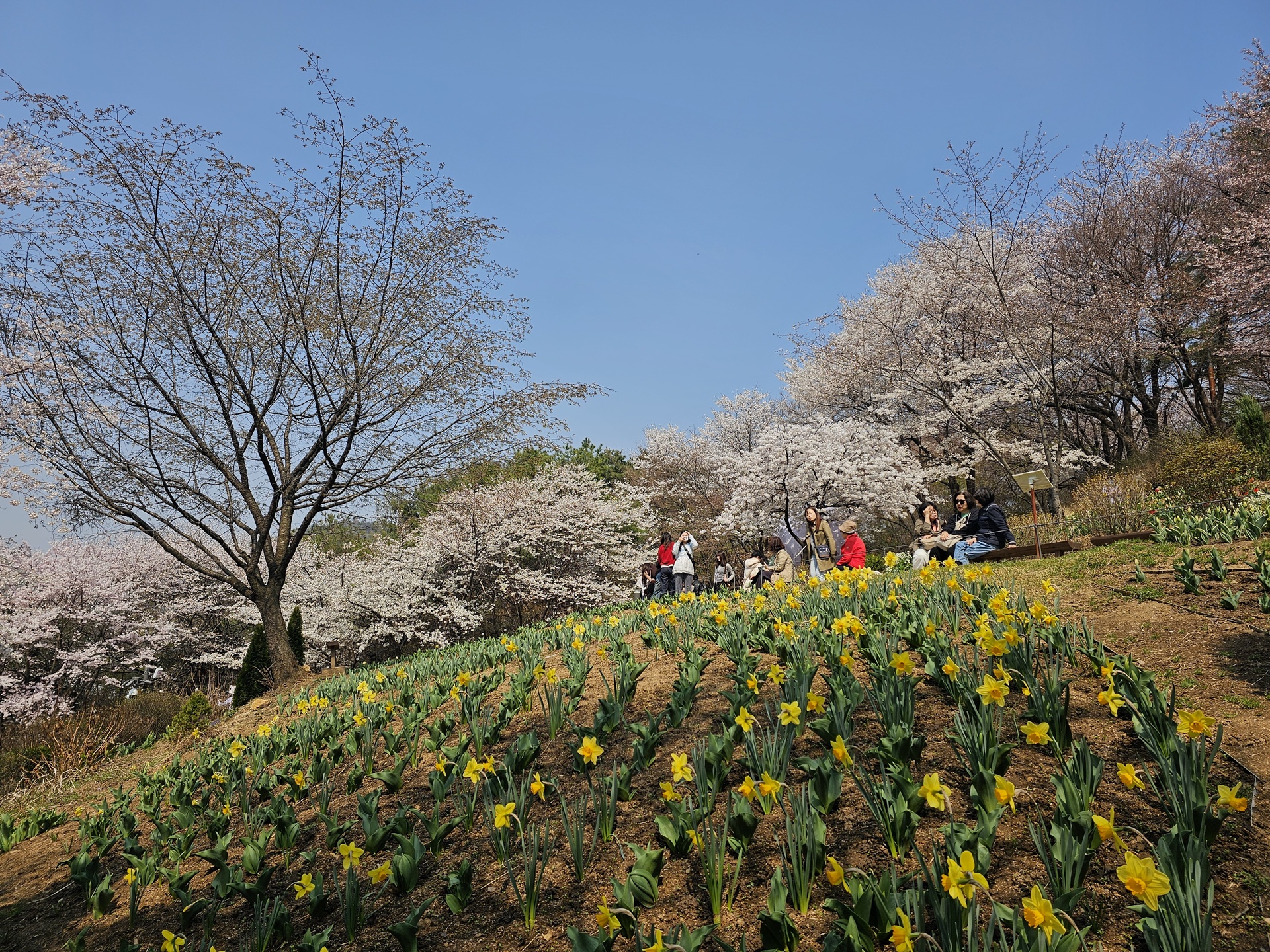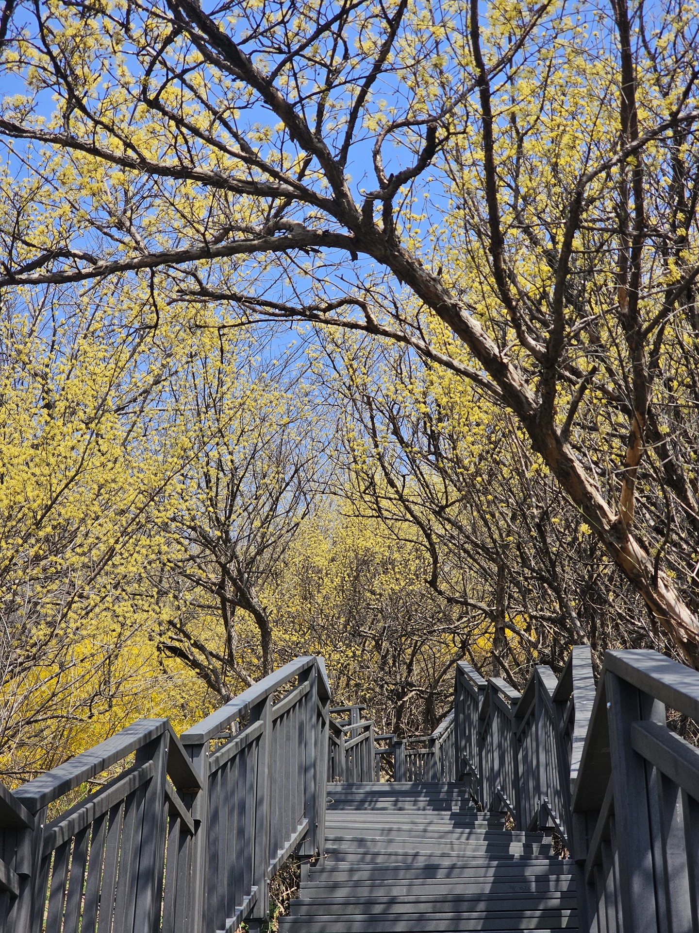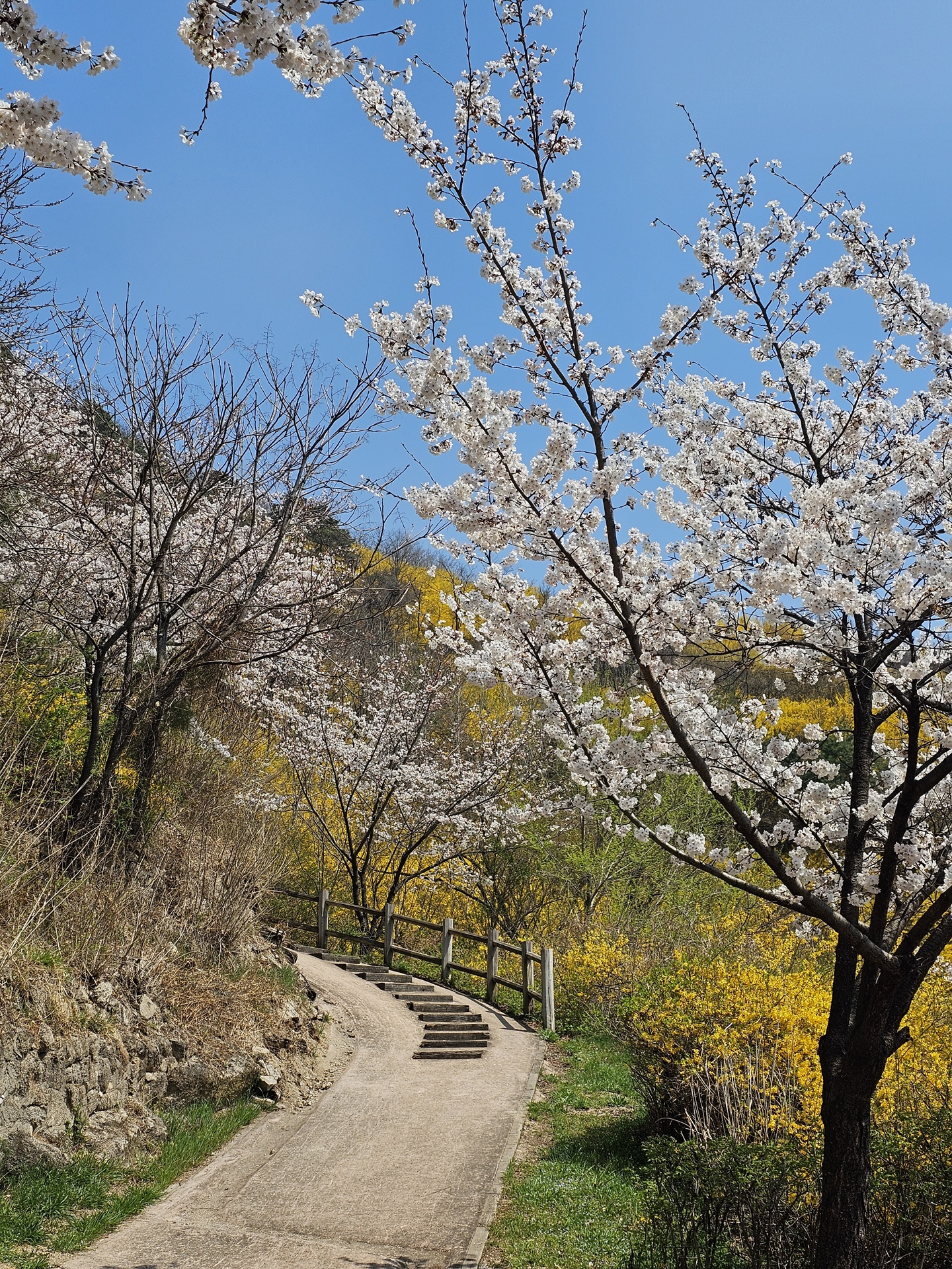 개나리, 벚꽃 산수유가 어우러져 있는 예쁜 풍경이다.
