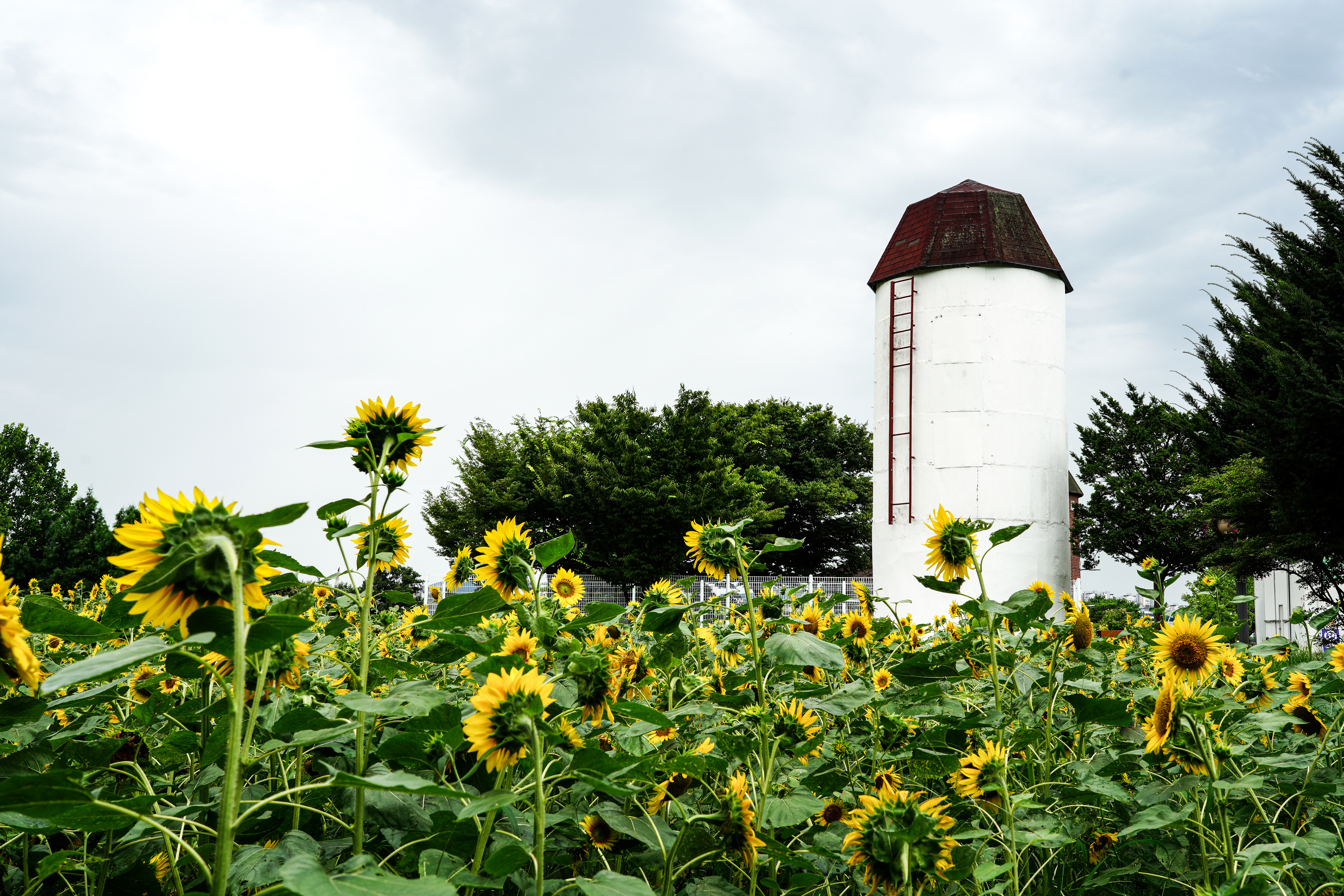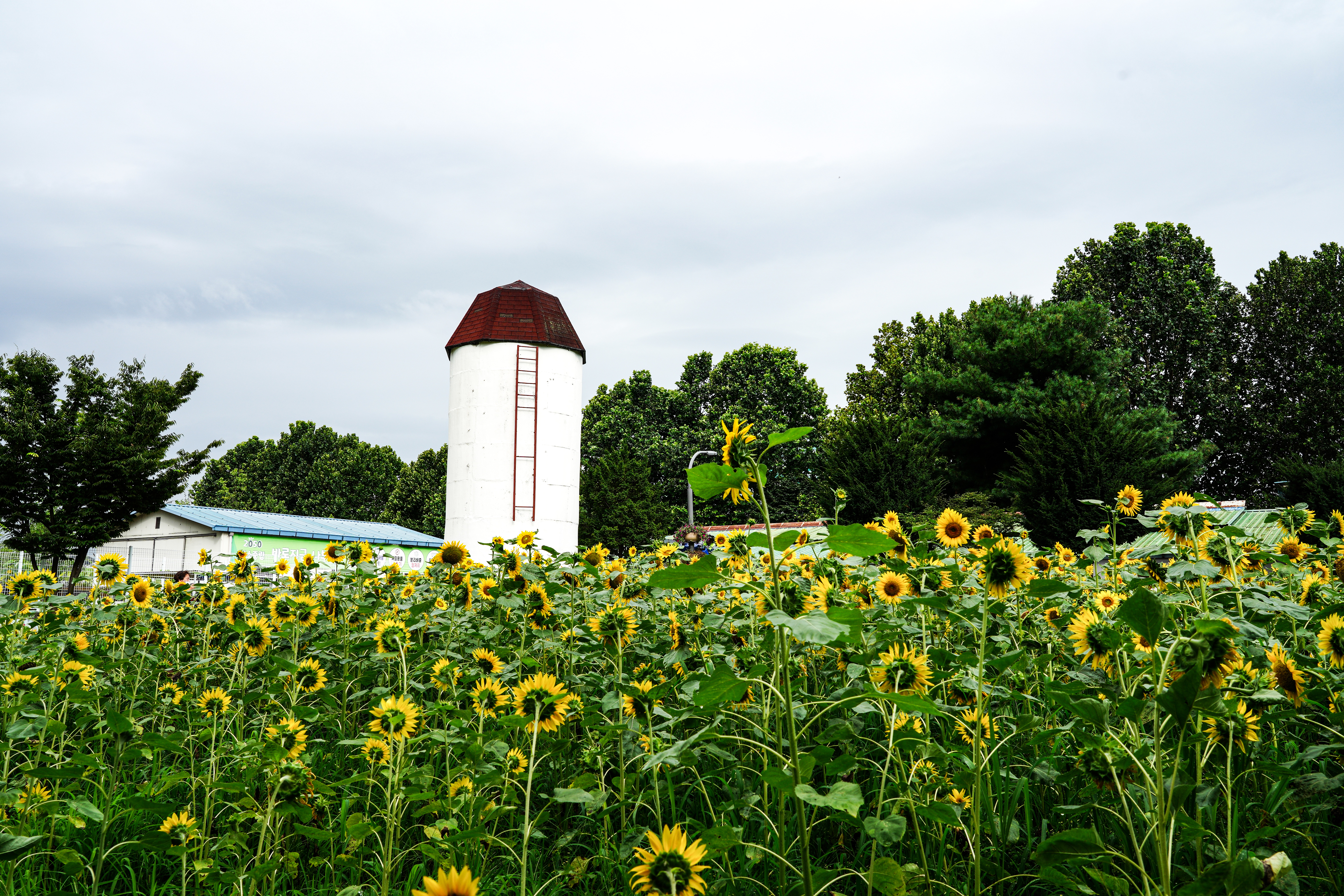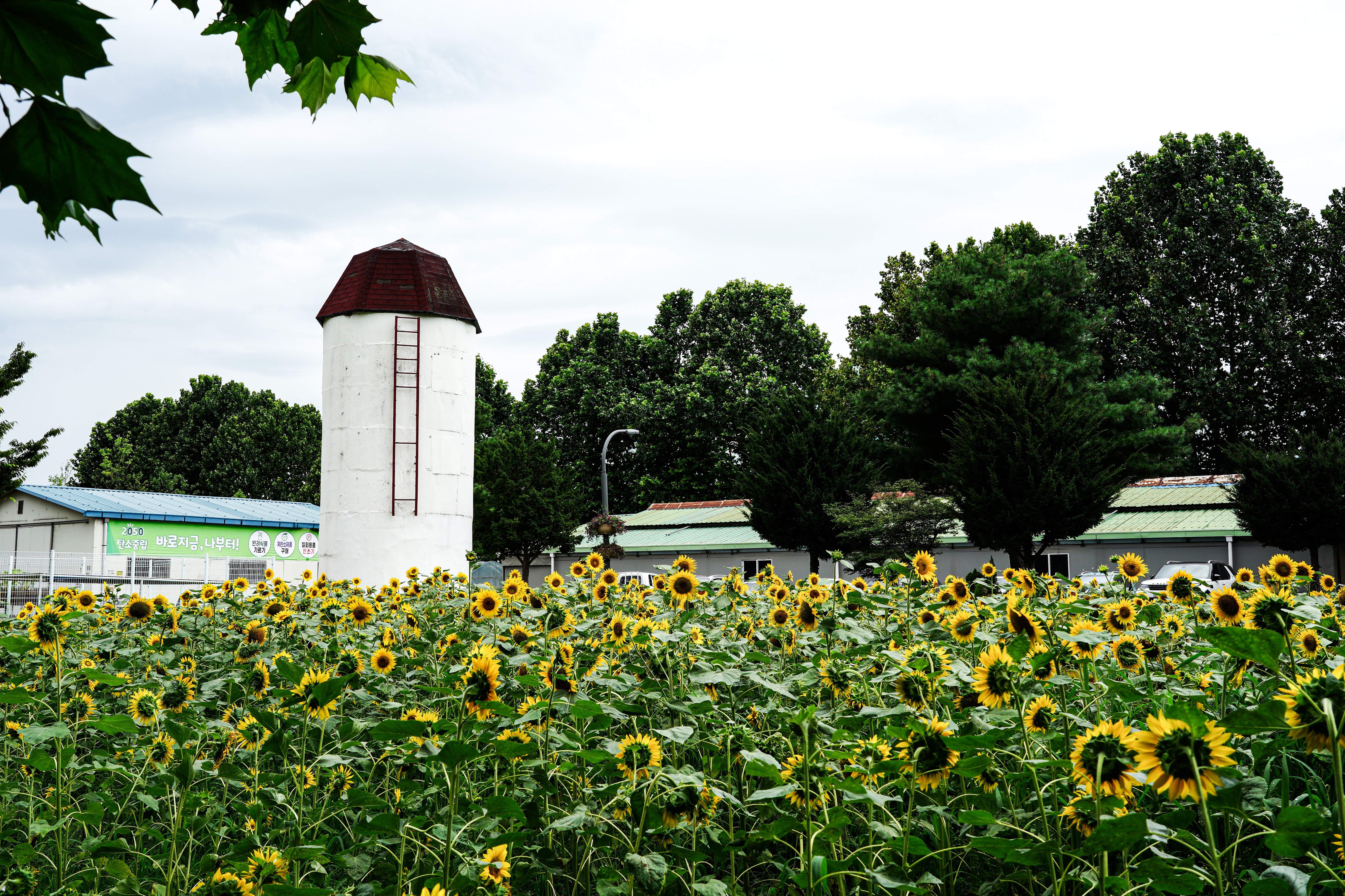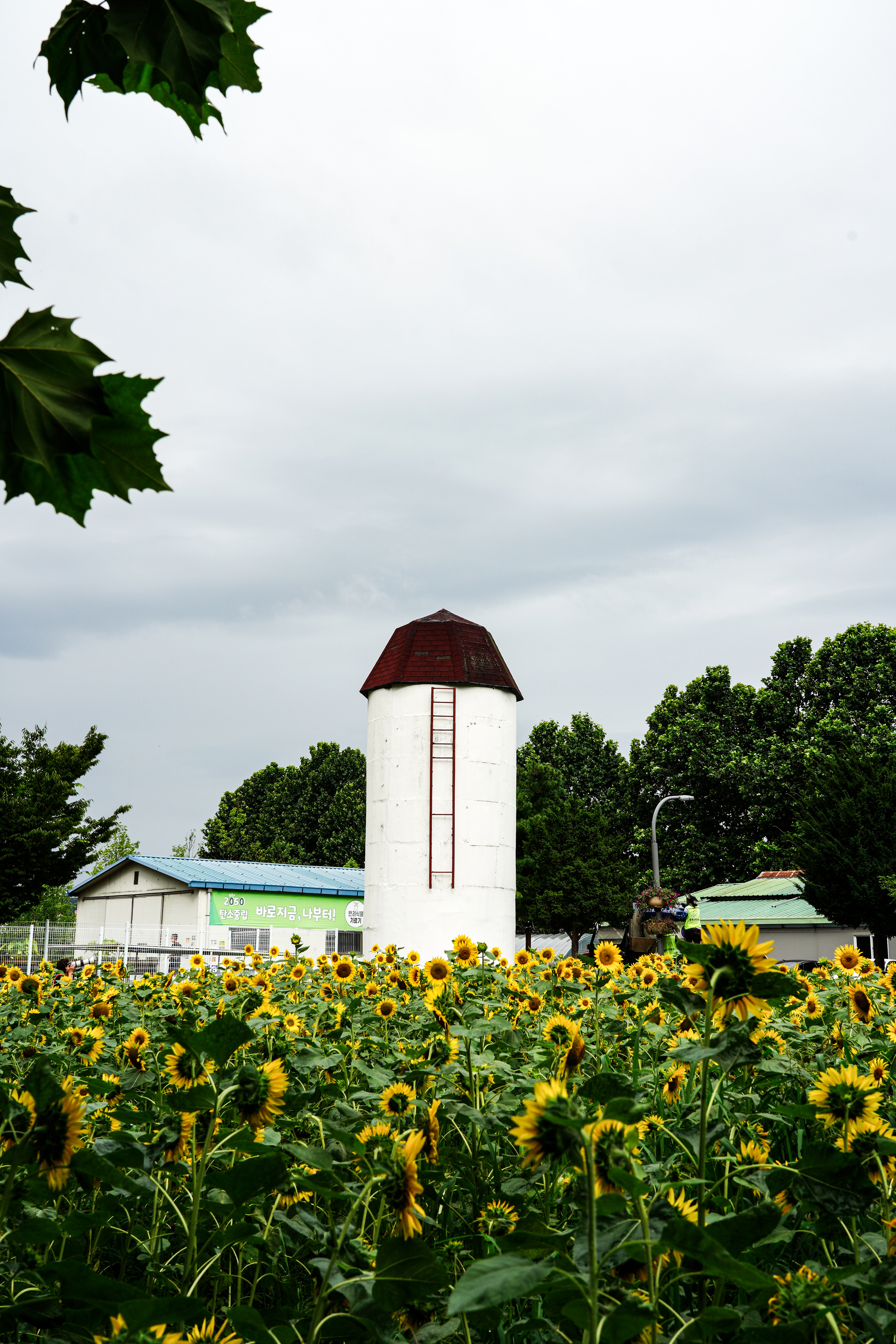 넓지 않은 곳에서 피어있는 해바리기와 포인트가 되는 하얀 탑건물.