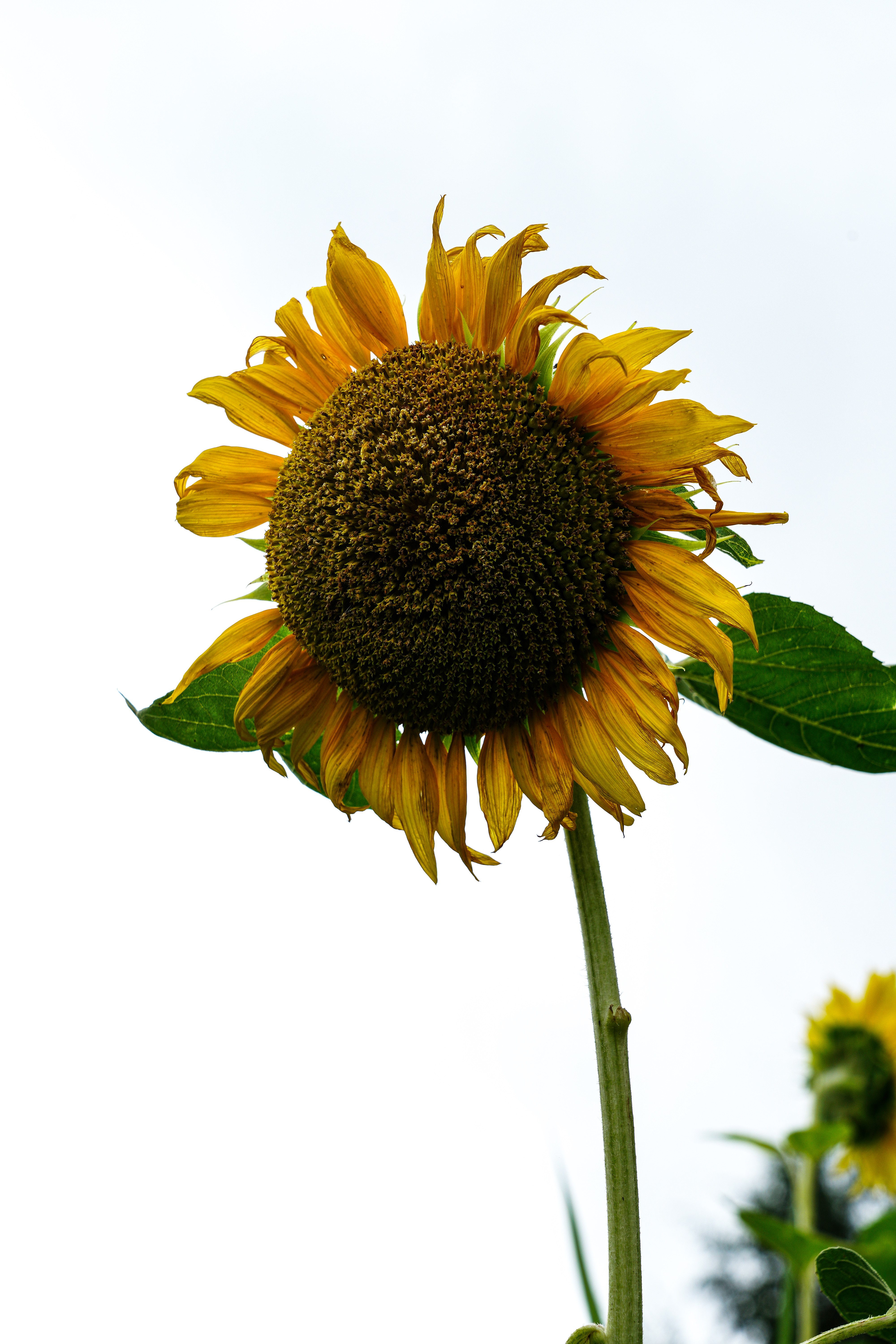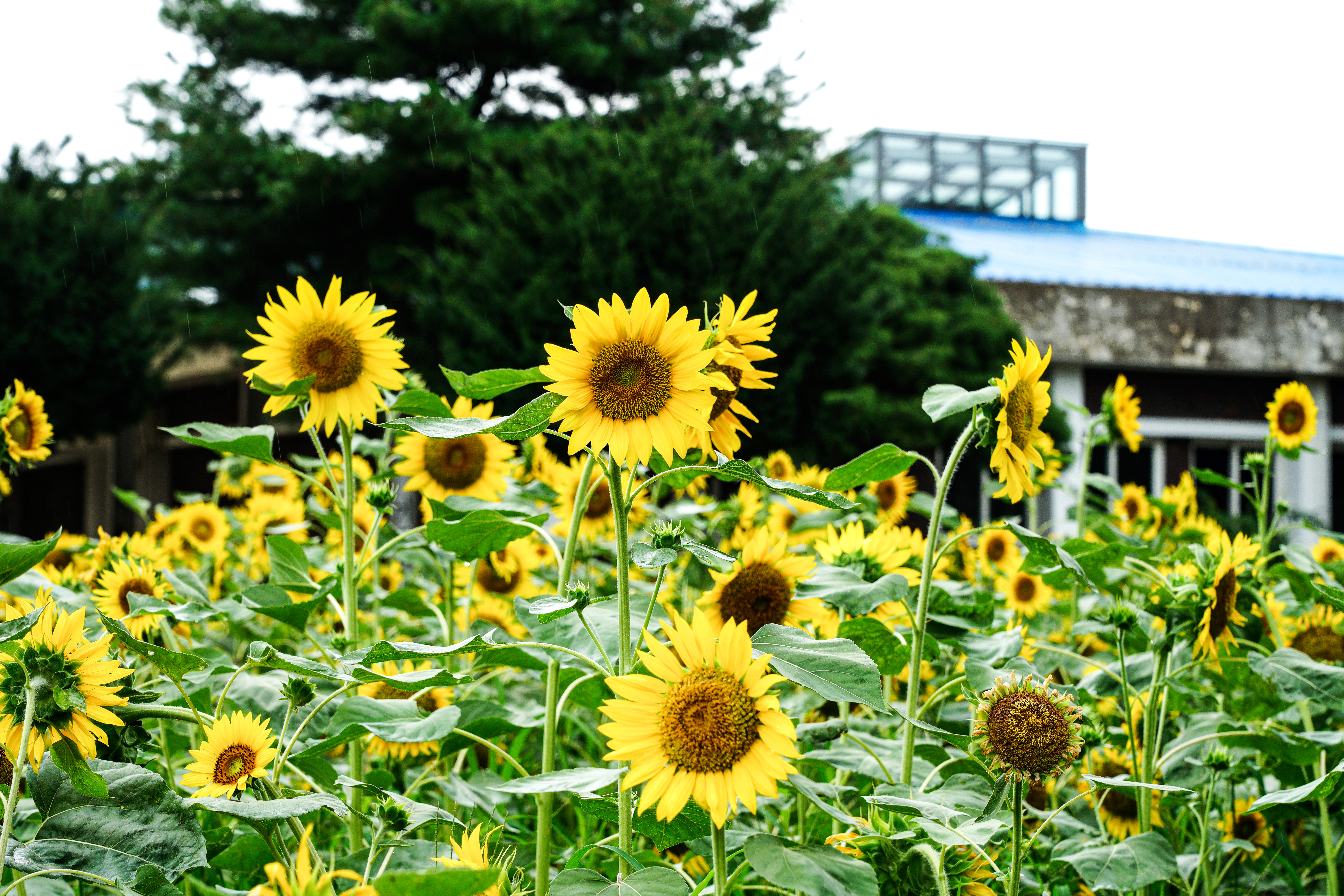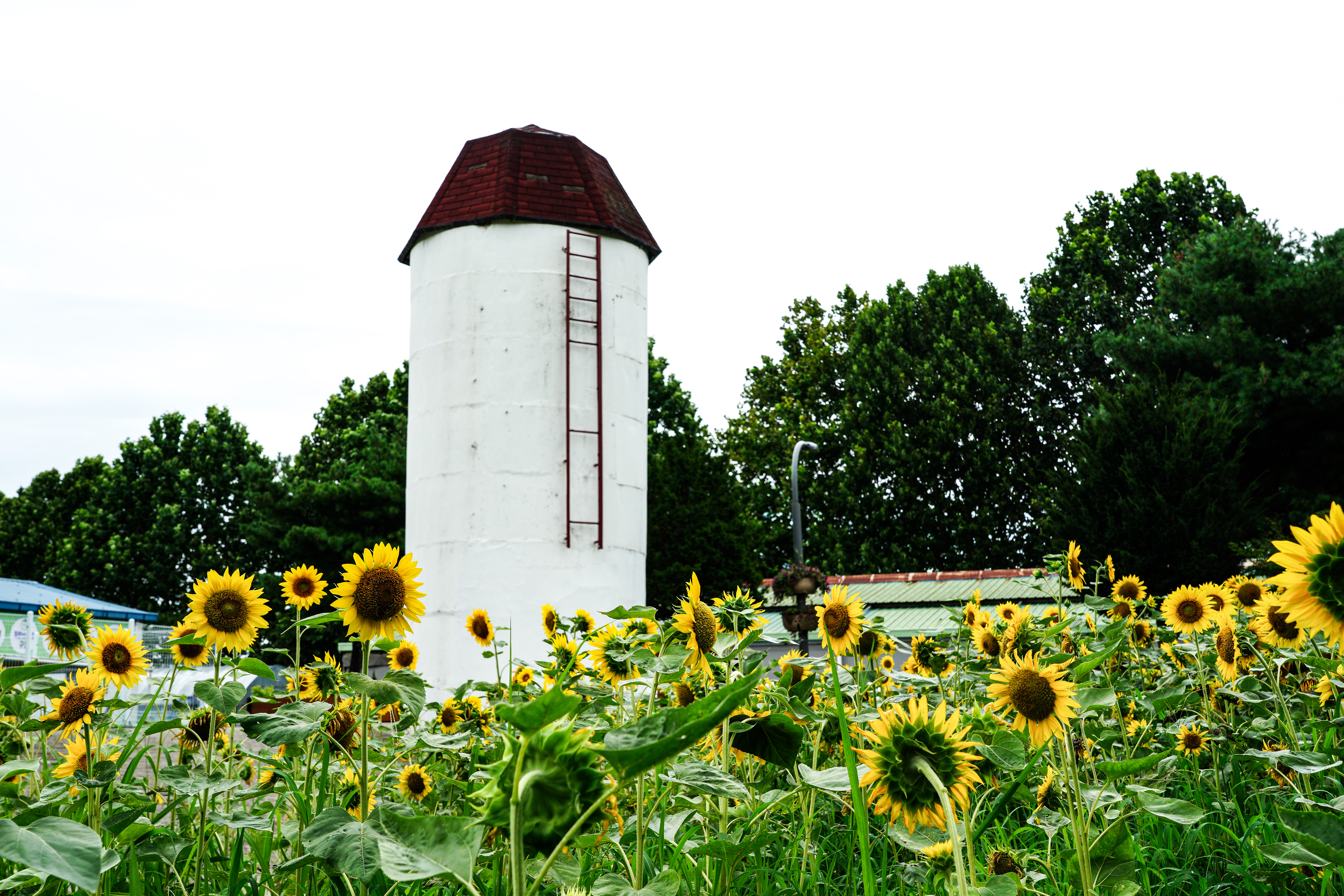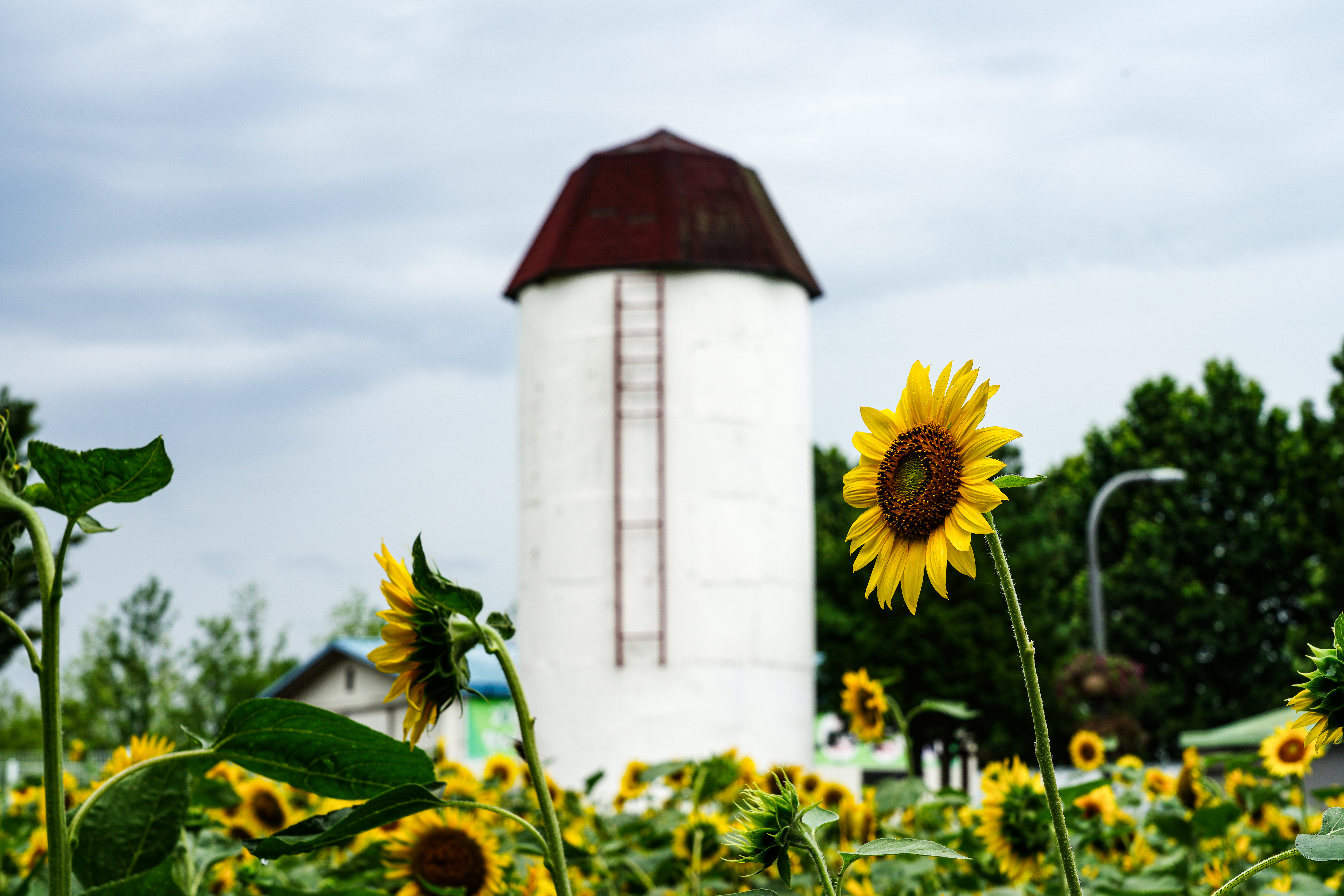 넓지 않은 곳에서 피어있는 해바리기와 포인트가 되는 하얀 탑건물.