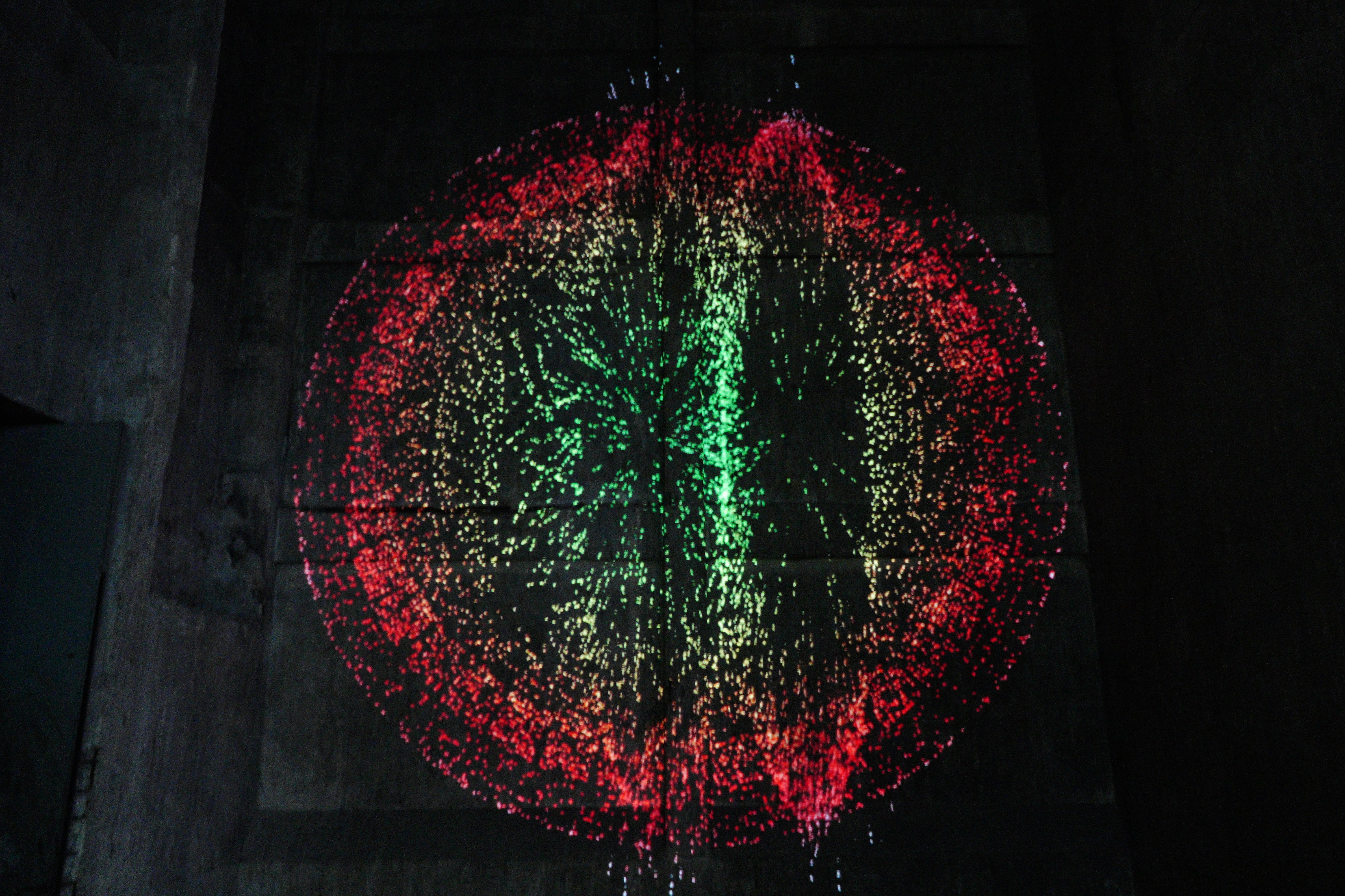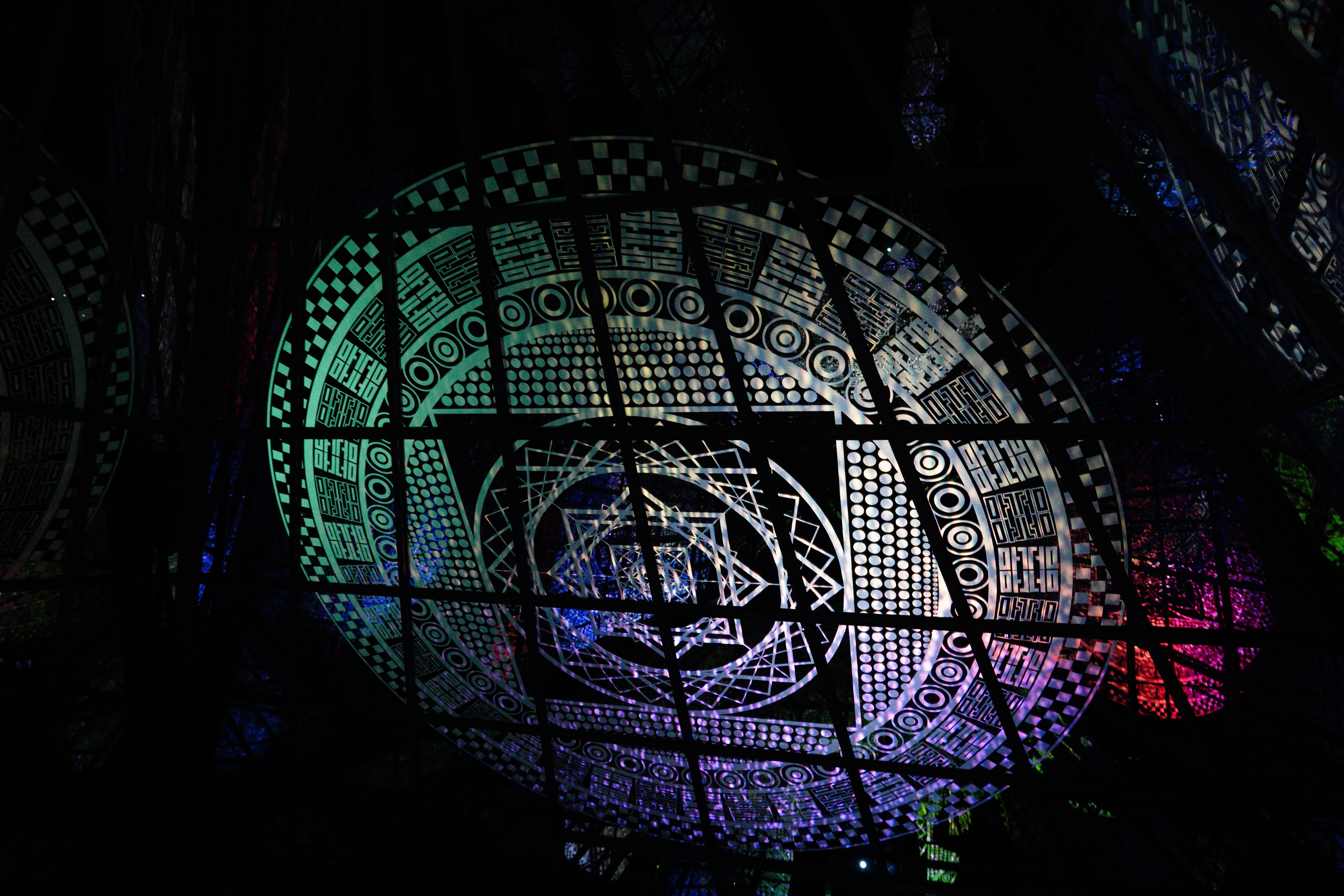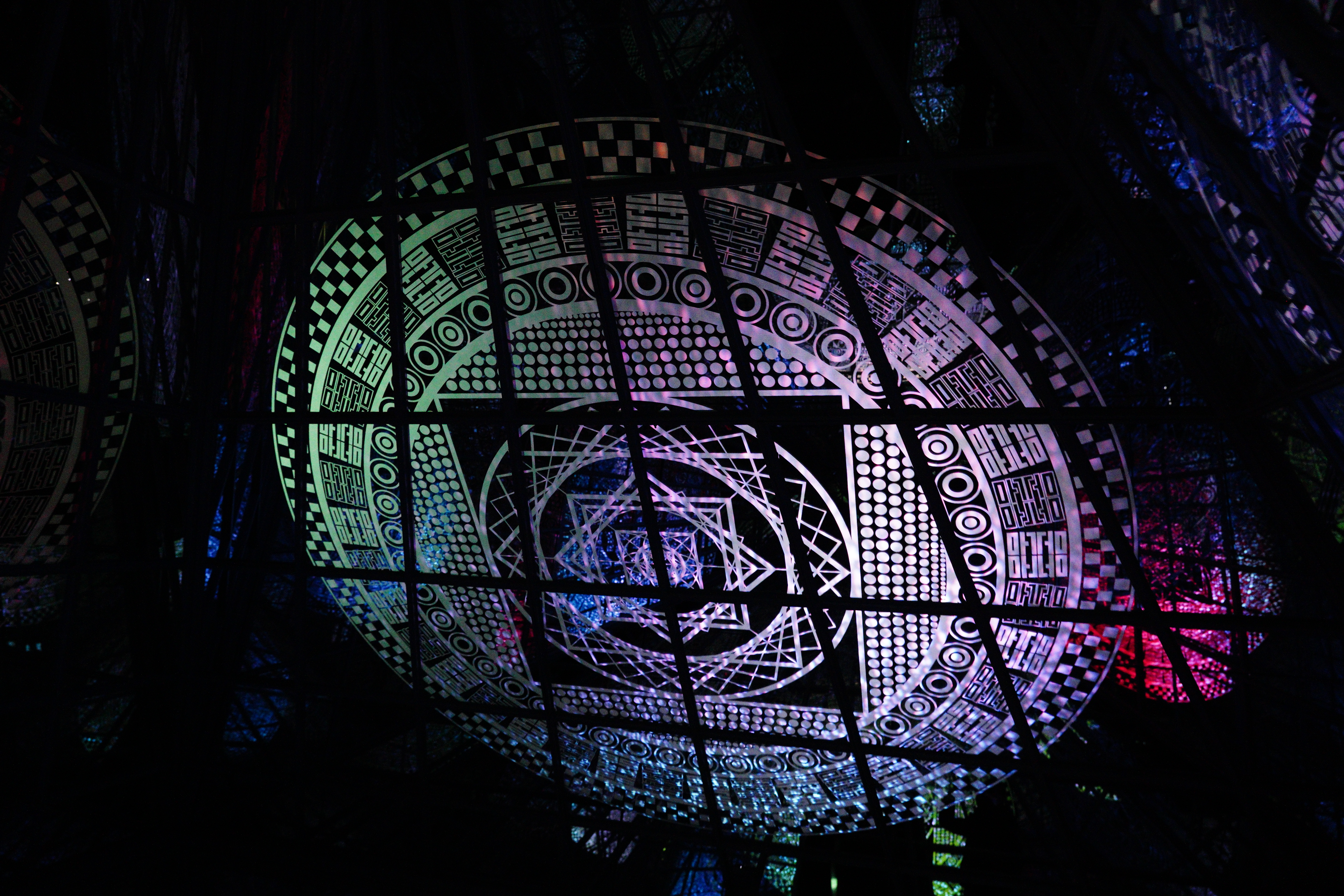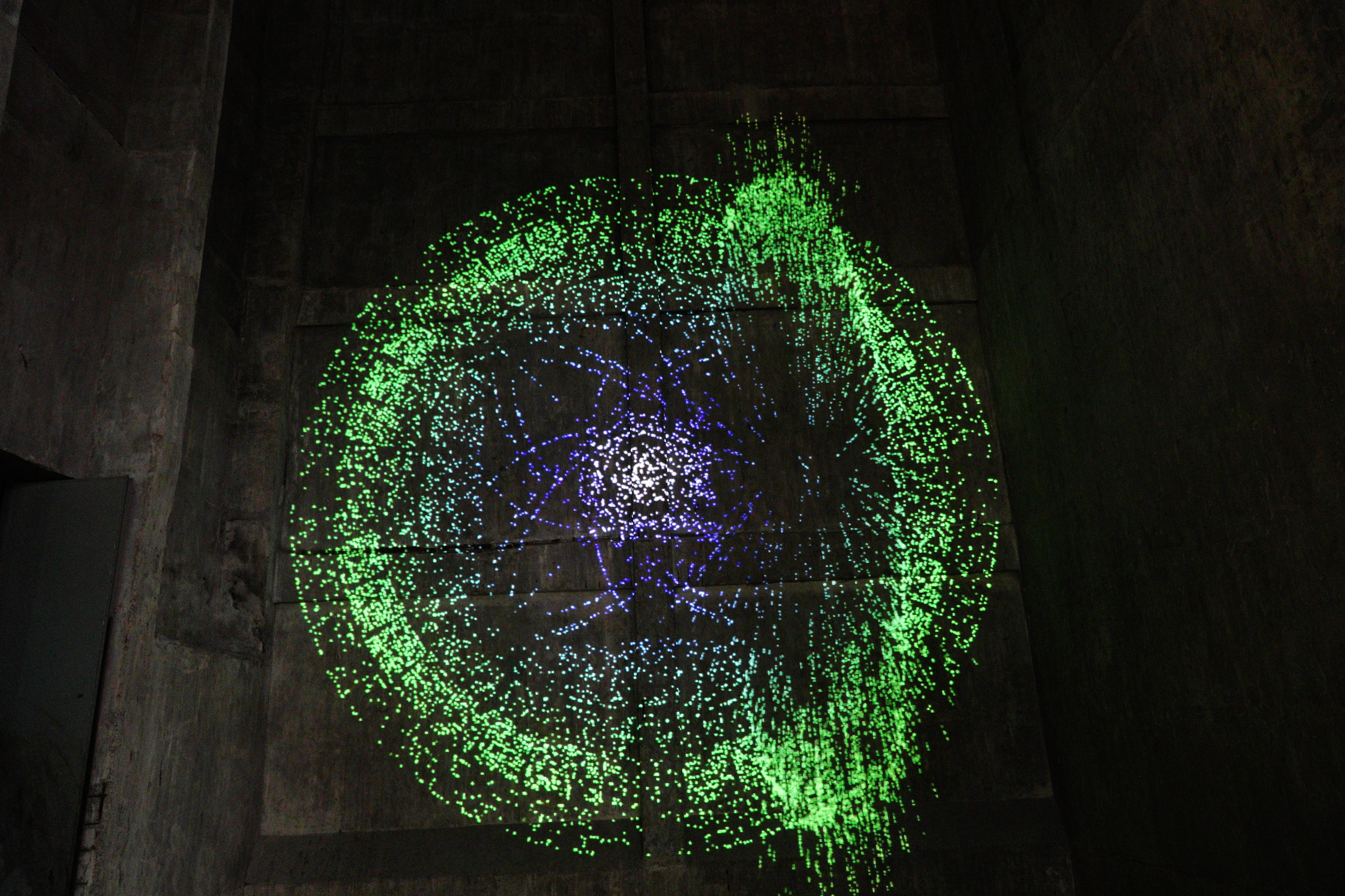 어두운 전시장에 피라미드조형물에 빛 에너지 표현..