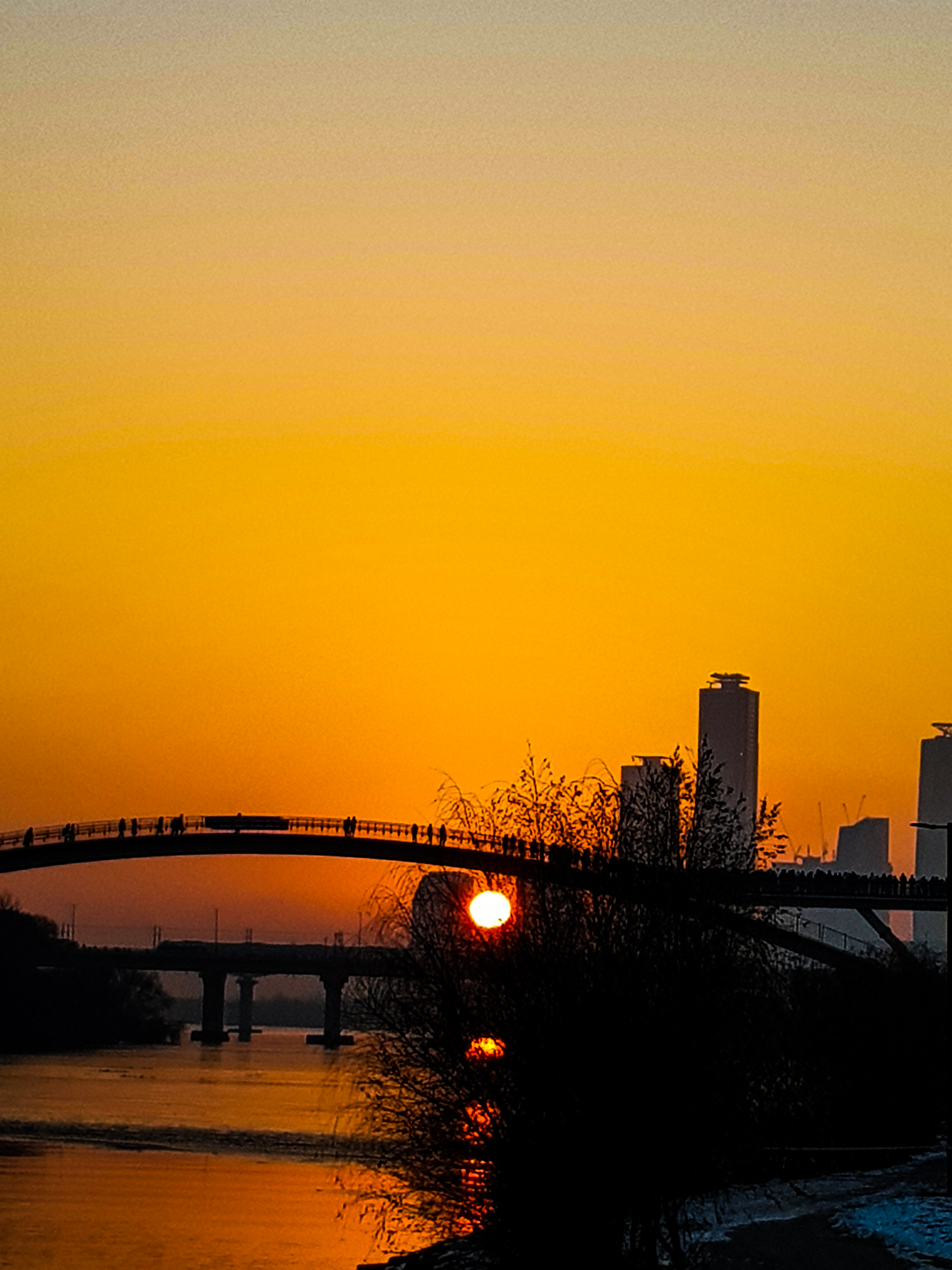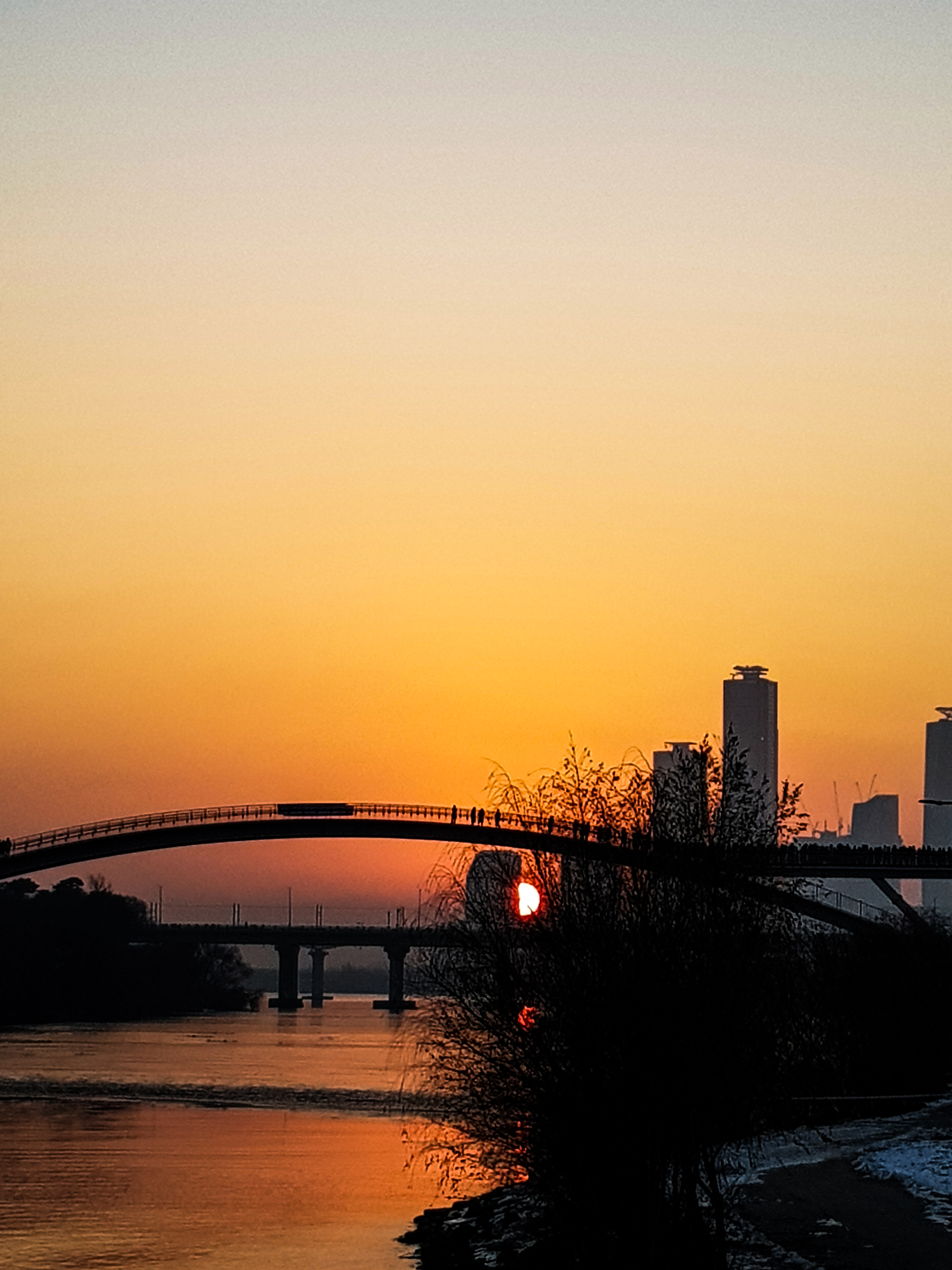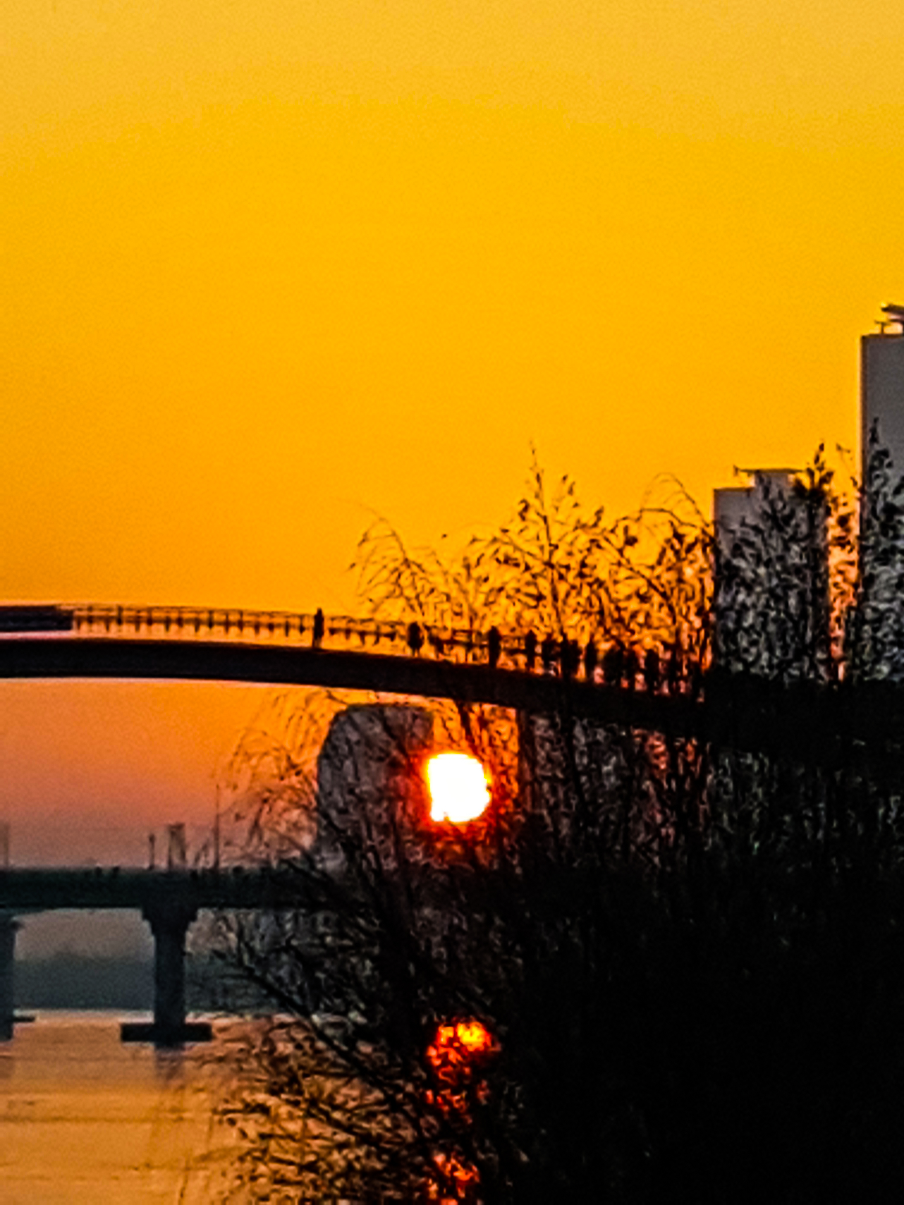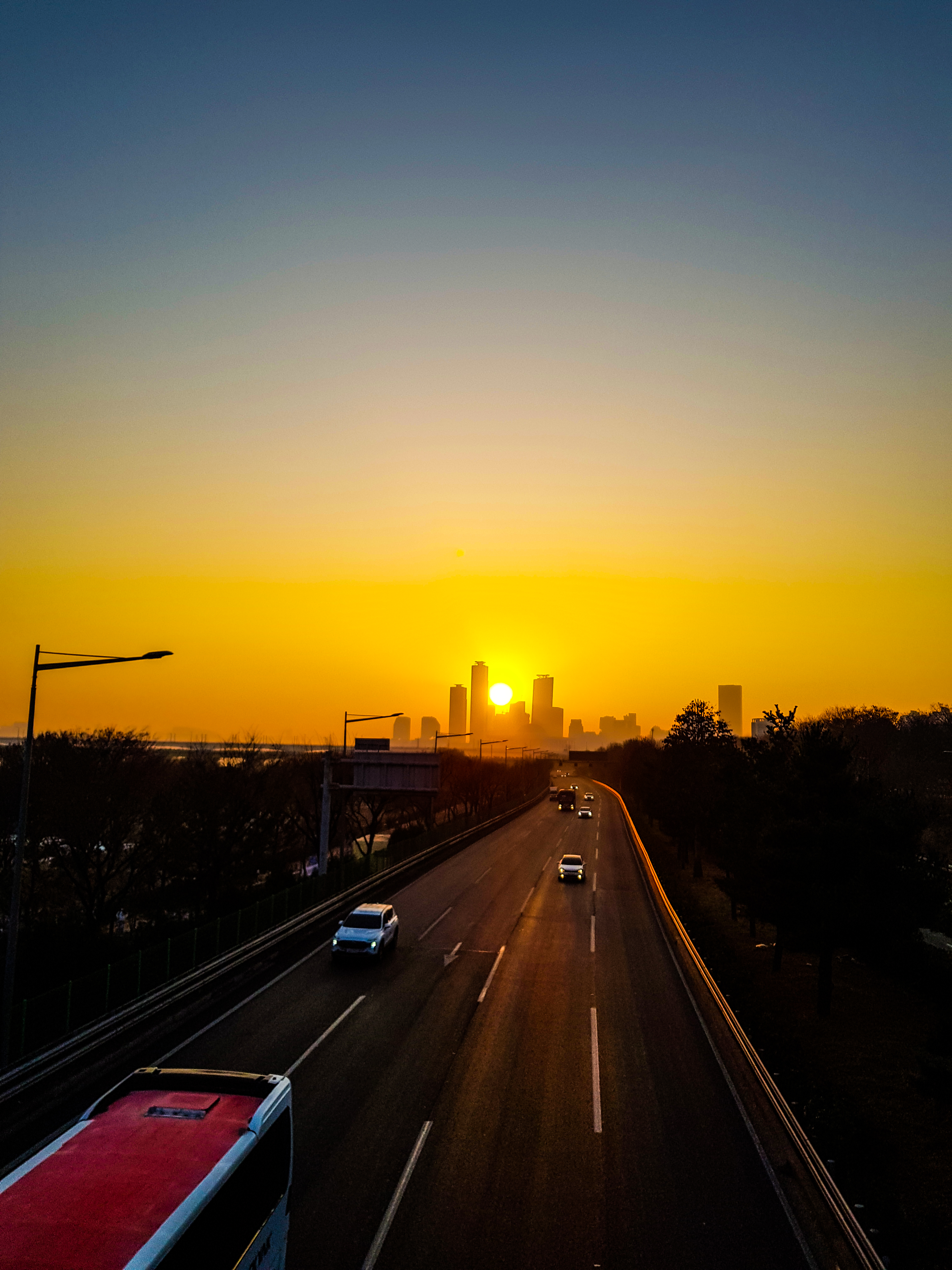 나무에 가렸지만 쌍둥이 빌딩사이로 해가보이기 시작..