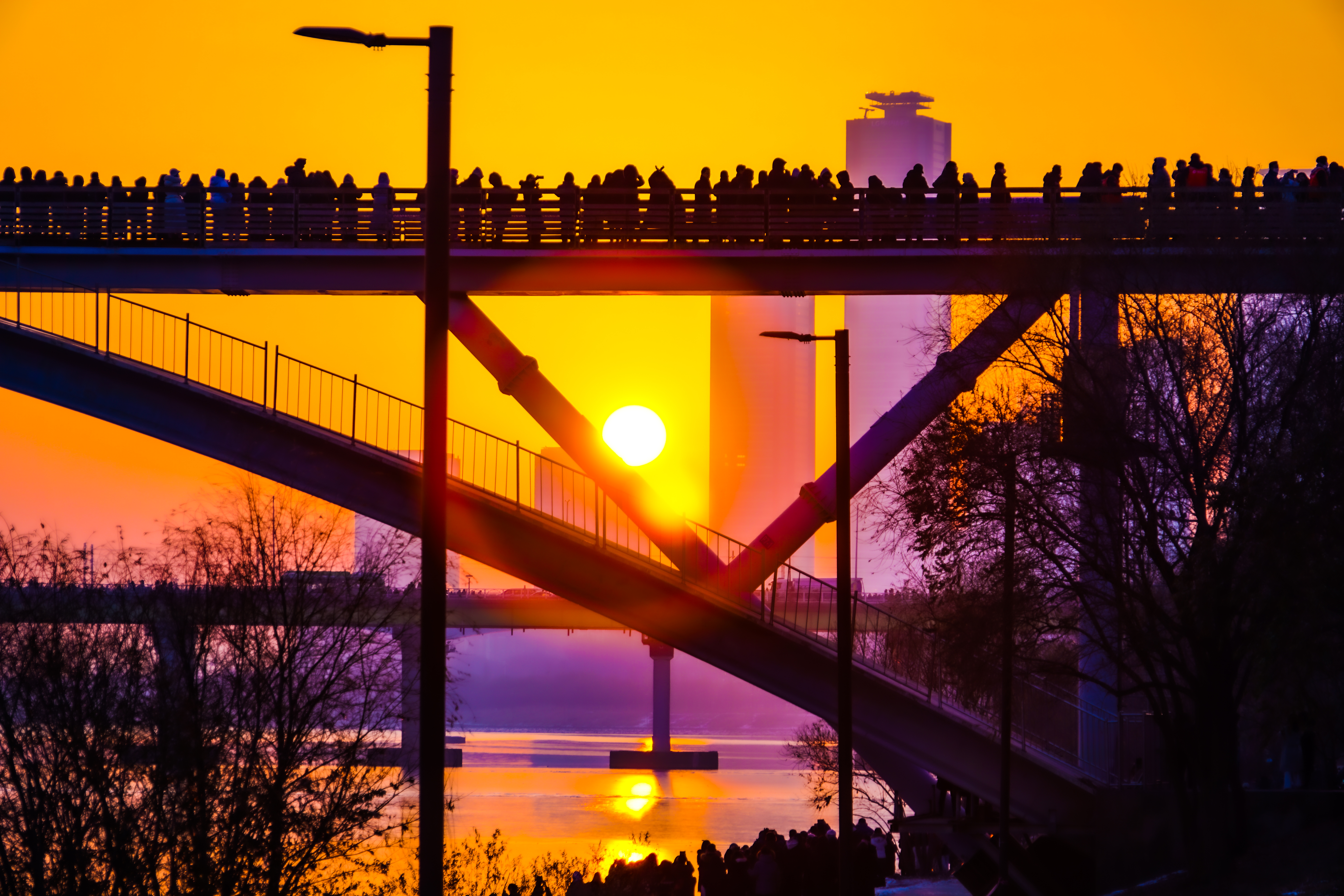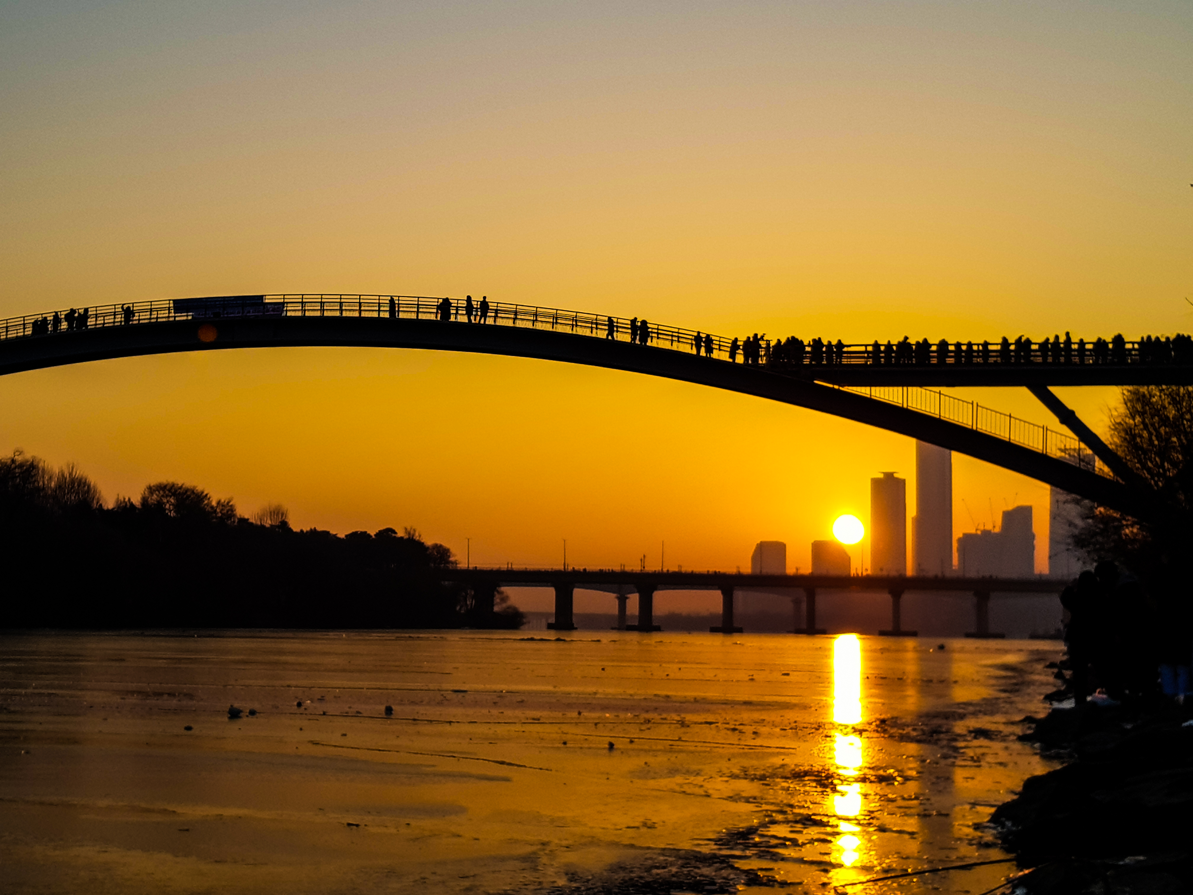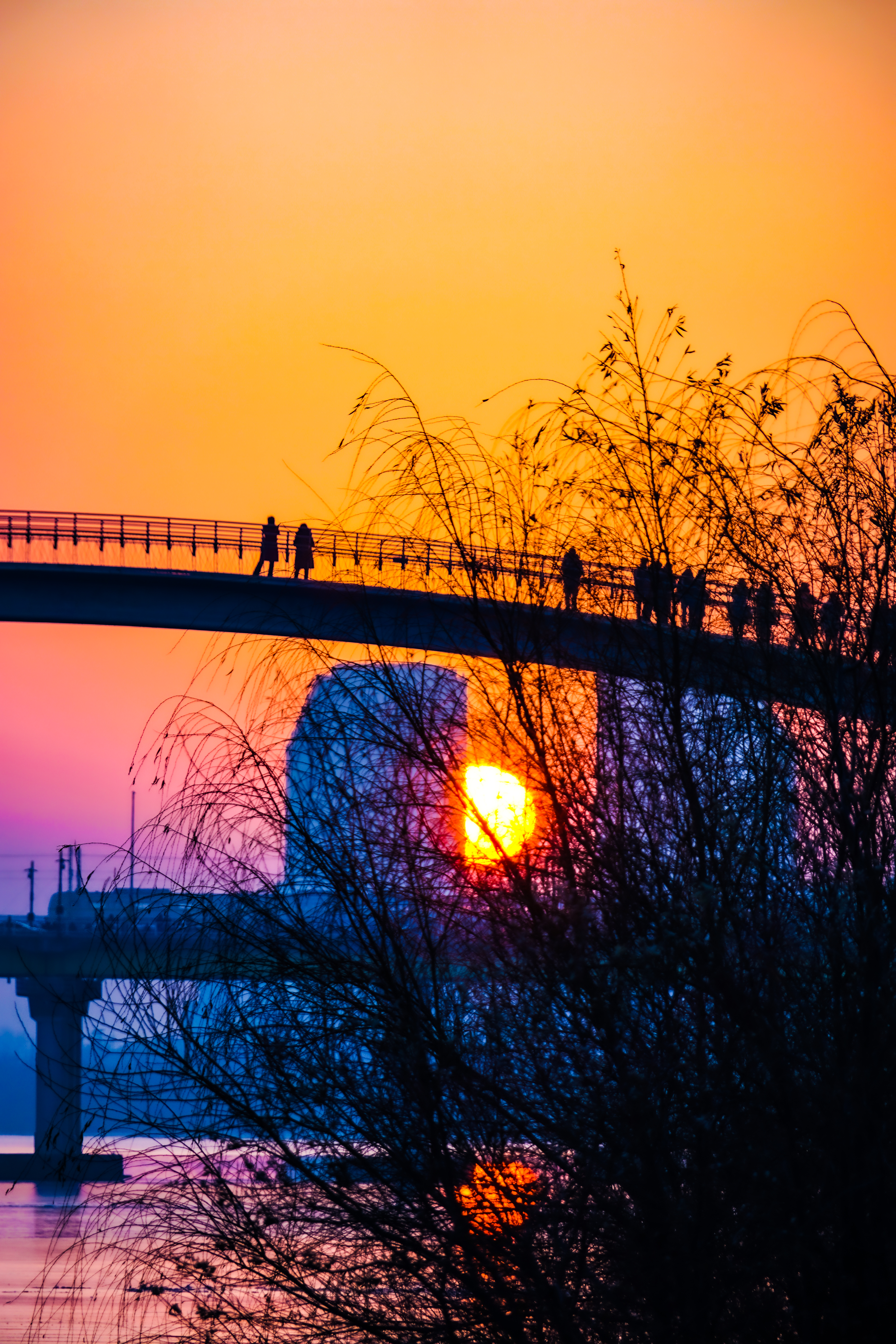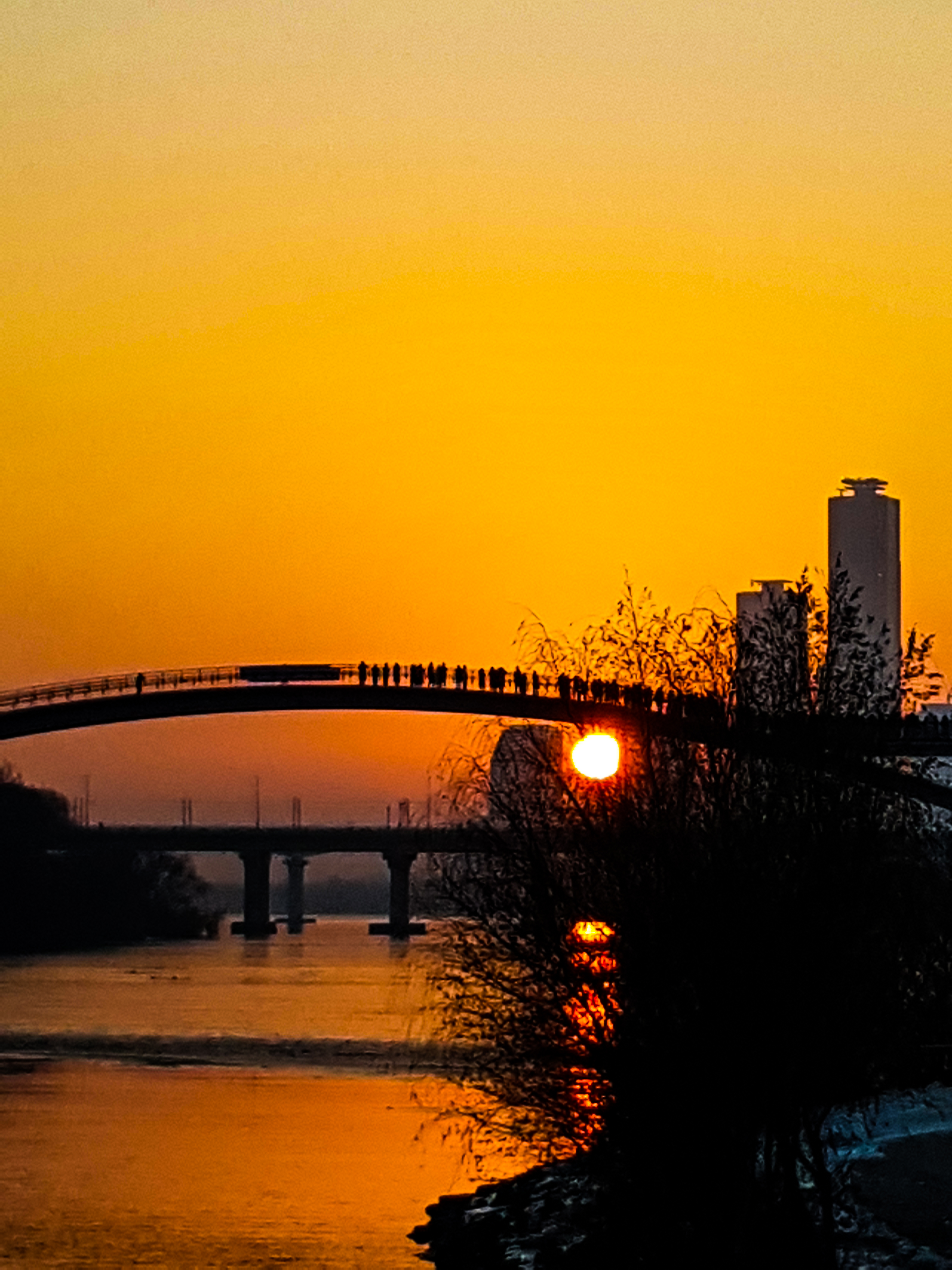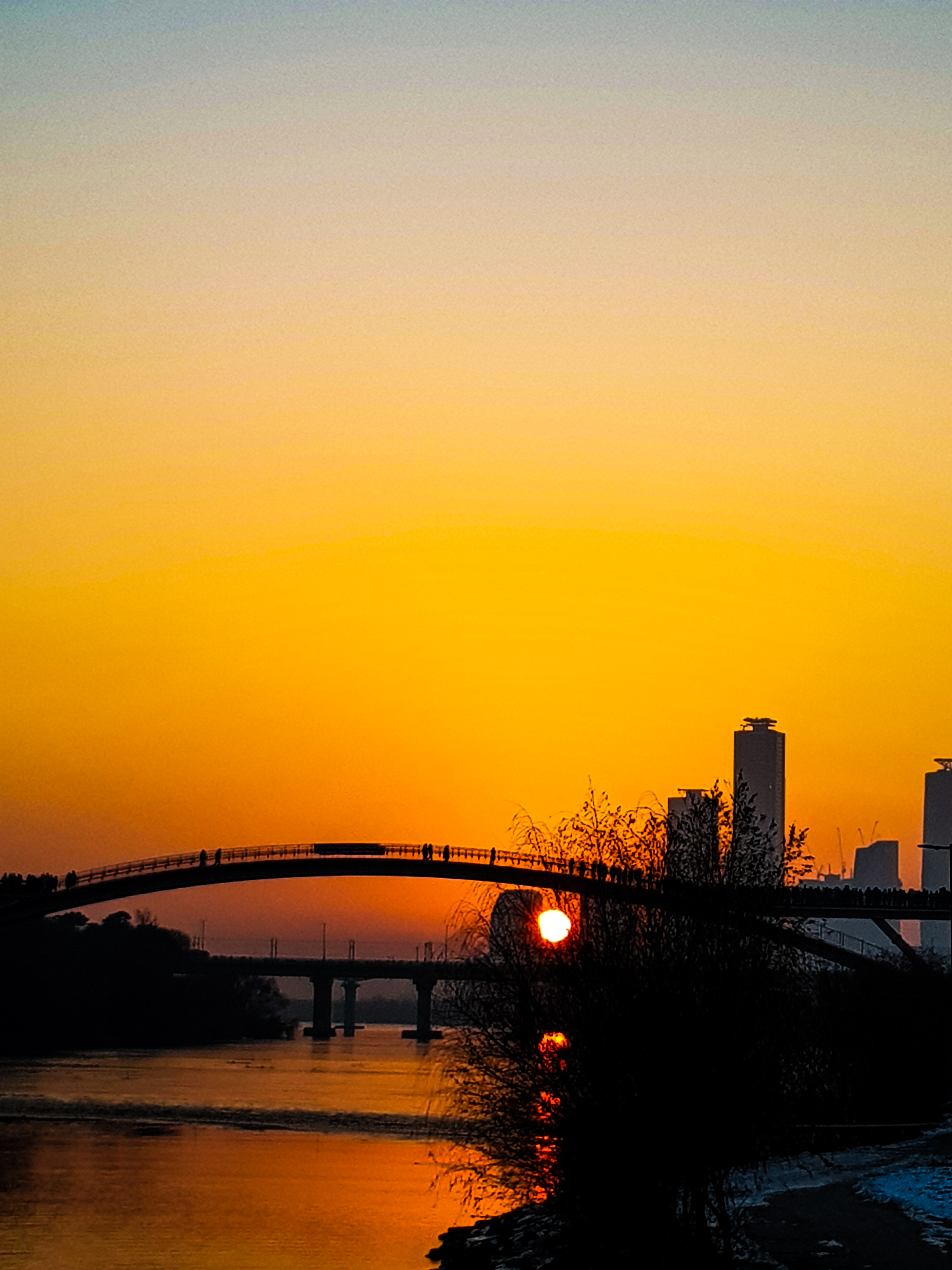 나무에 가렸지만 쌍둥이 빌딩사이로 해가보이기 시작..