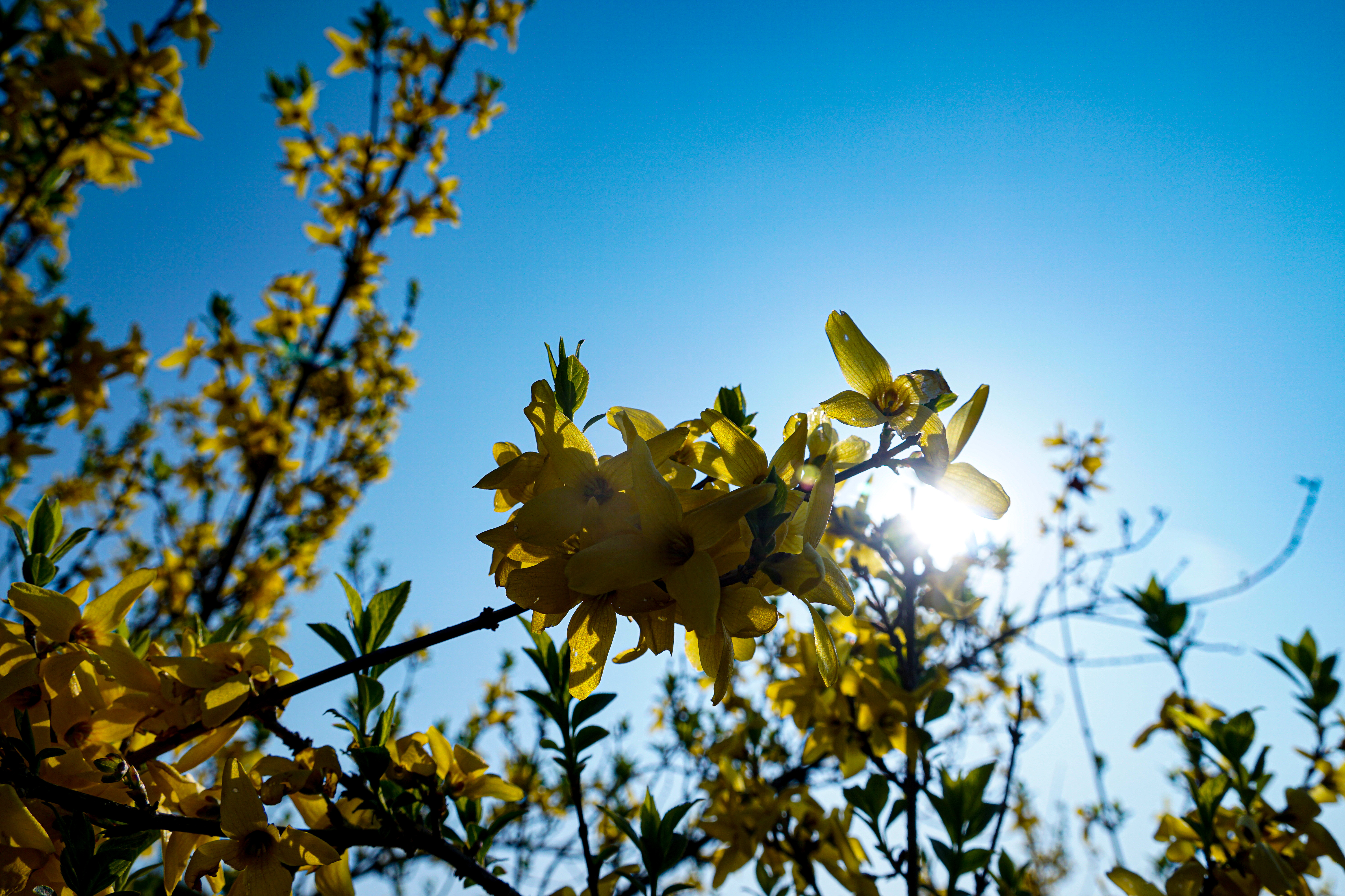 개나리 노란꽃아래로 초록잎들이 보이기 시작한다.
