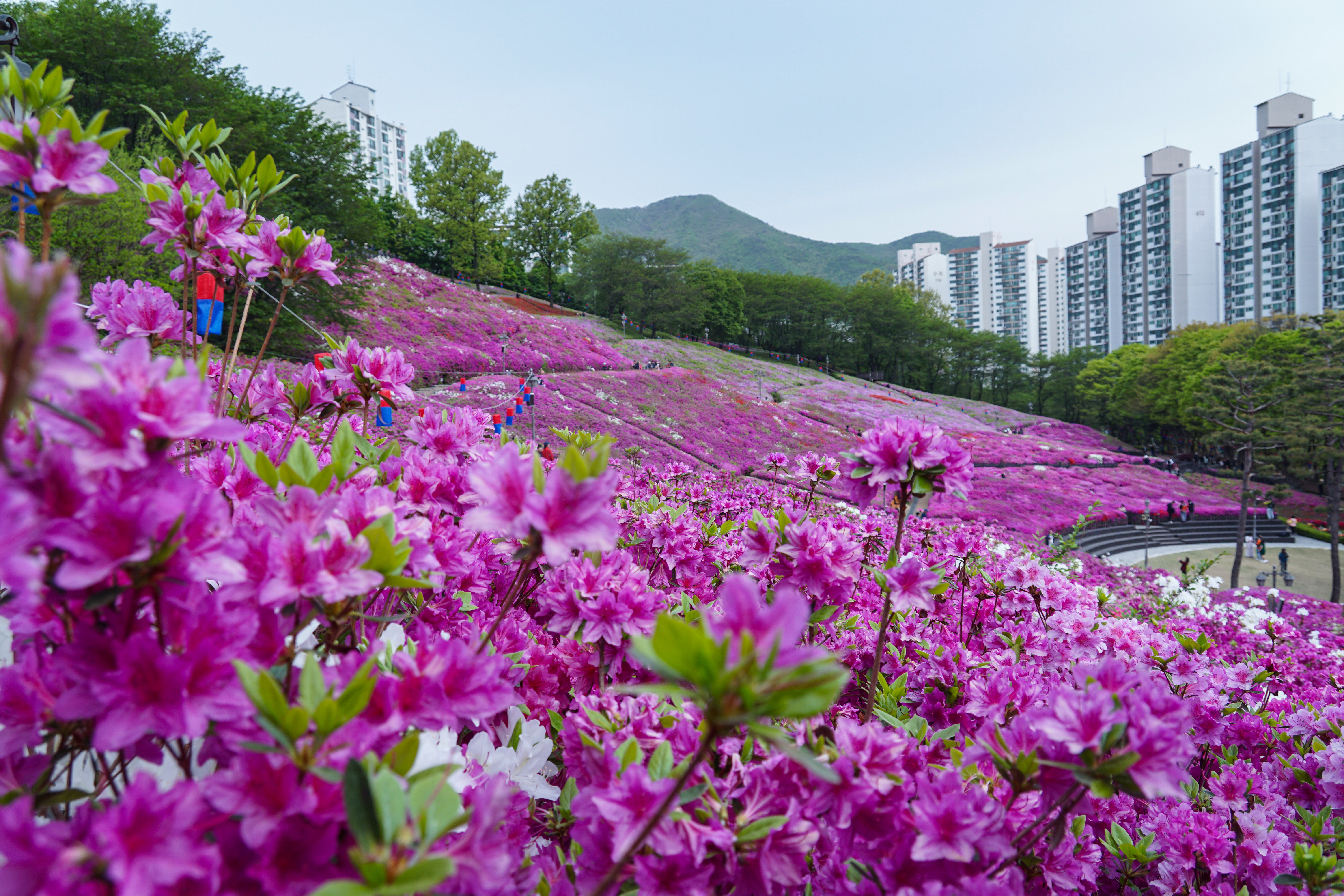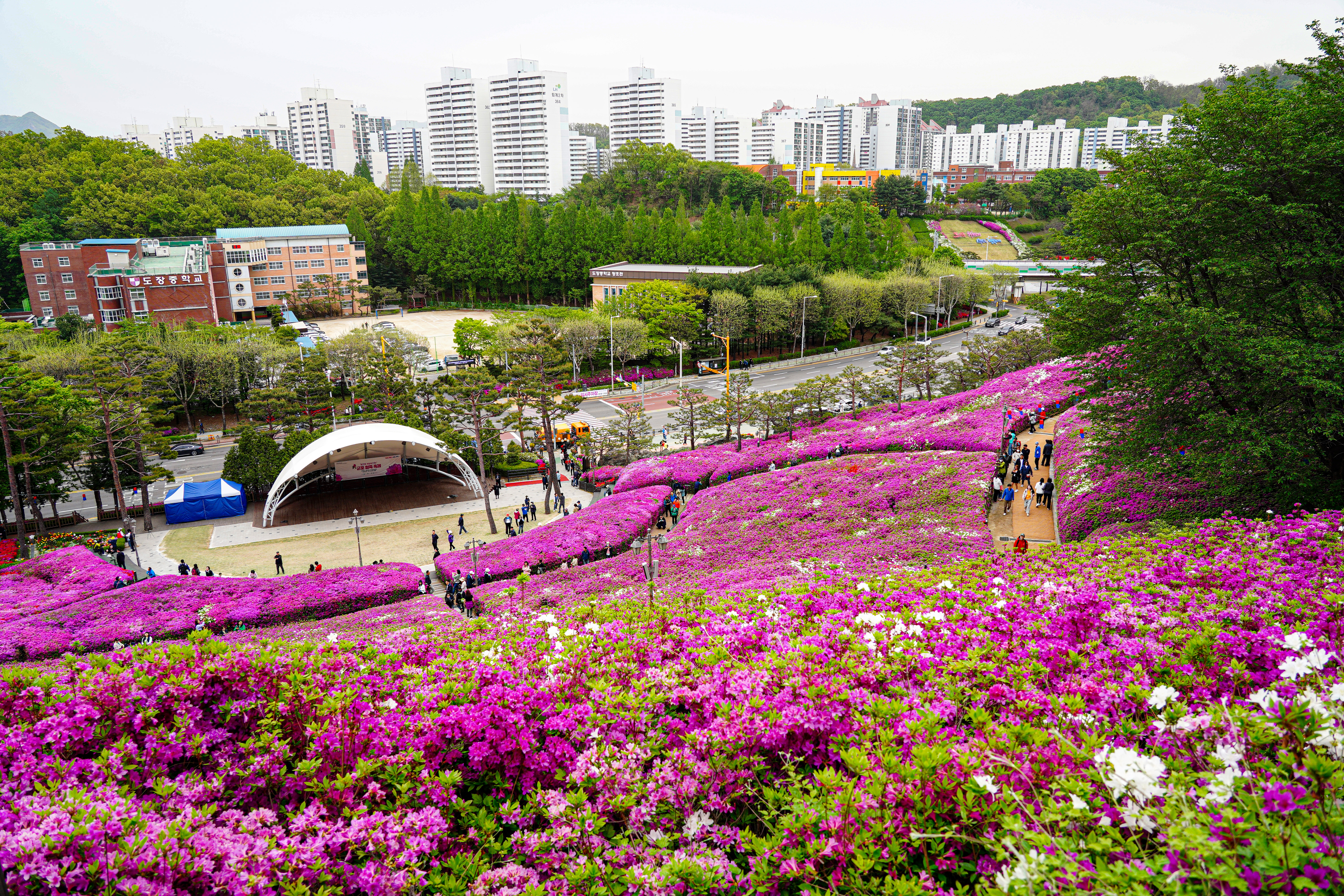 군포 철쭉동산은 경기 군포시 산본동 수리산 능선이 동쪽으로 뻗어 나온 야산에 약 20만 그루의 철쭉으로