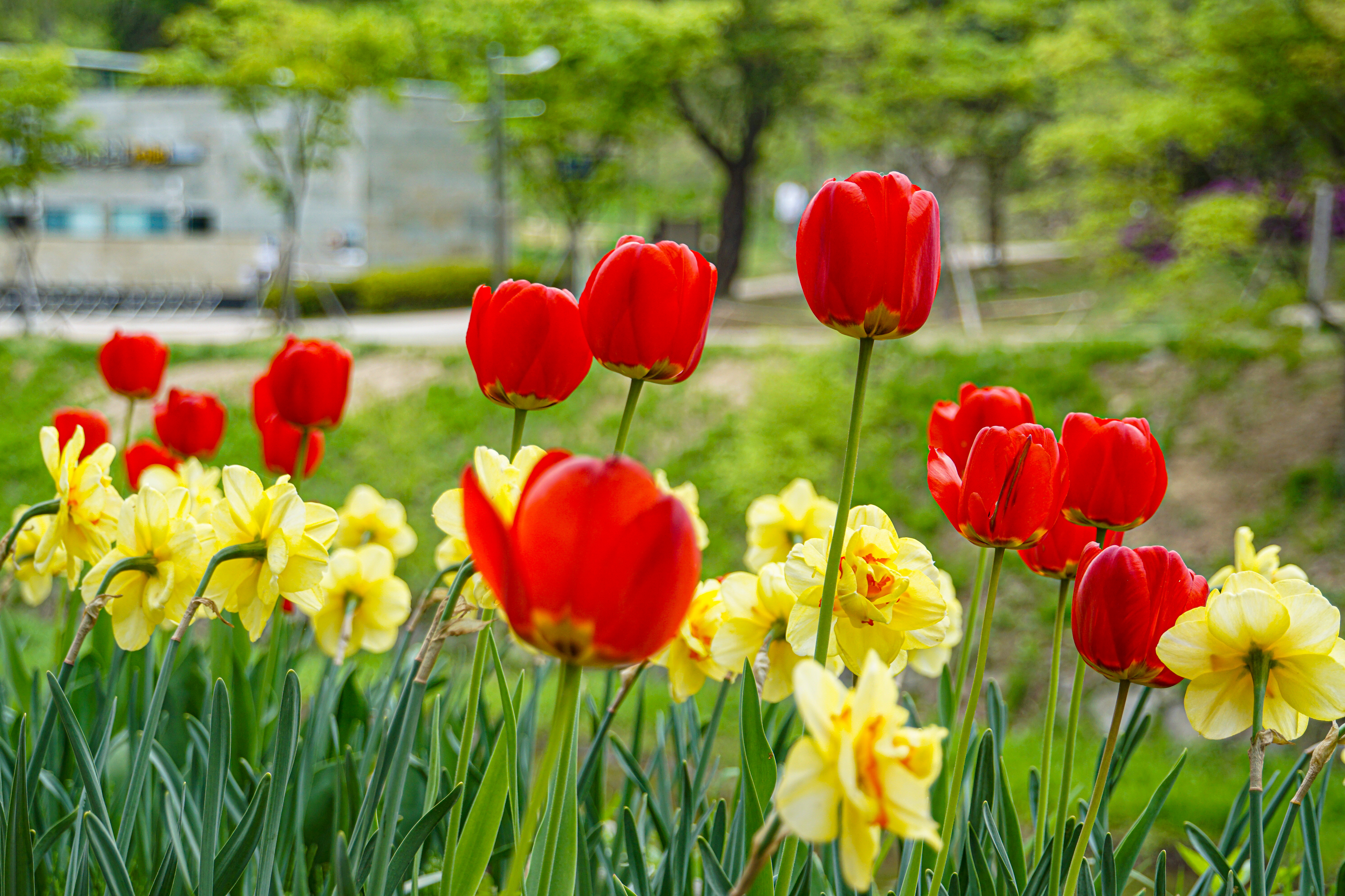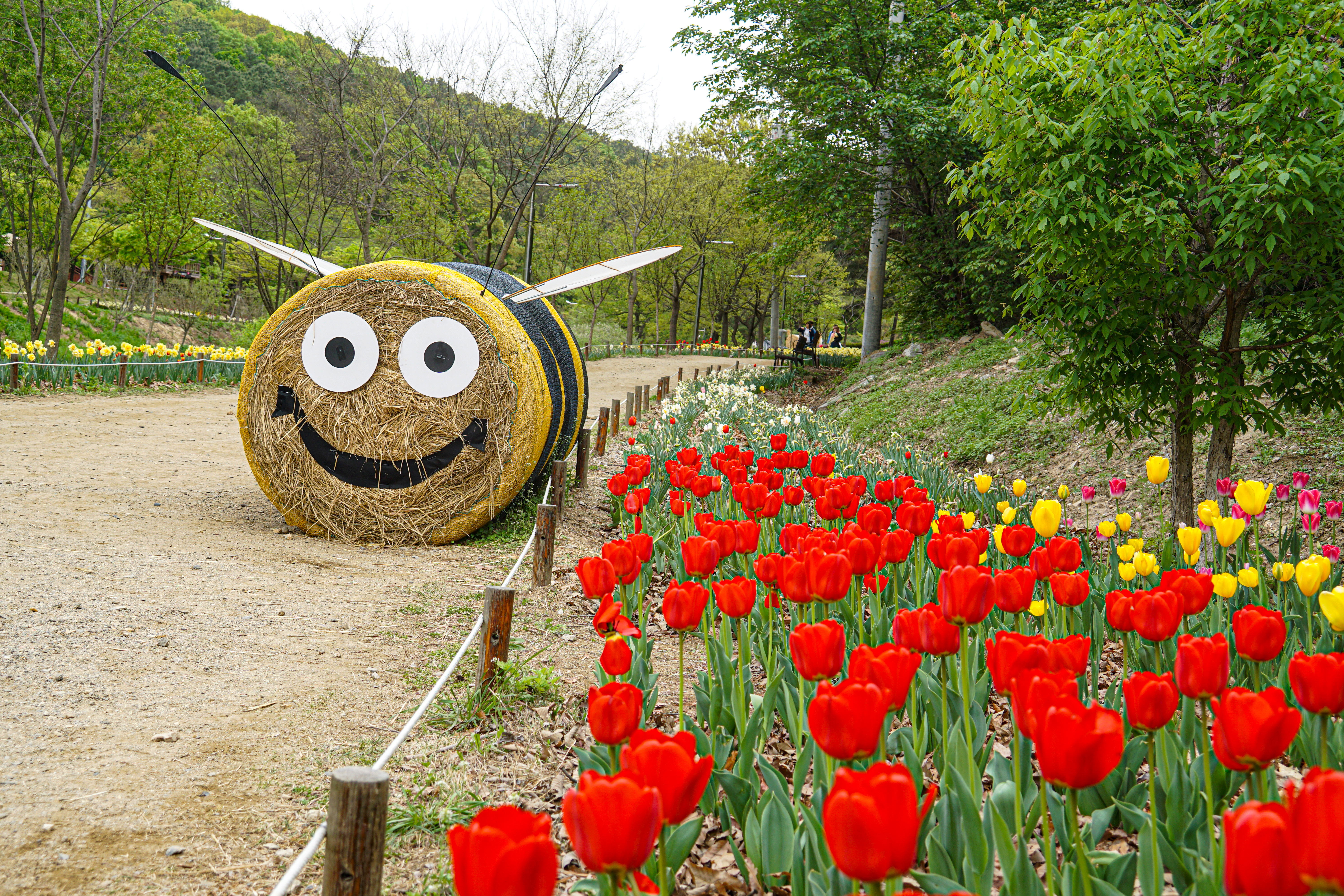 빨간 노란 튤립이 심어저 있는 꽃밭길과 꿀벌모양의 조형물.