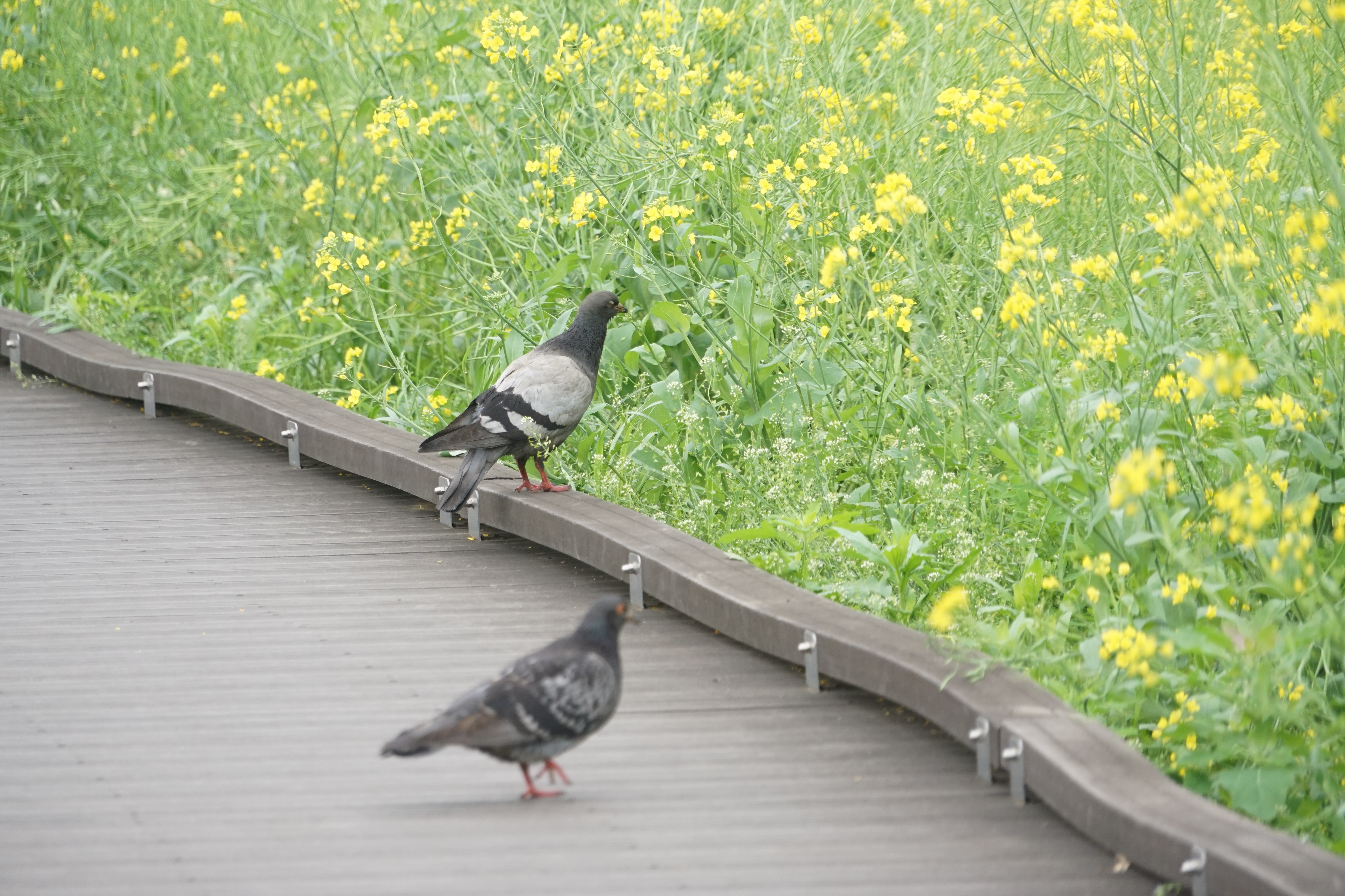 비둘기들이 유채꽃 먹는 모습.
