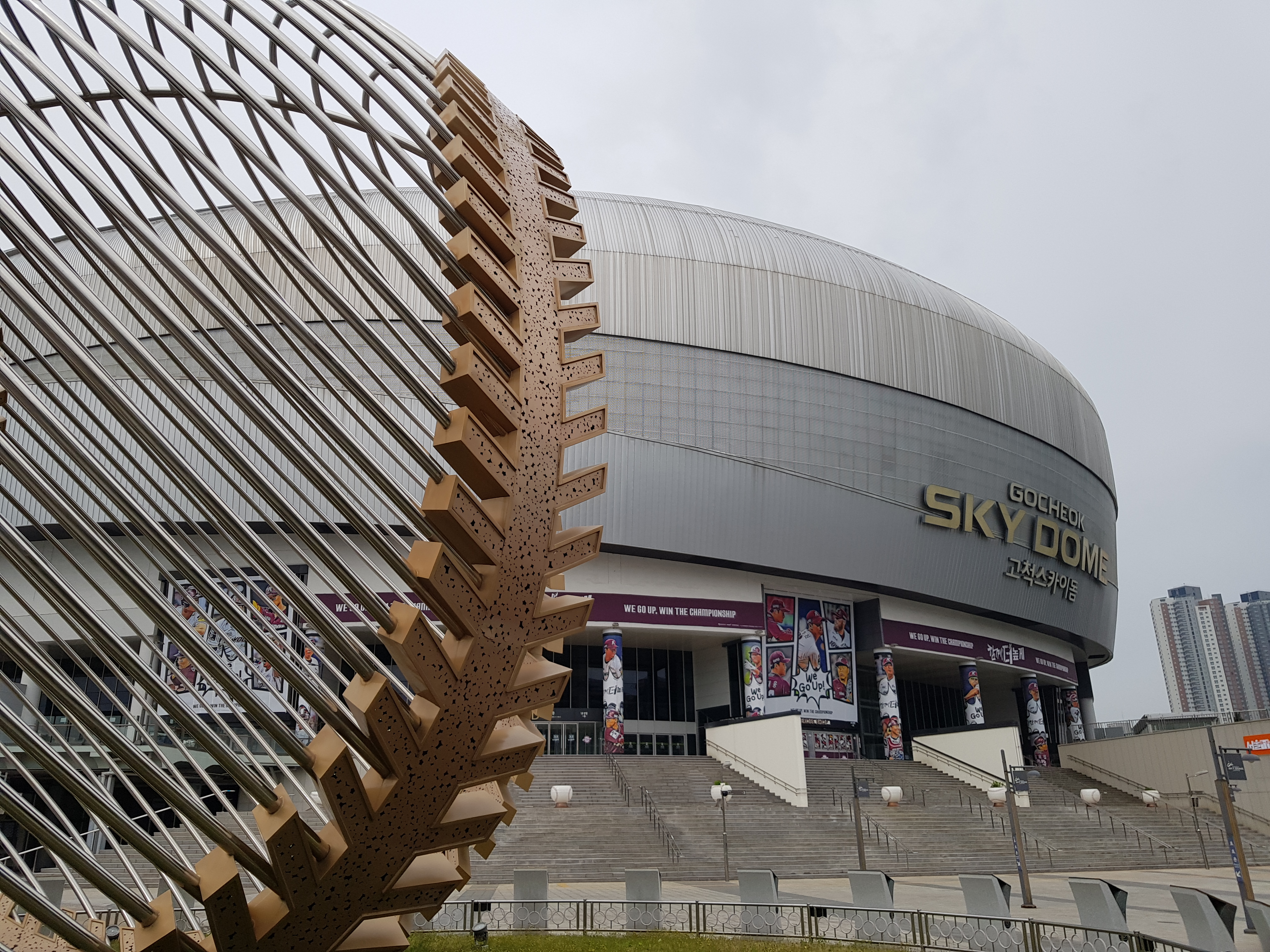 국내 최초이자 유일의 돔구장인 고척스카이돔과 야국공모양의 조형물.