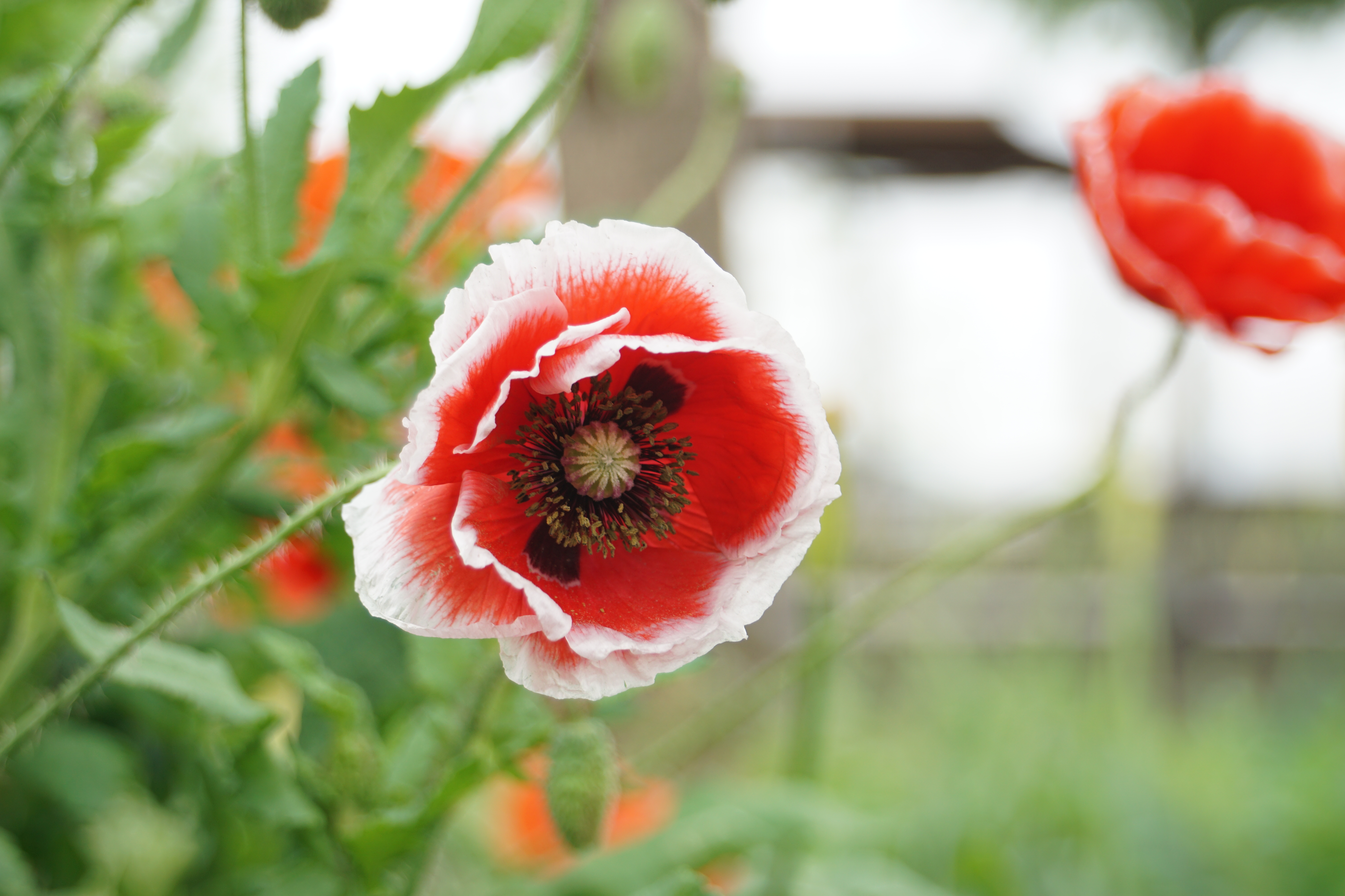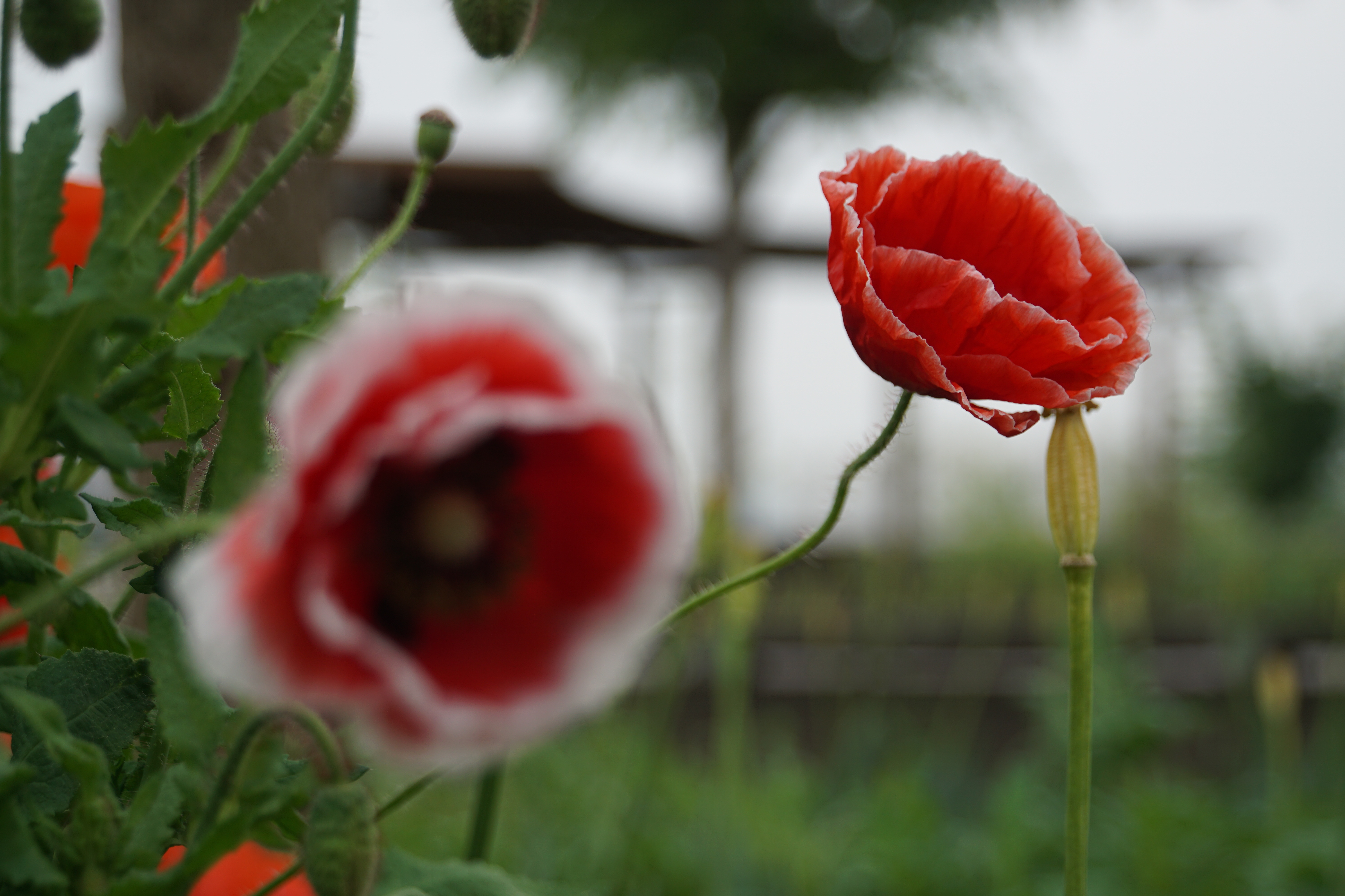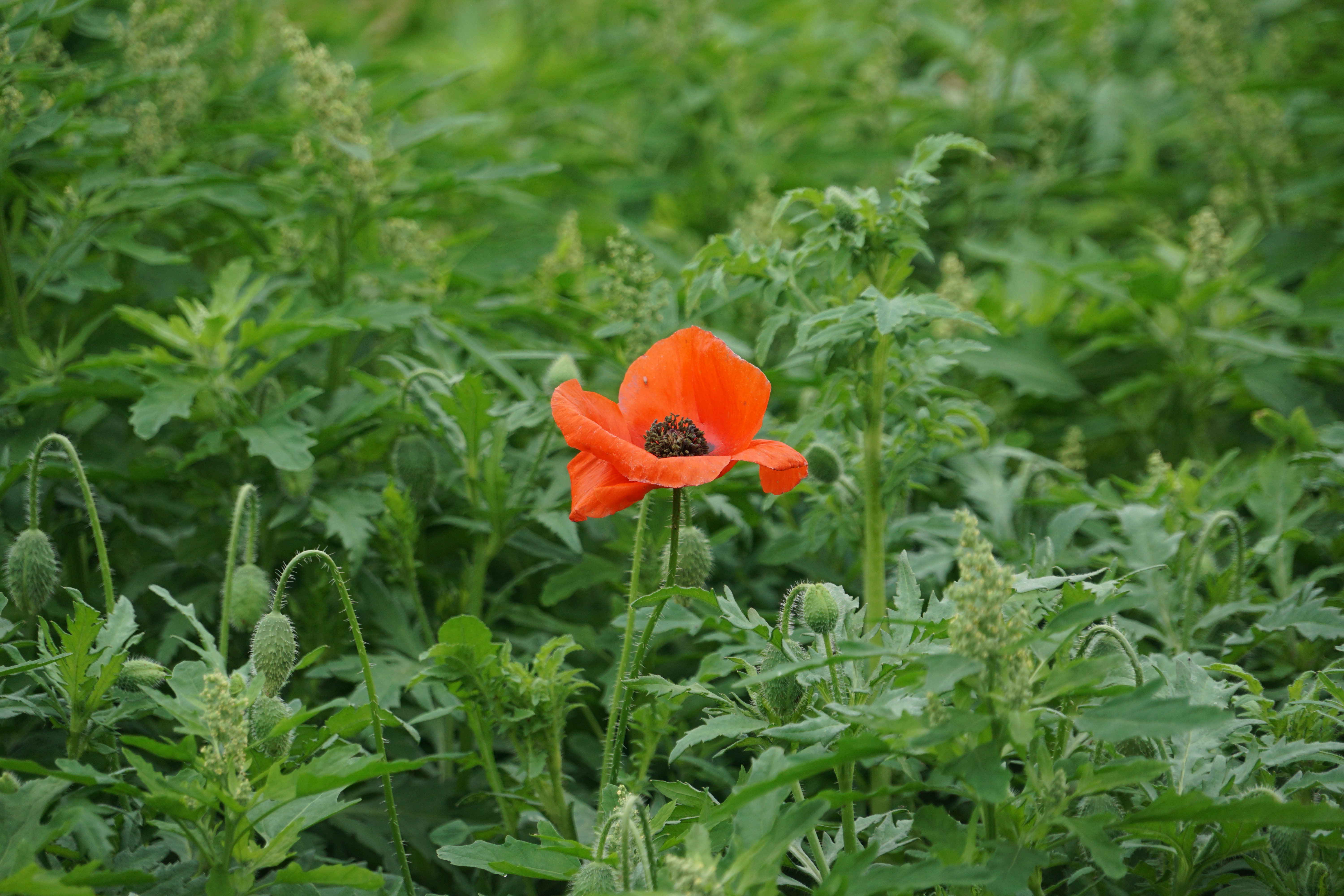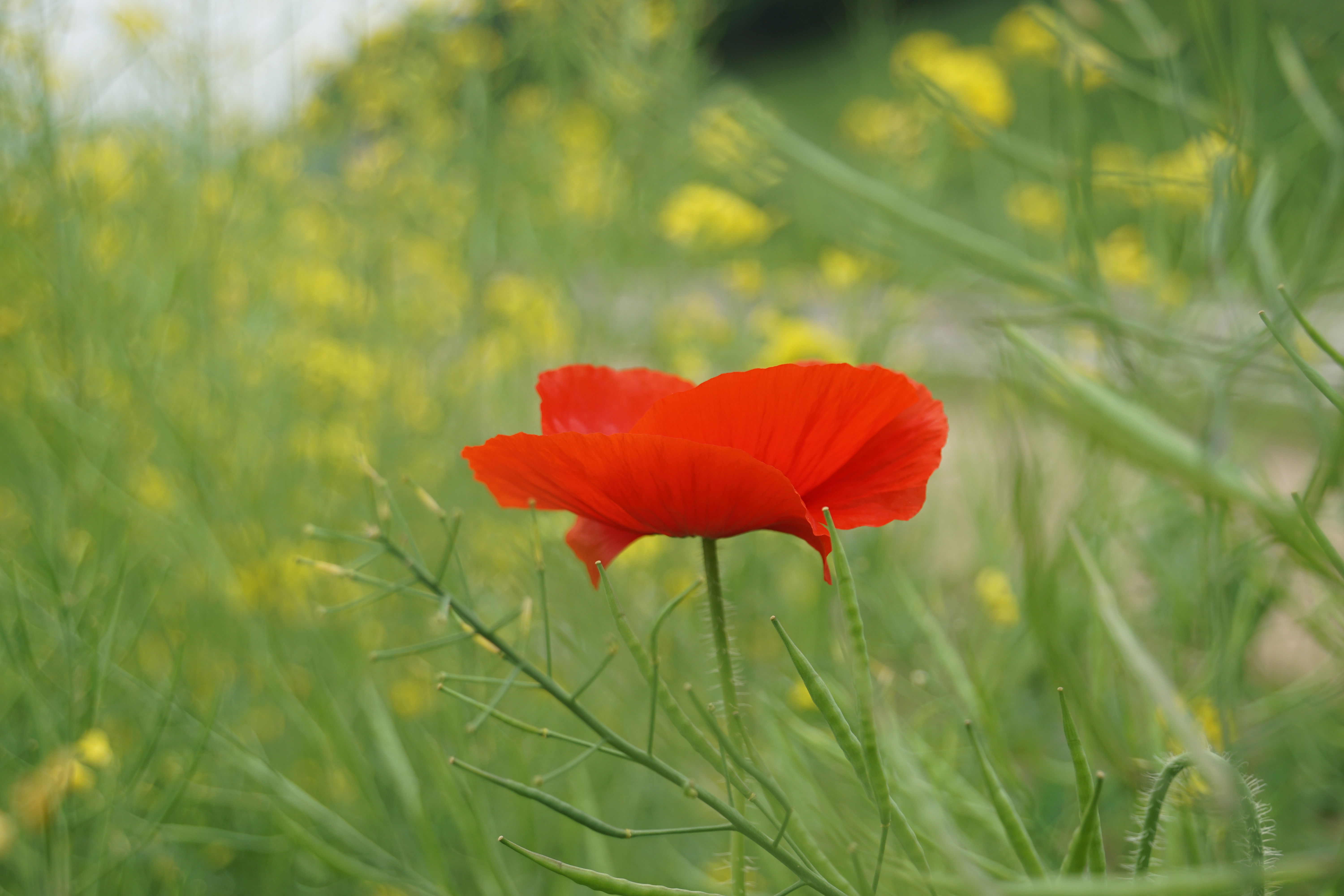 유채꽃밭사이에 피어있는 양귀비꽃.