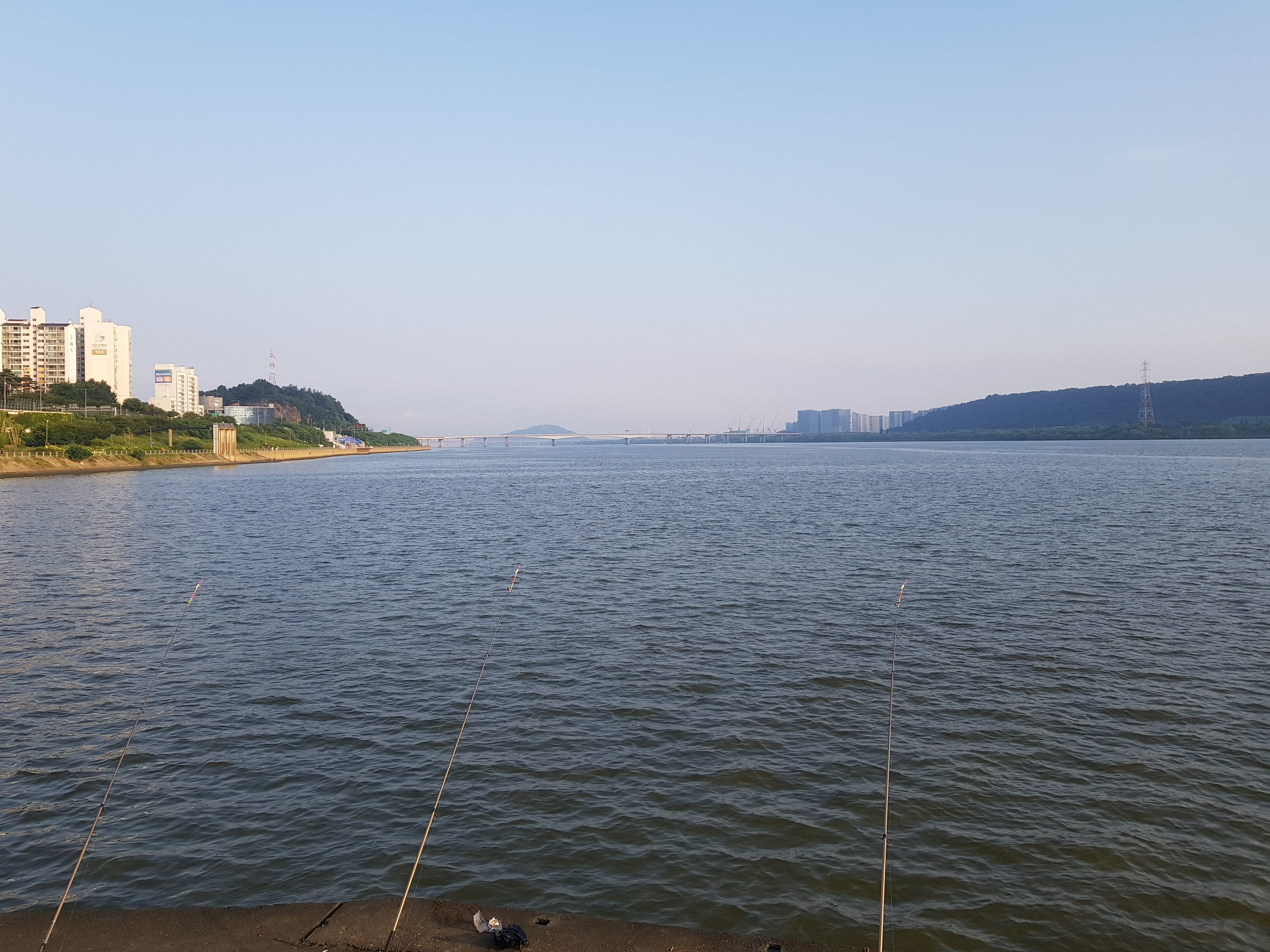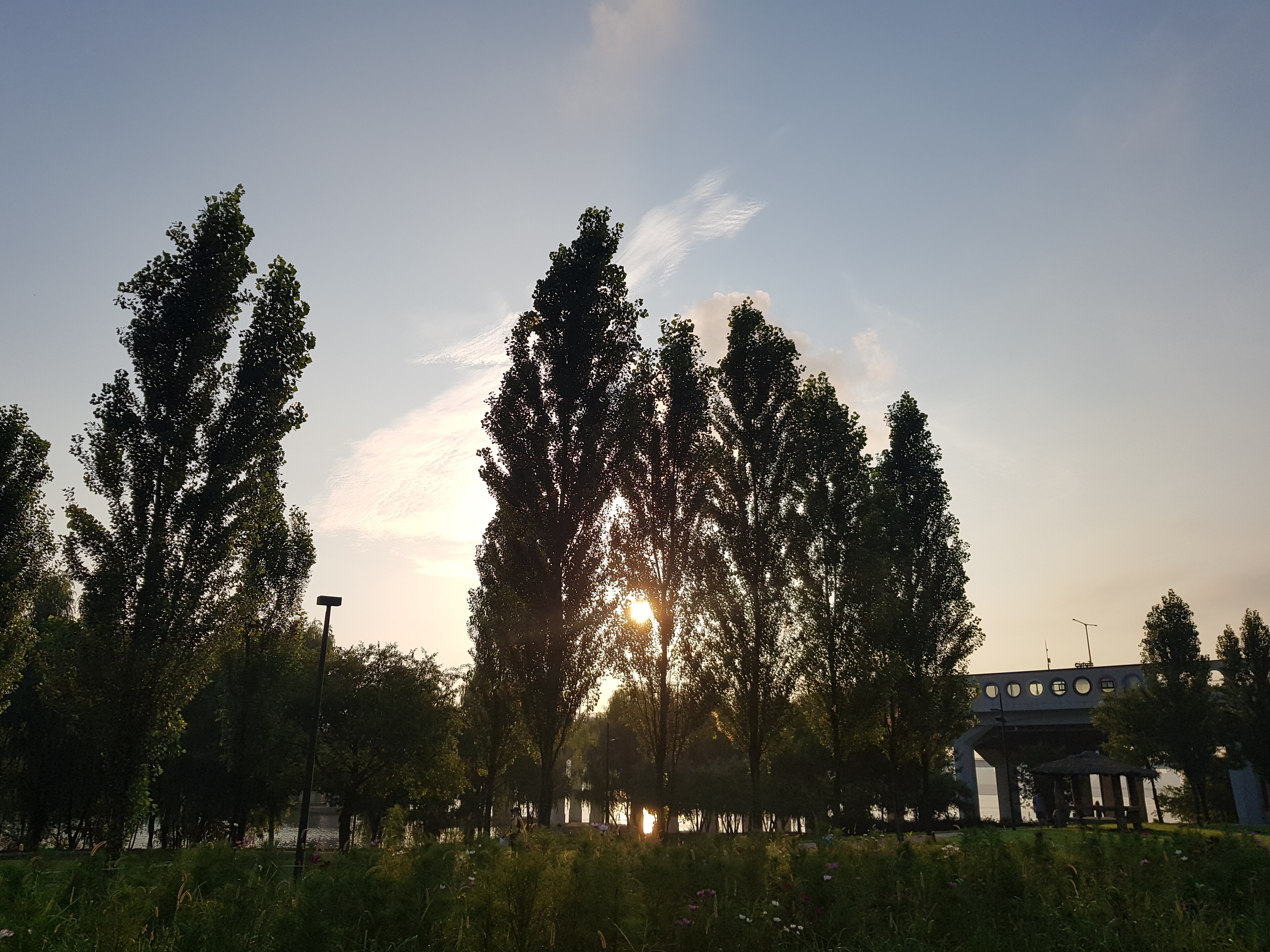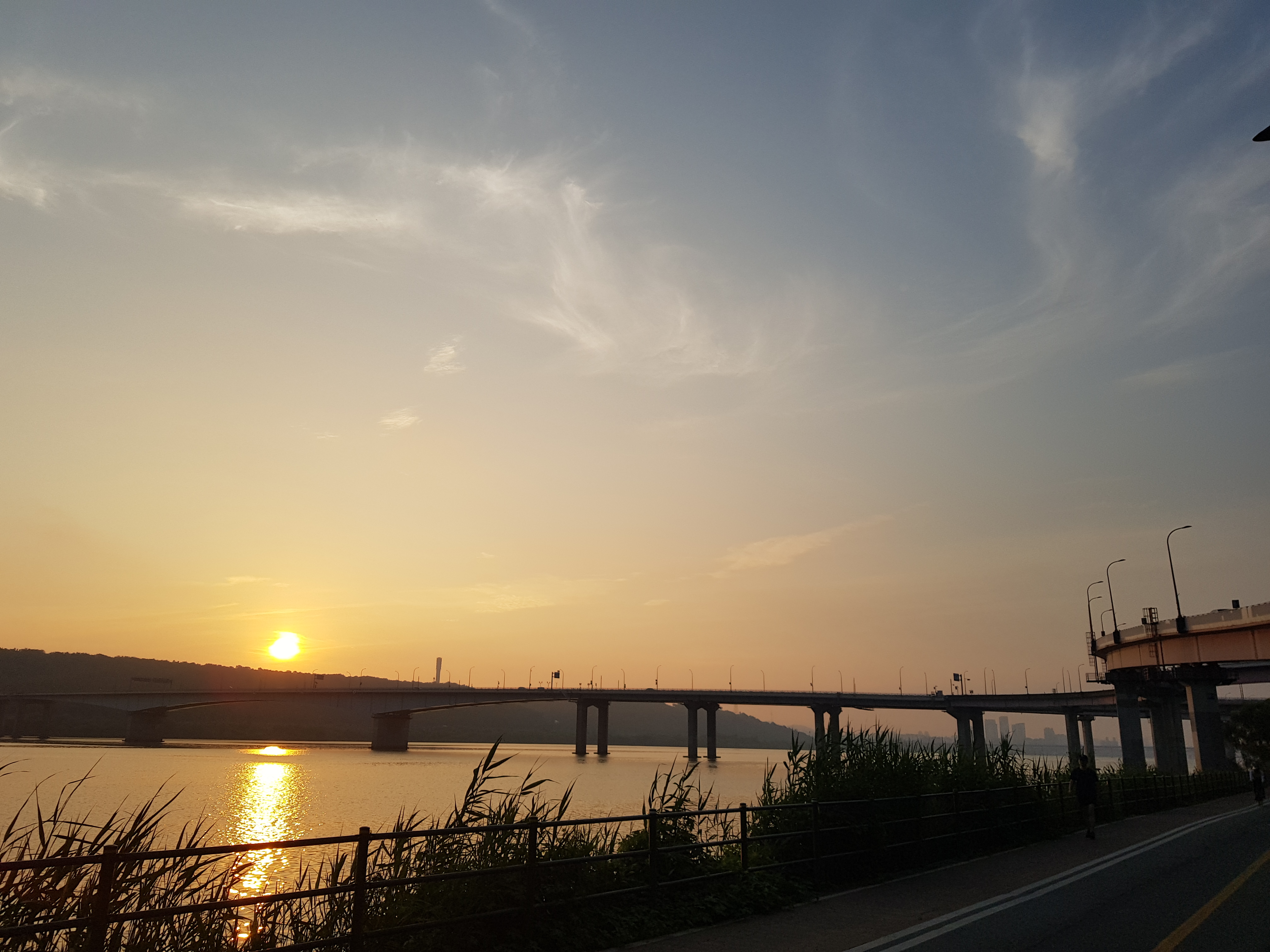 낮의 폭염을 피해 이른아침 한강도착하니 하늘공원쪽에서 해가 떠오르고있다.