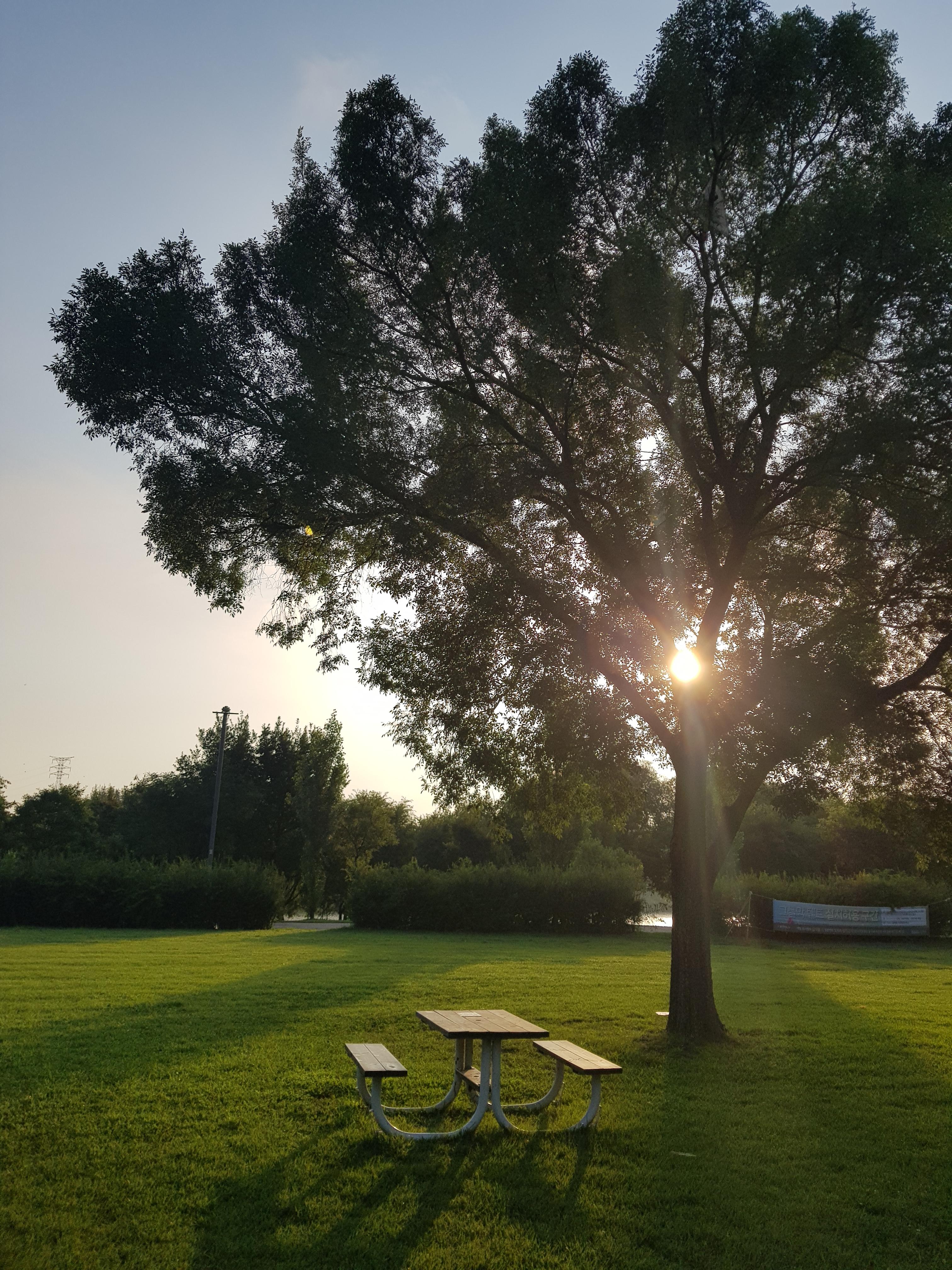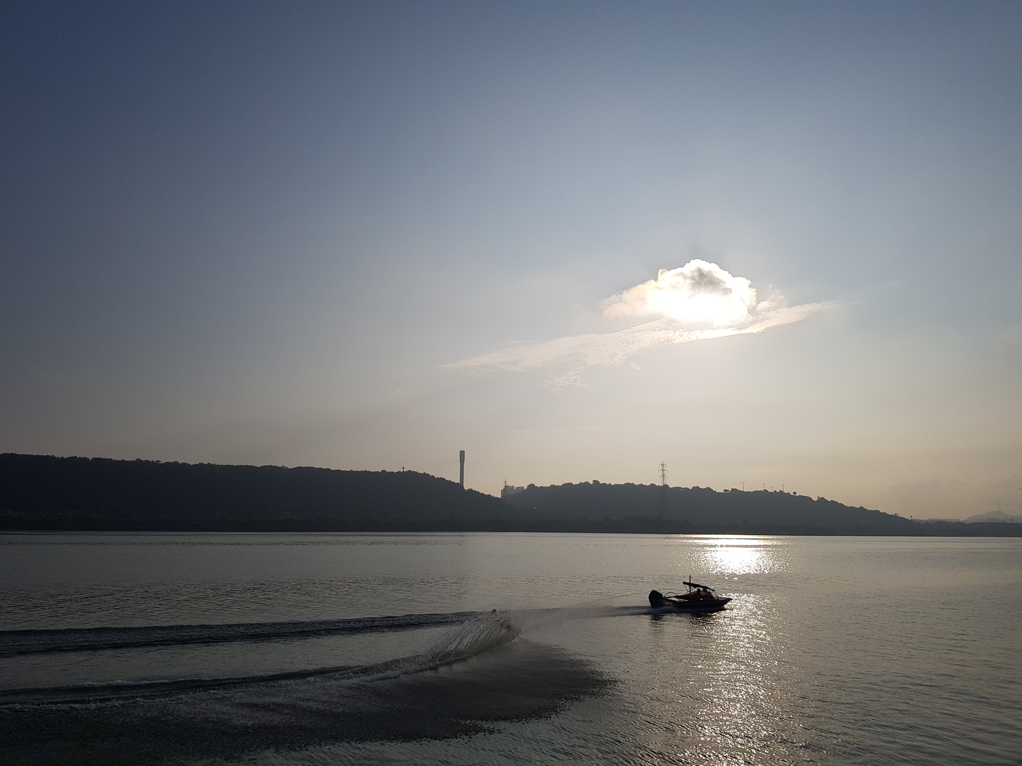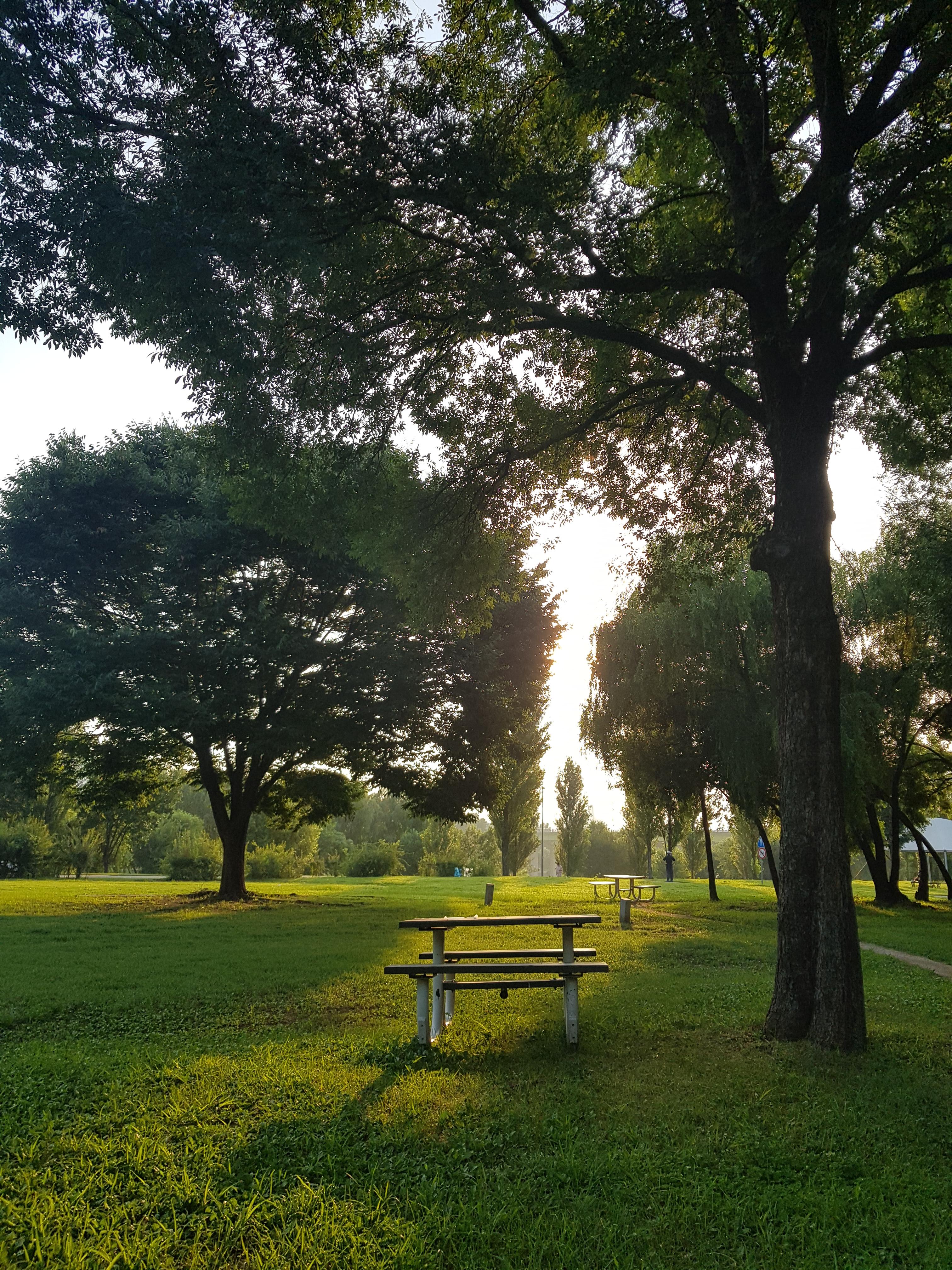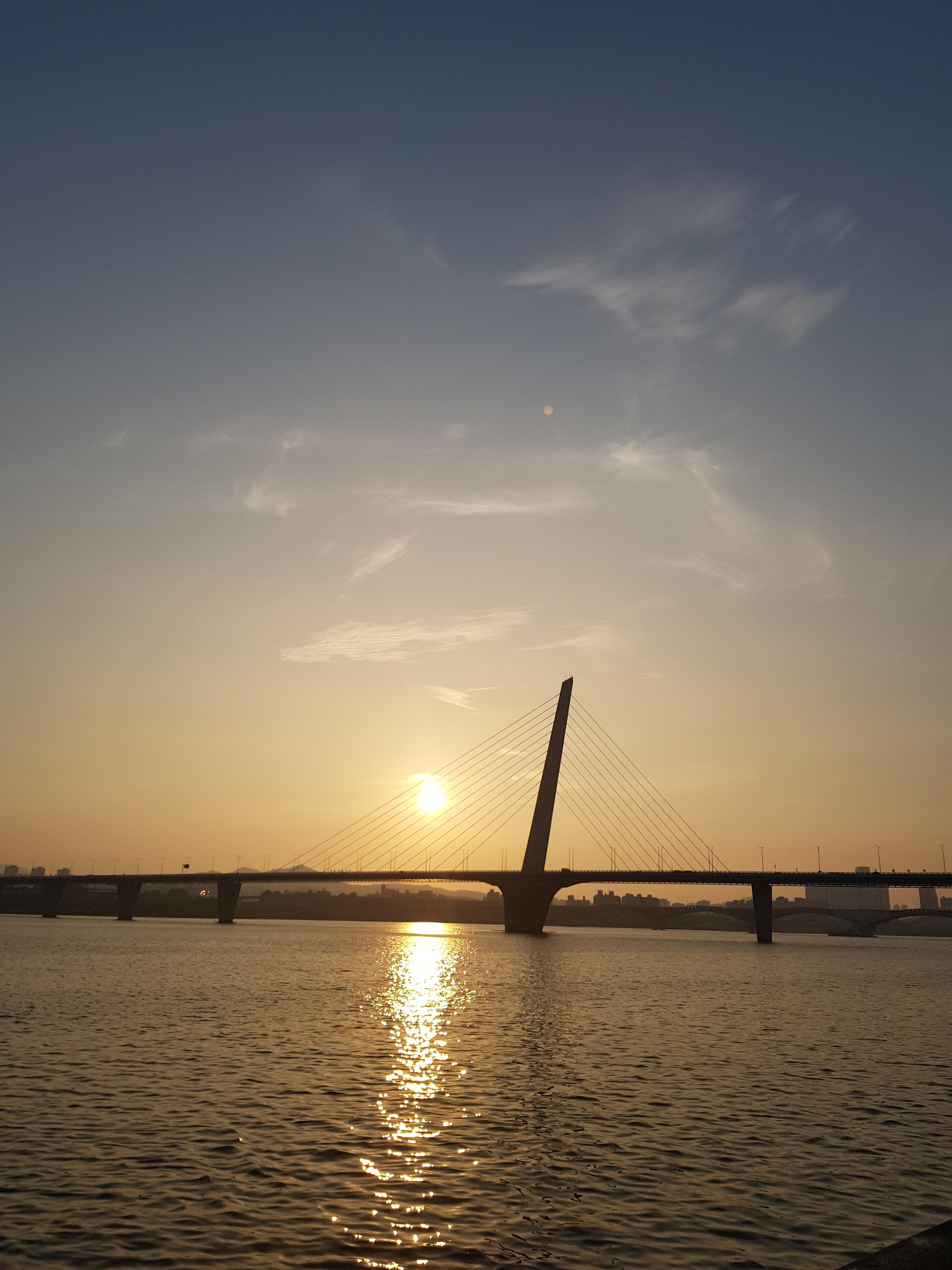 낮의 폭염을 피해 이른아침 한강도착하니 하늘공원쪽에서 해가 떠오르고있다.